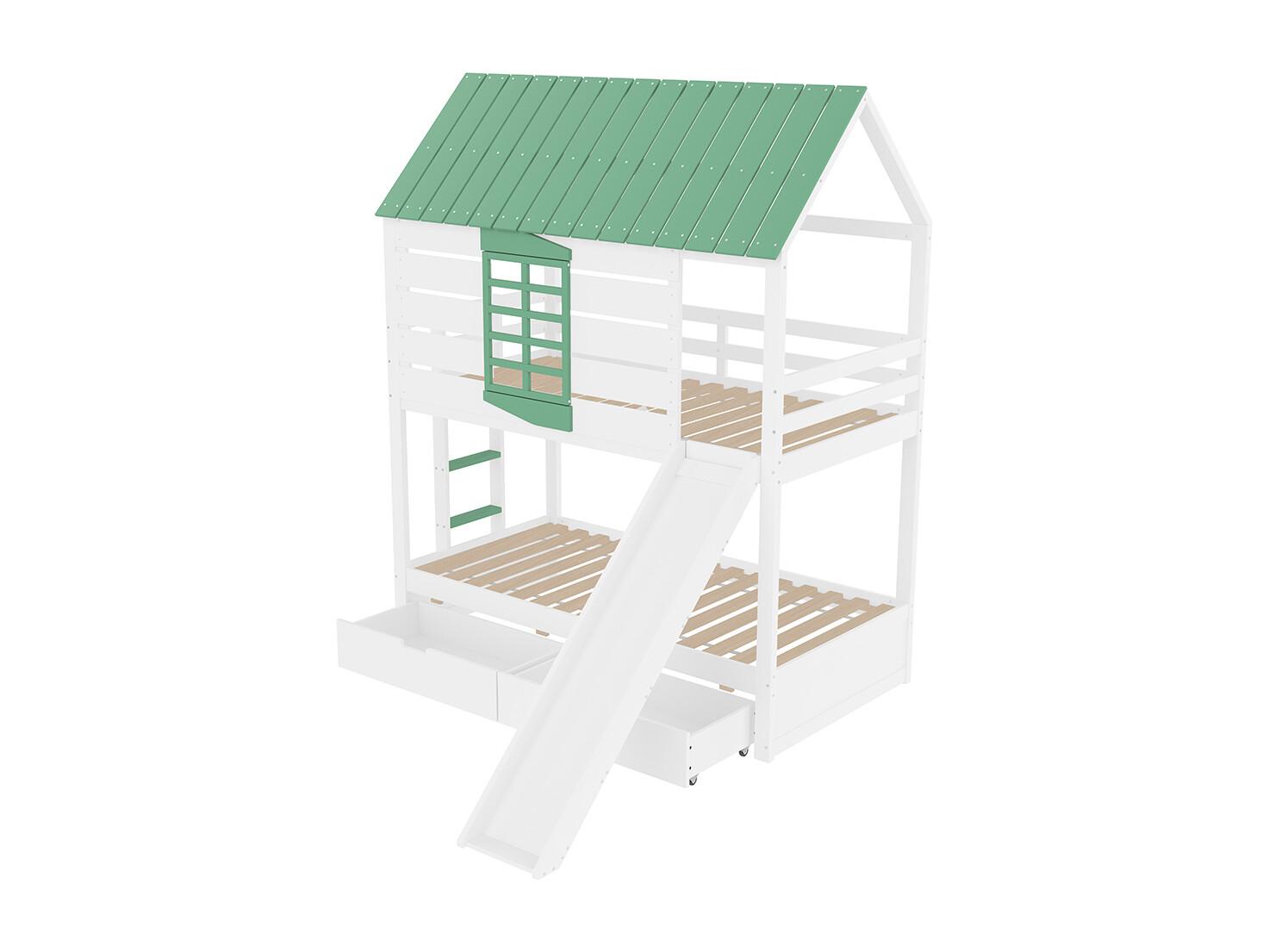 Lit superposé maison 90x200 toboggan 2 tiroirs blanc vert