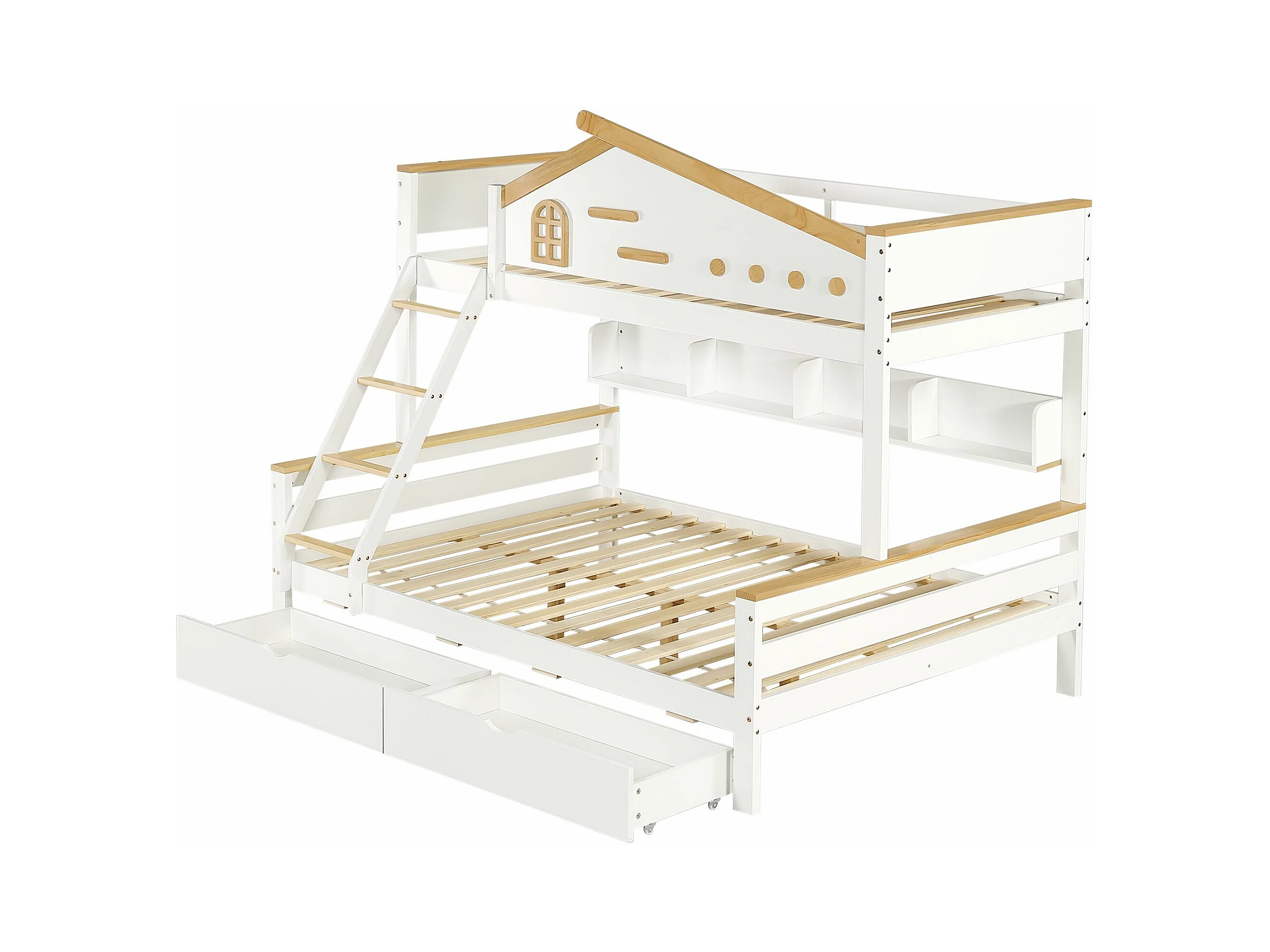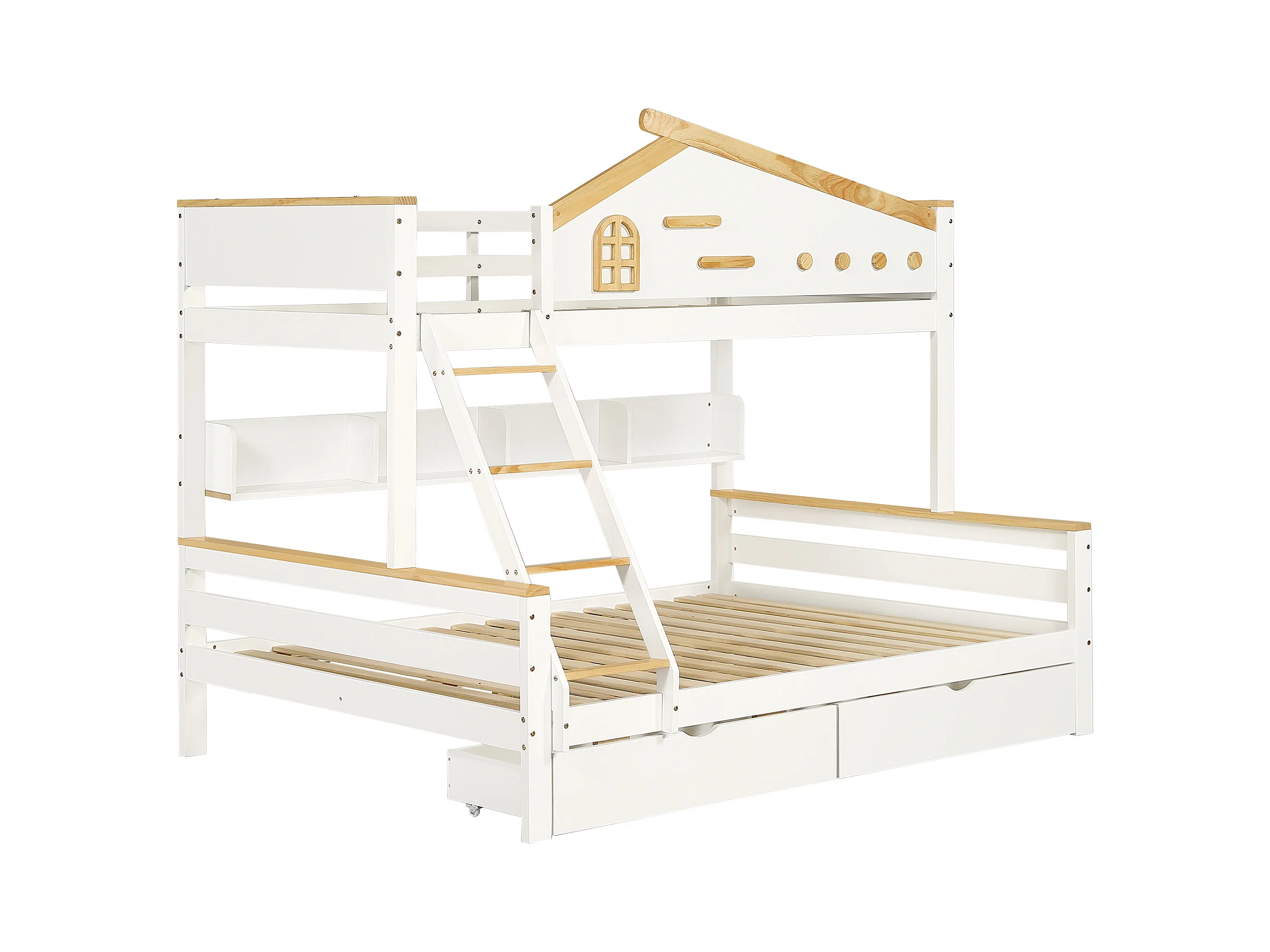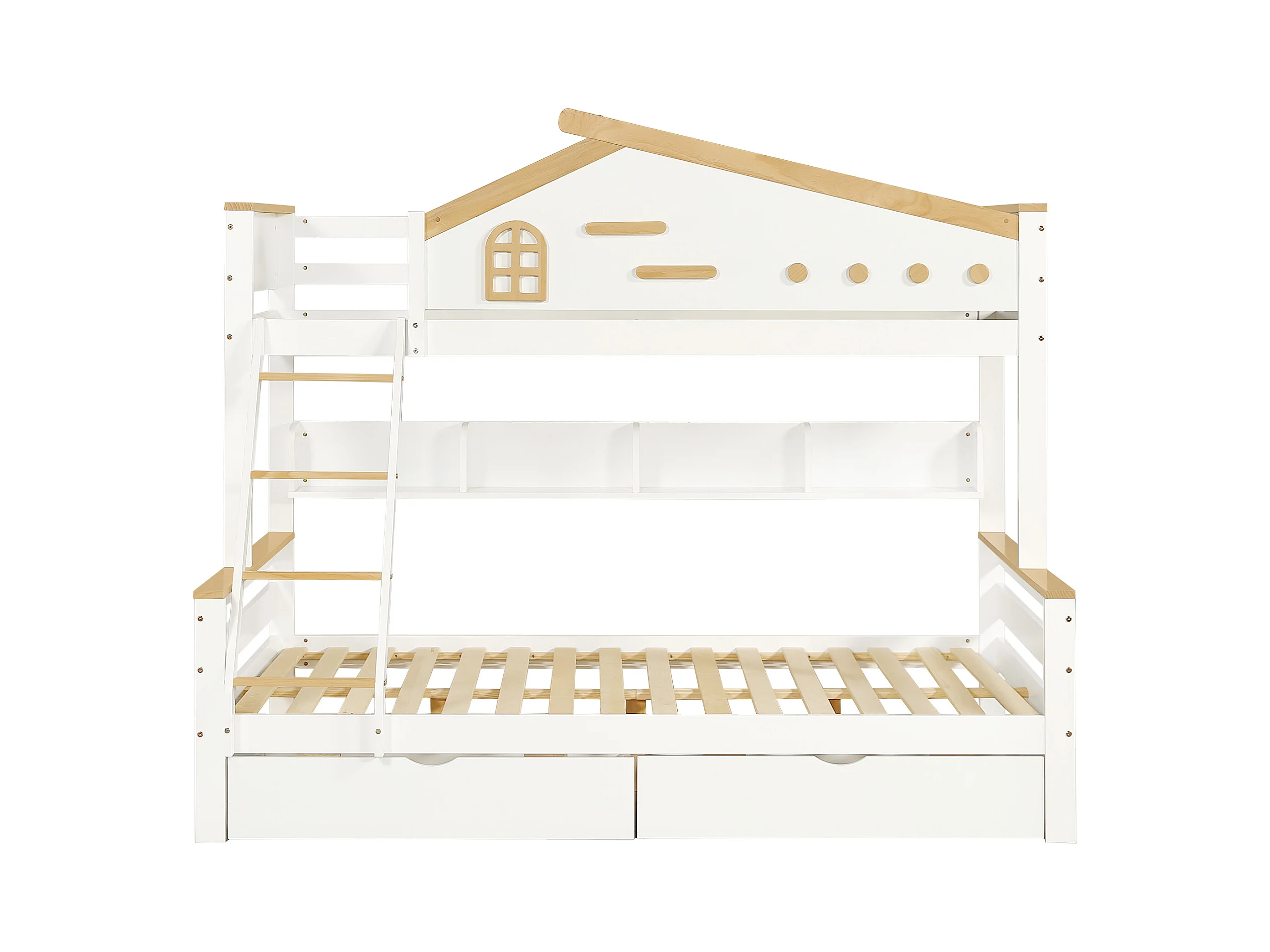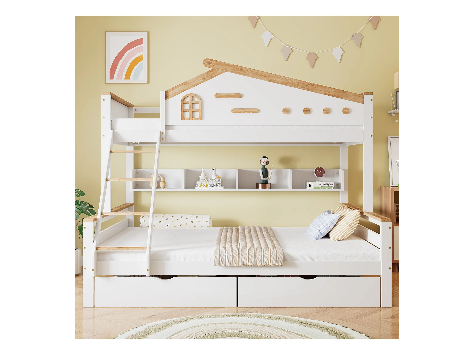 Lit superposé pour enfants 90x200cm & 140x200cm , avec garde-corps, tiroirs, fenêtre, et tiroirs, blanc + couleurs naturelles