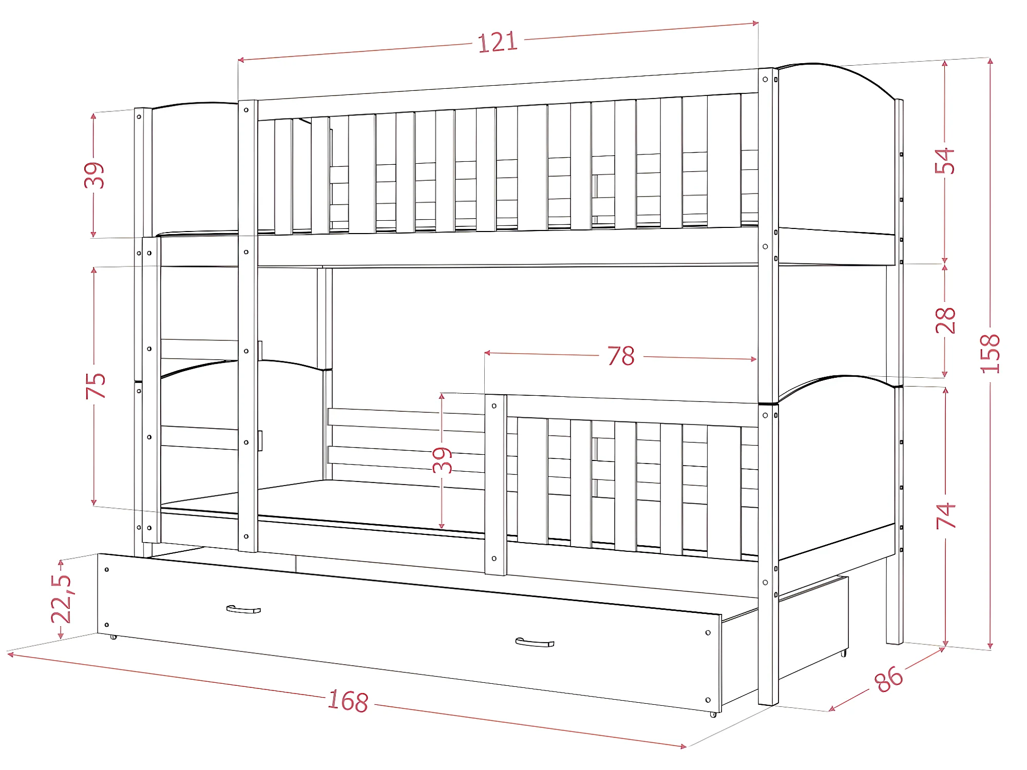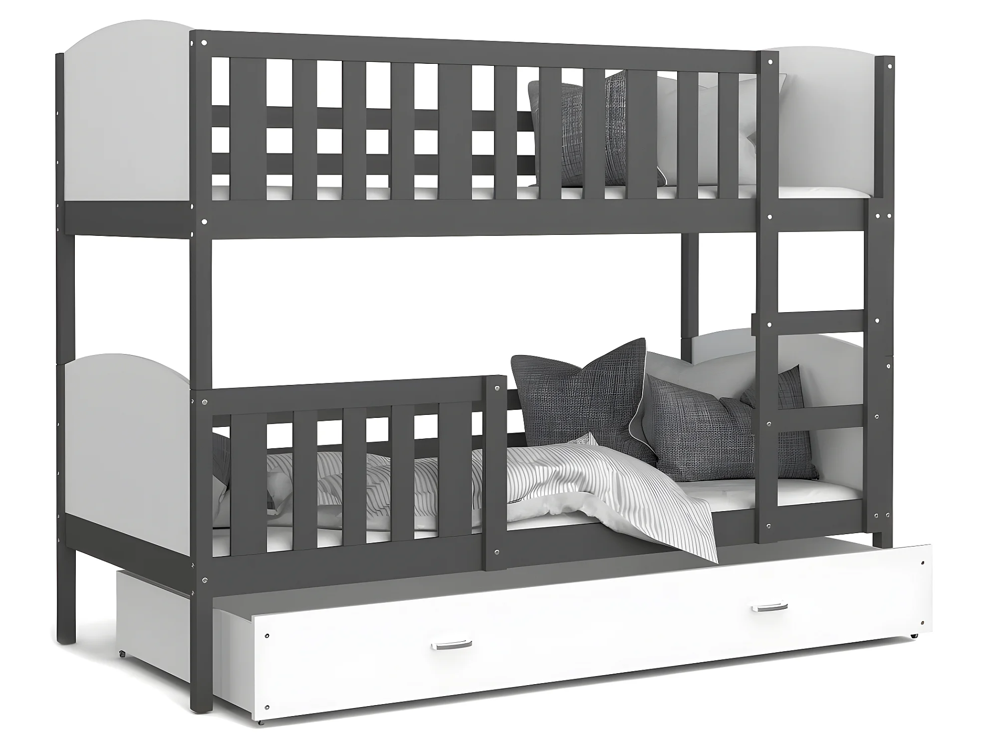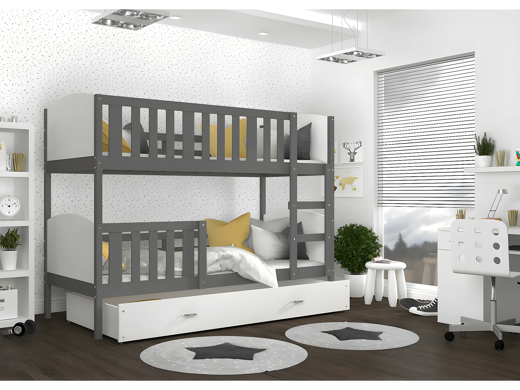 Lit Superposé Tomy 80x160 Gris - blanc Livré avec sommiers, tiroir et matelas en mousse de 7cm