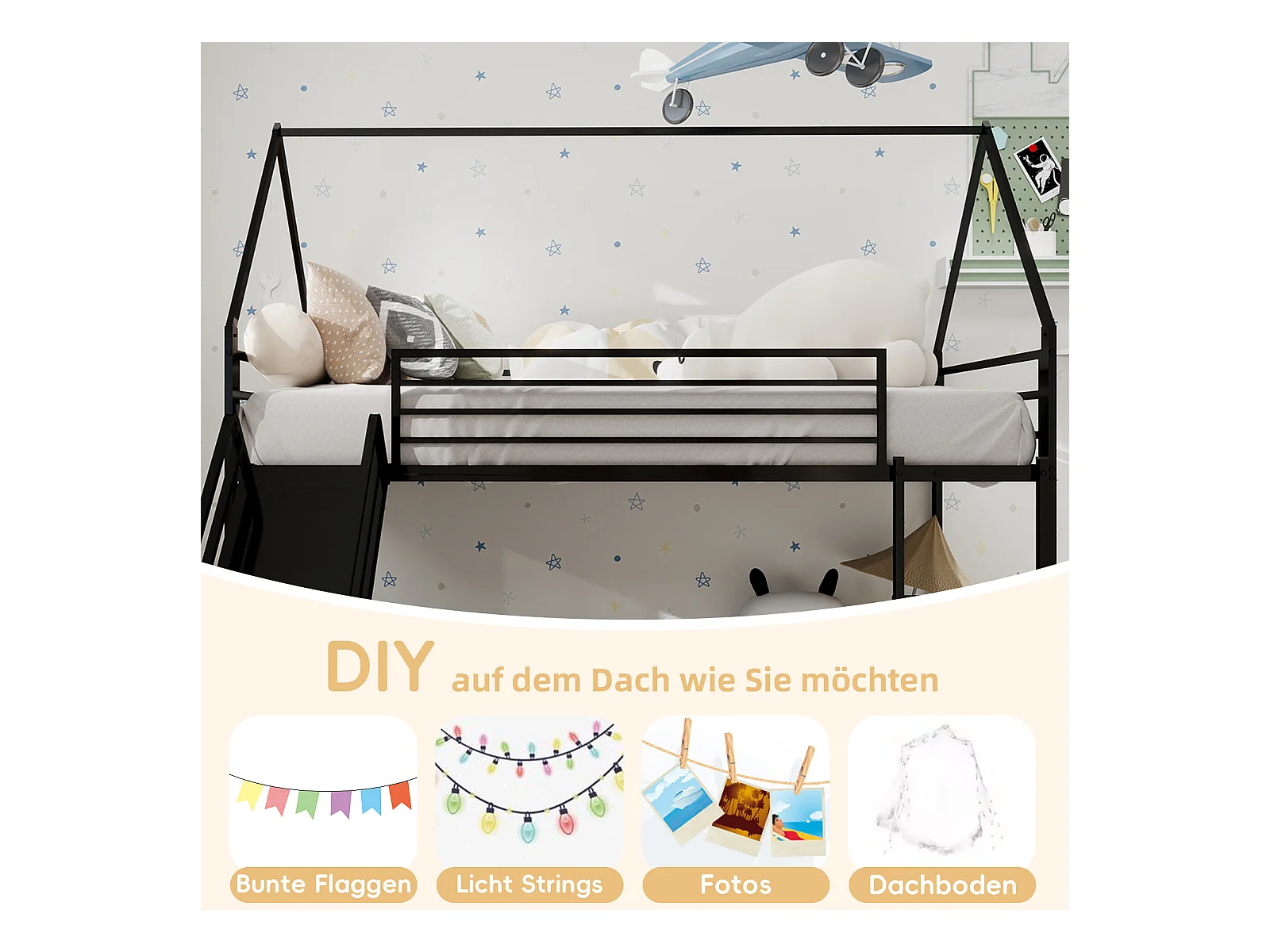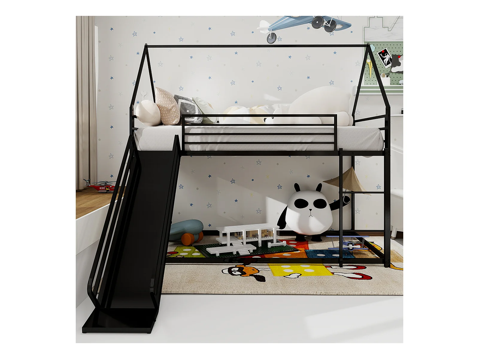 Lit superposé twin avec toboggan, design maison, métal, noir (194x105x179cm)