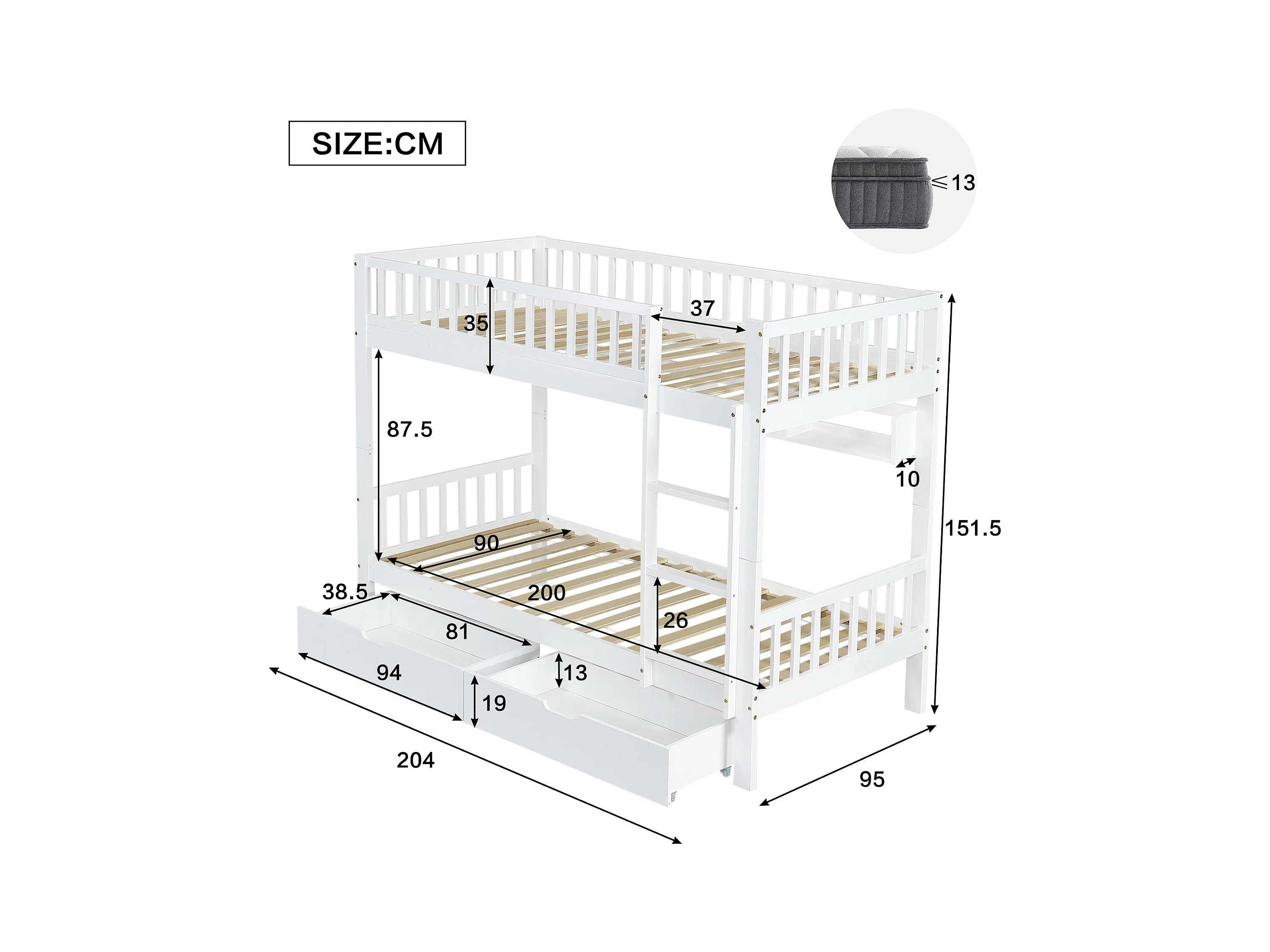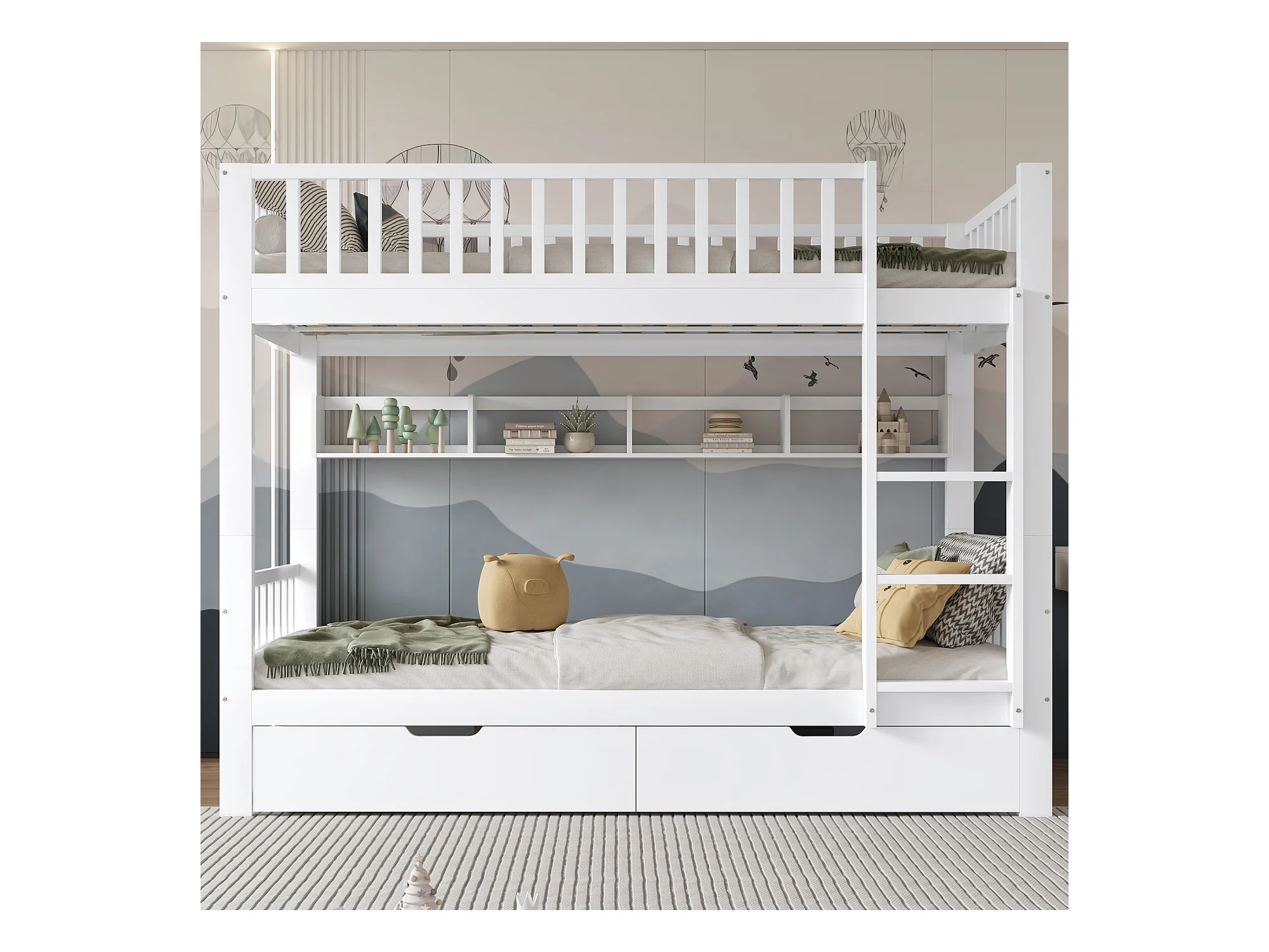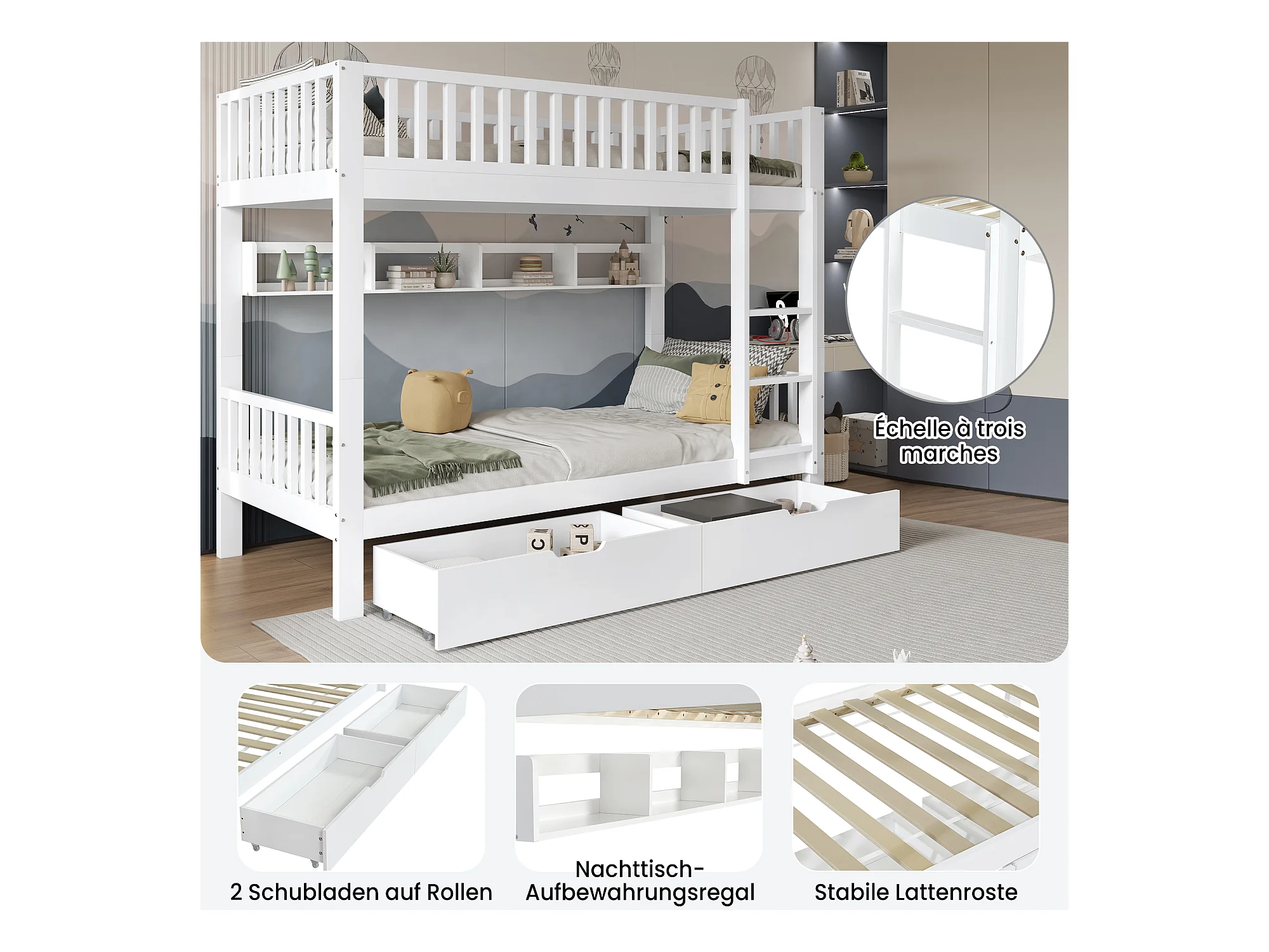 Lit superposés enfant - 2 x 90 x 200 cm - avec barrière de sécurité + étagères + 2 tiroirs - MDF - blanc