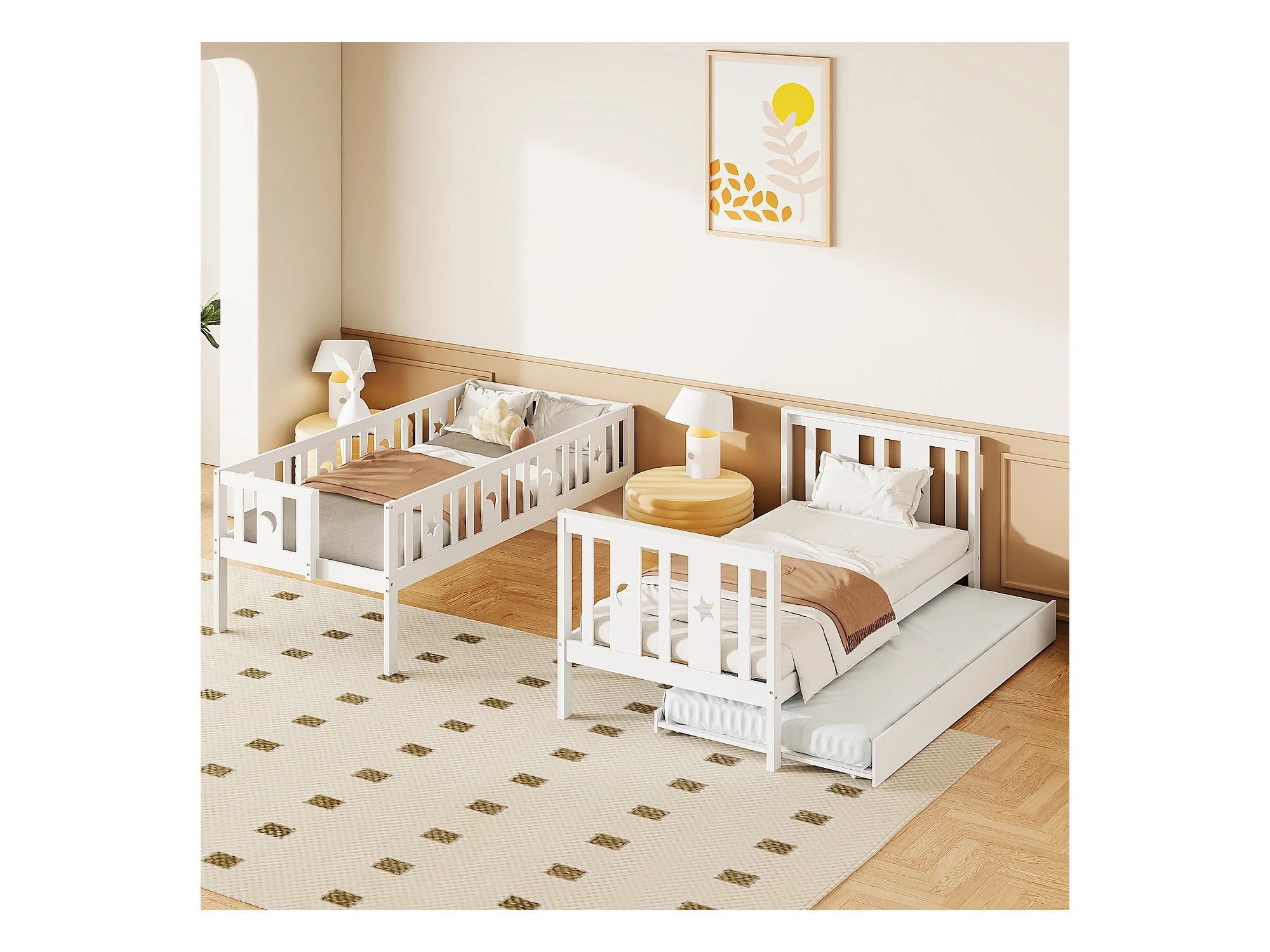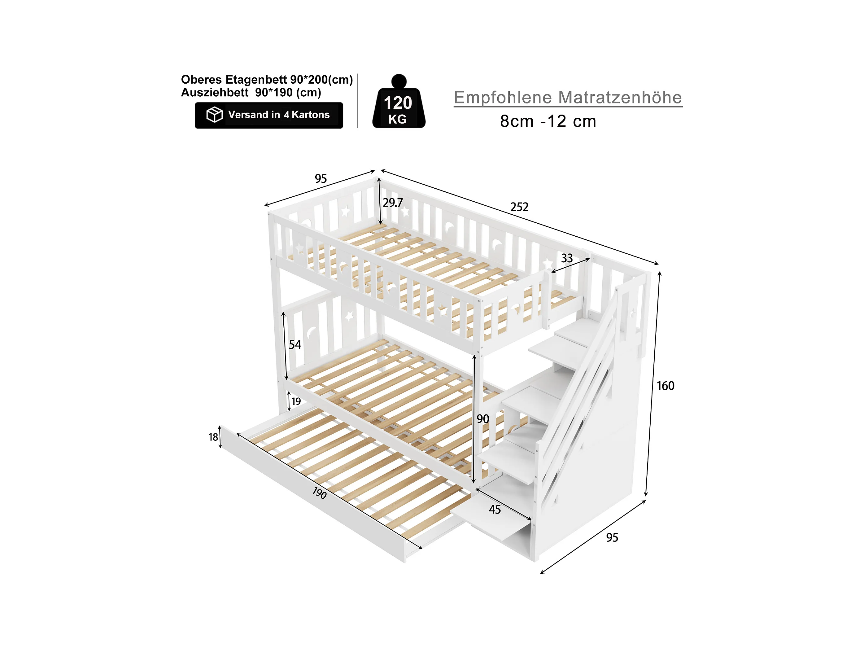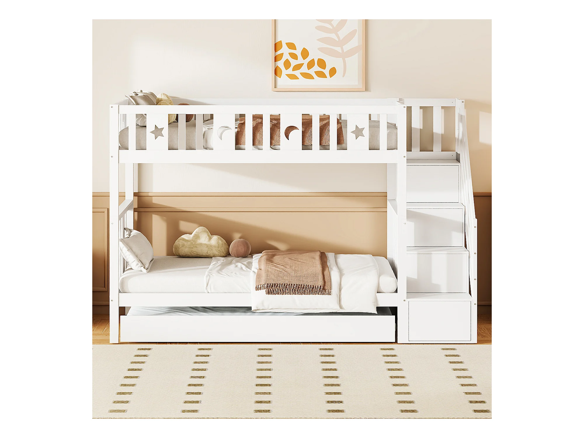 Lit superposés gigogne 3 places - 2 x 90 x 200 cm + 90 x 190 cm - 4 rangements dans l'escalier - Bois massif - Blanc