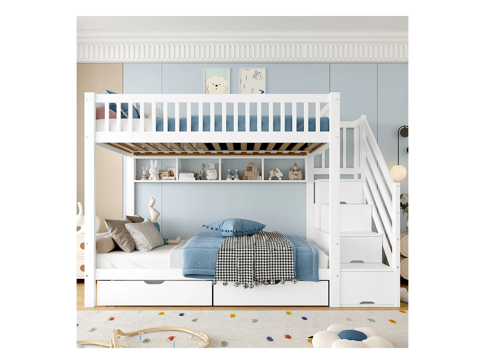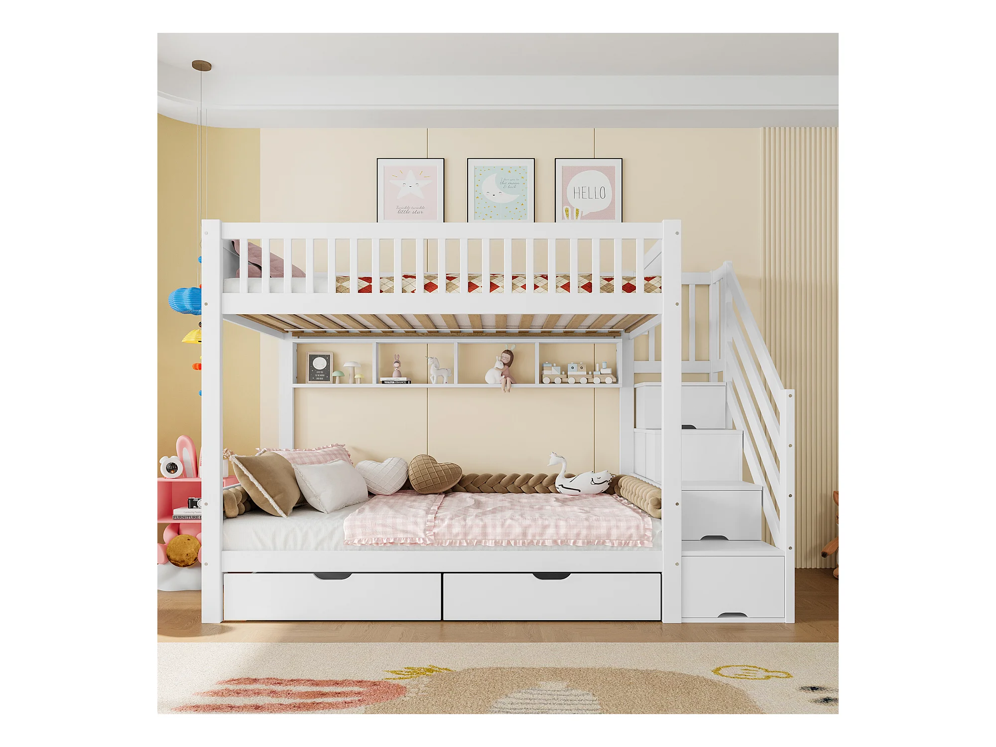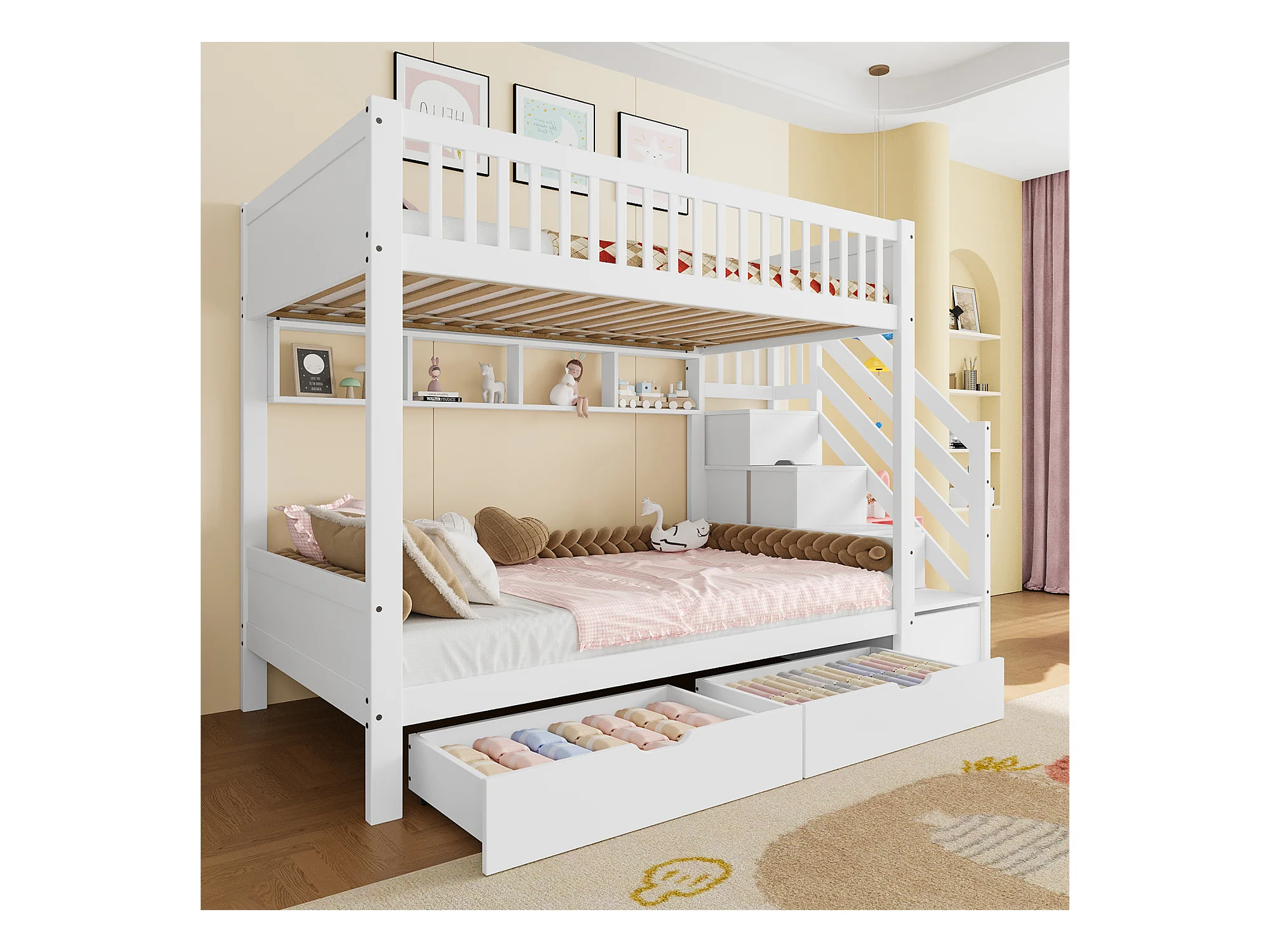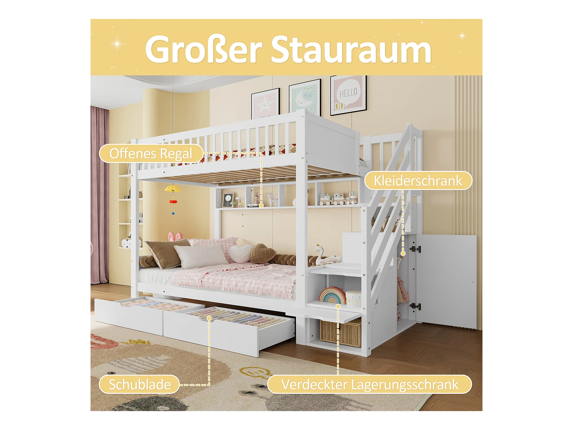 Lit superposés pour enfants - 2 x 90 x 200 cm - avec 2 tiroirs + armoir + 3 rangements dan l'escalier - Pin + MDF - blanc