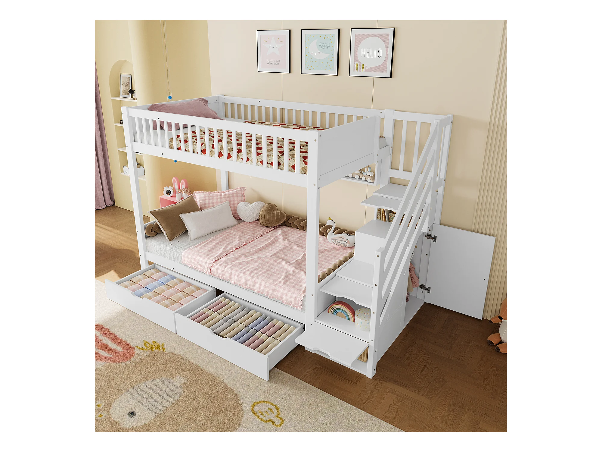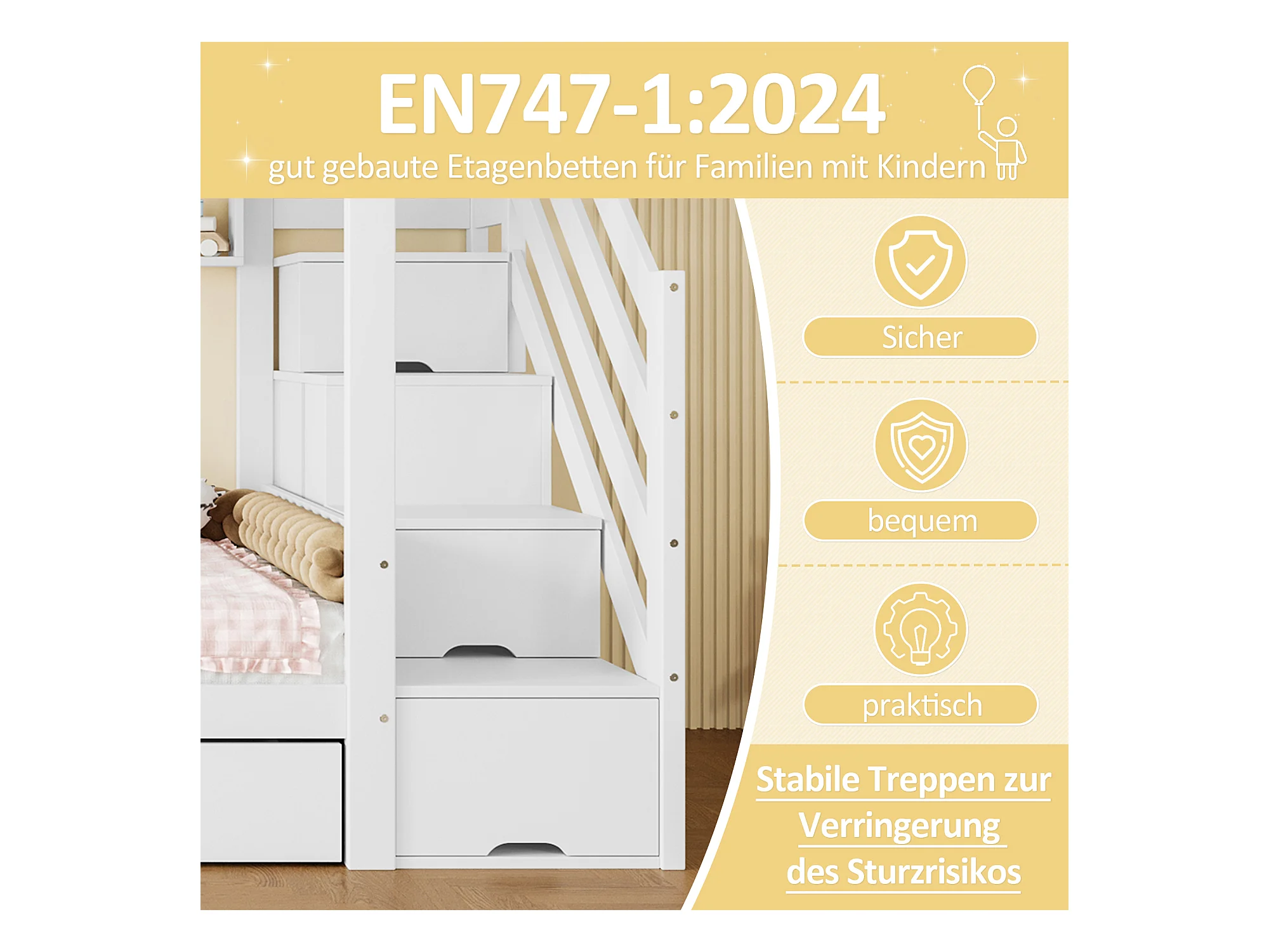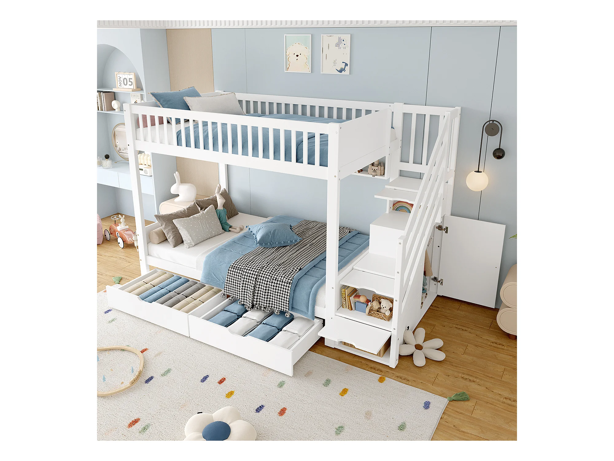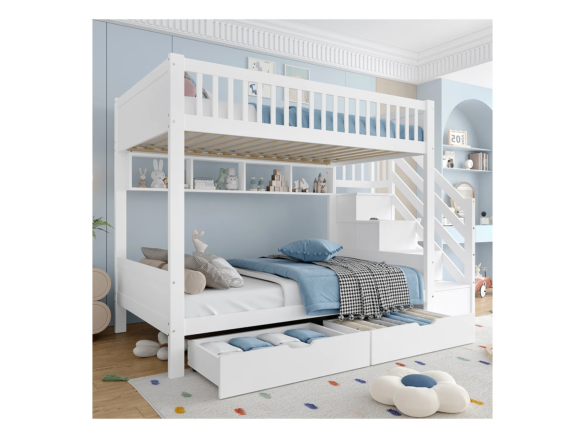 Lit superposés pour enfants - 2 x 90 x 200 cm - avec 2 tiroirs + armoir + 3 rangements dan l'escalier - Pin + MDF - blanc