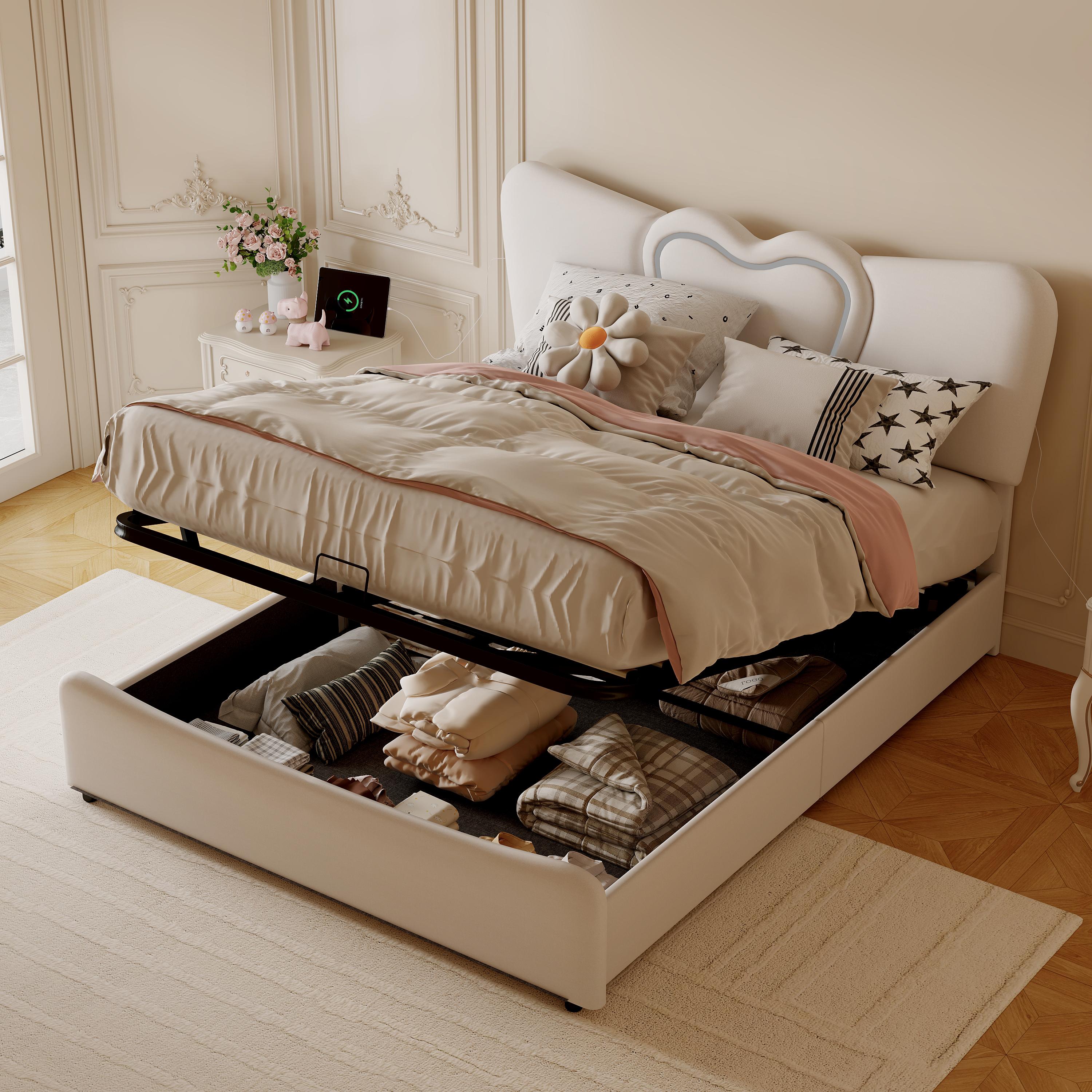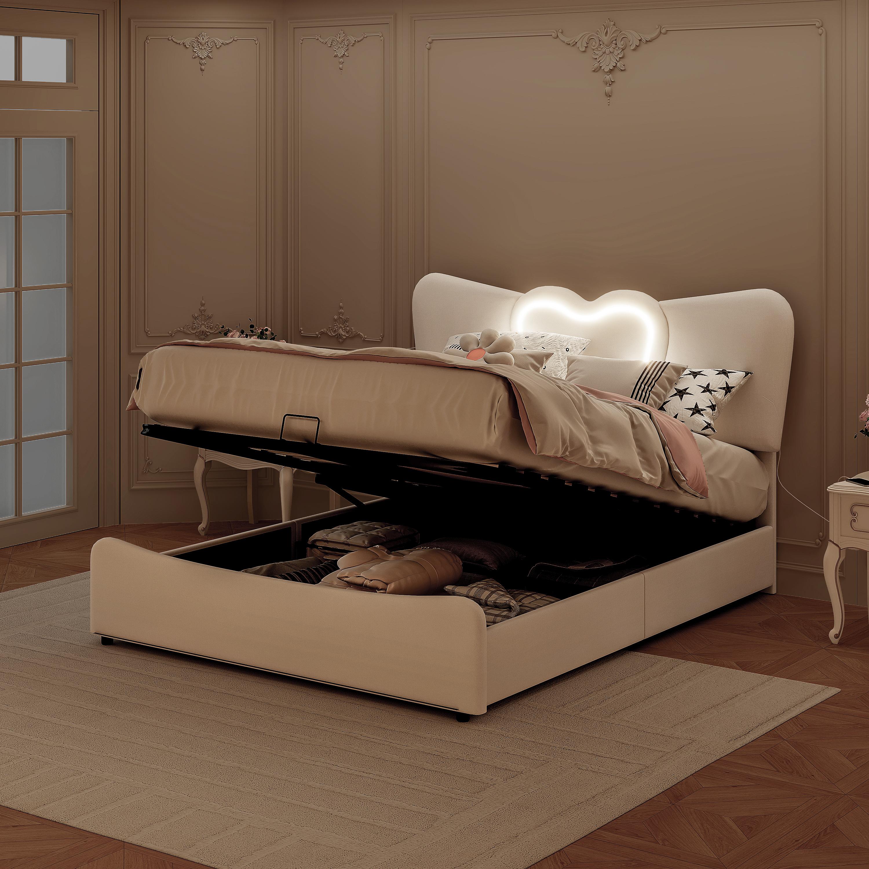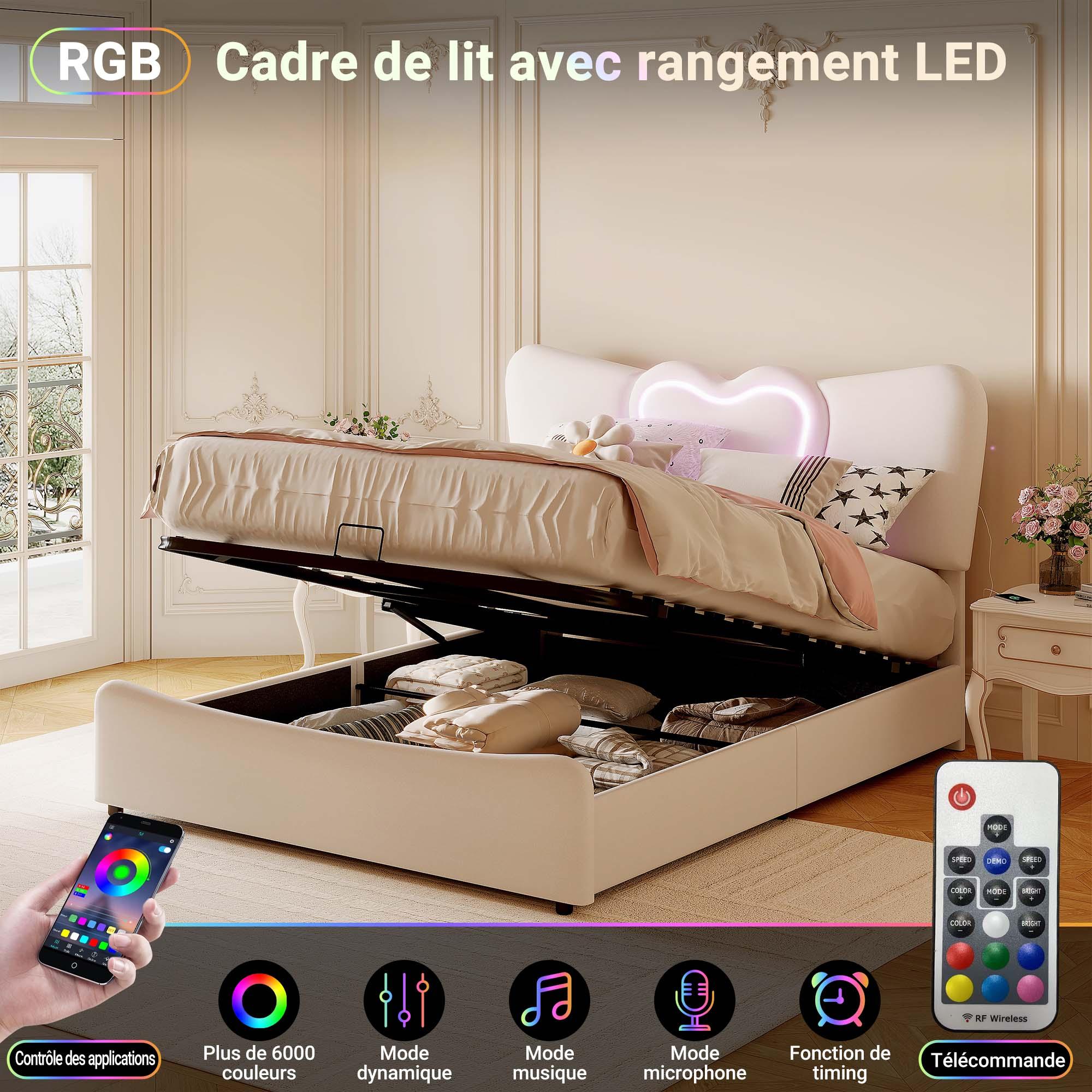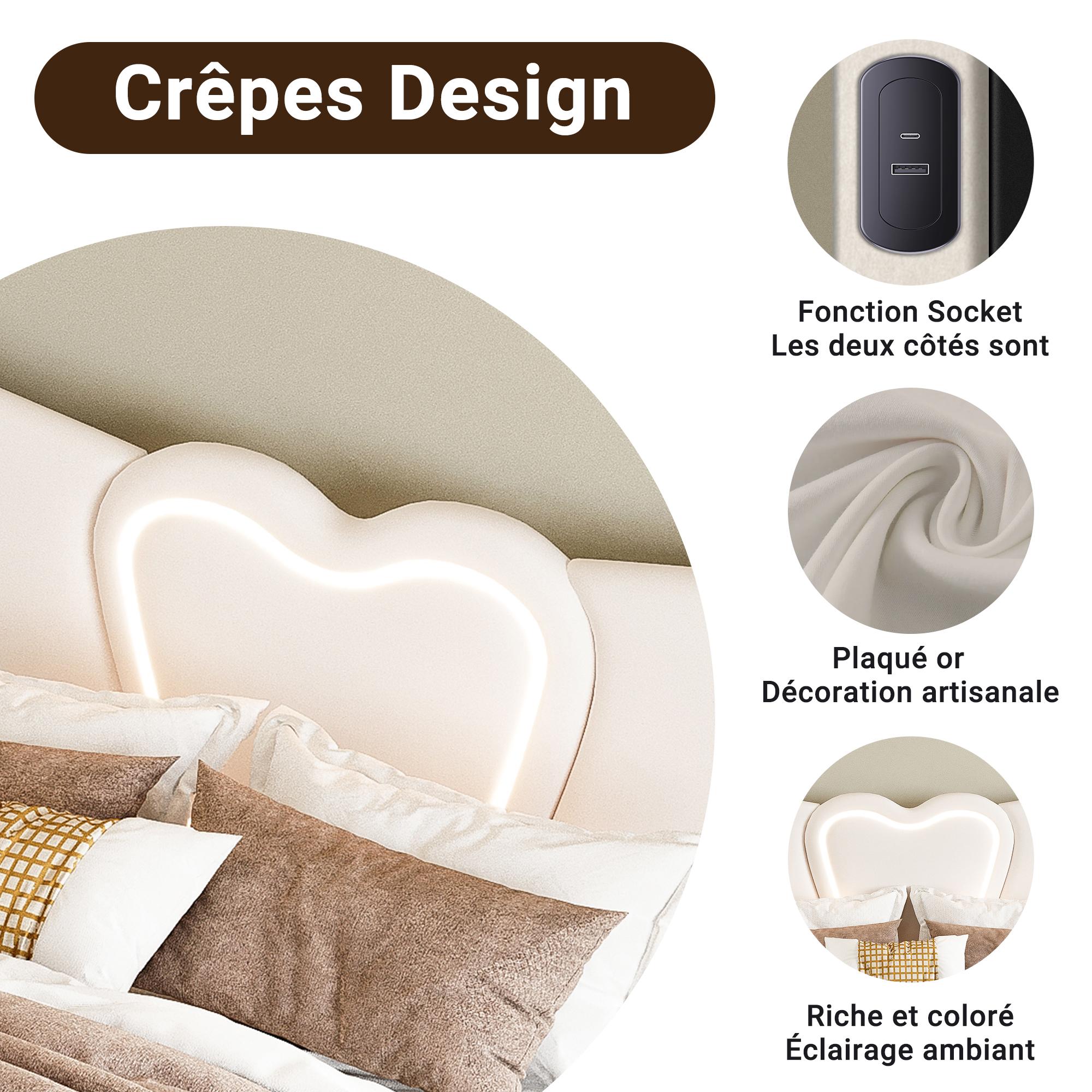 Lit tapissé 140 x 200 cm avec lumières LED et USB, avec rangement, tissu de velours,lit double 160 x 200 cm, beige (sans matelas)