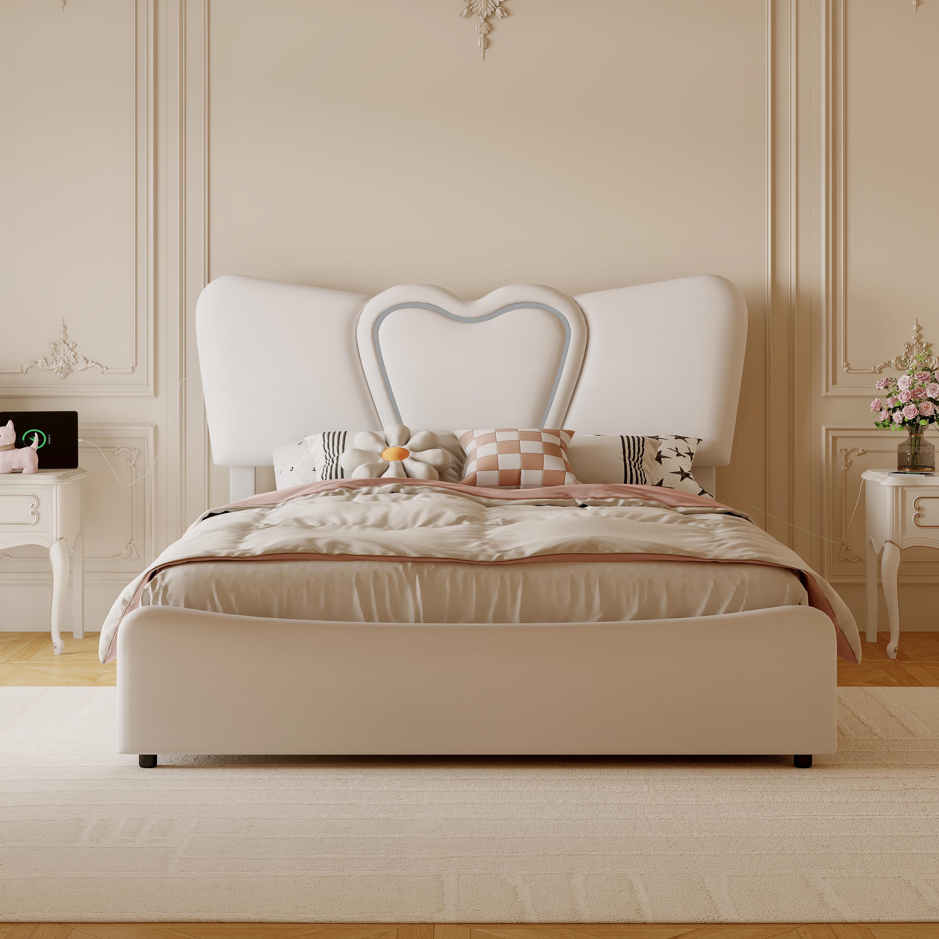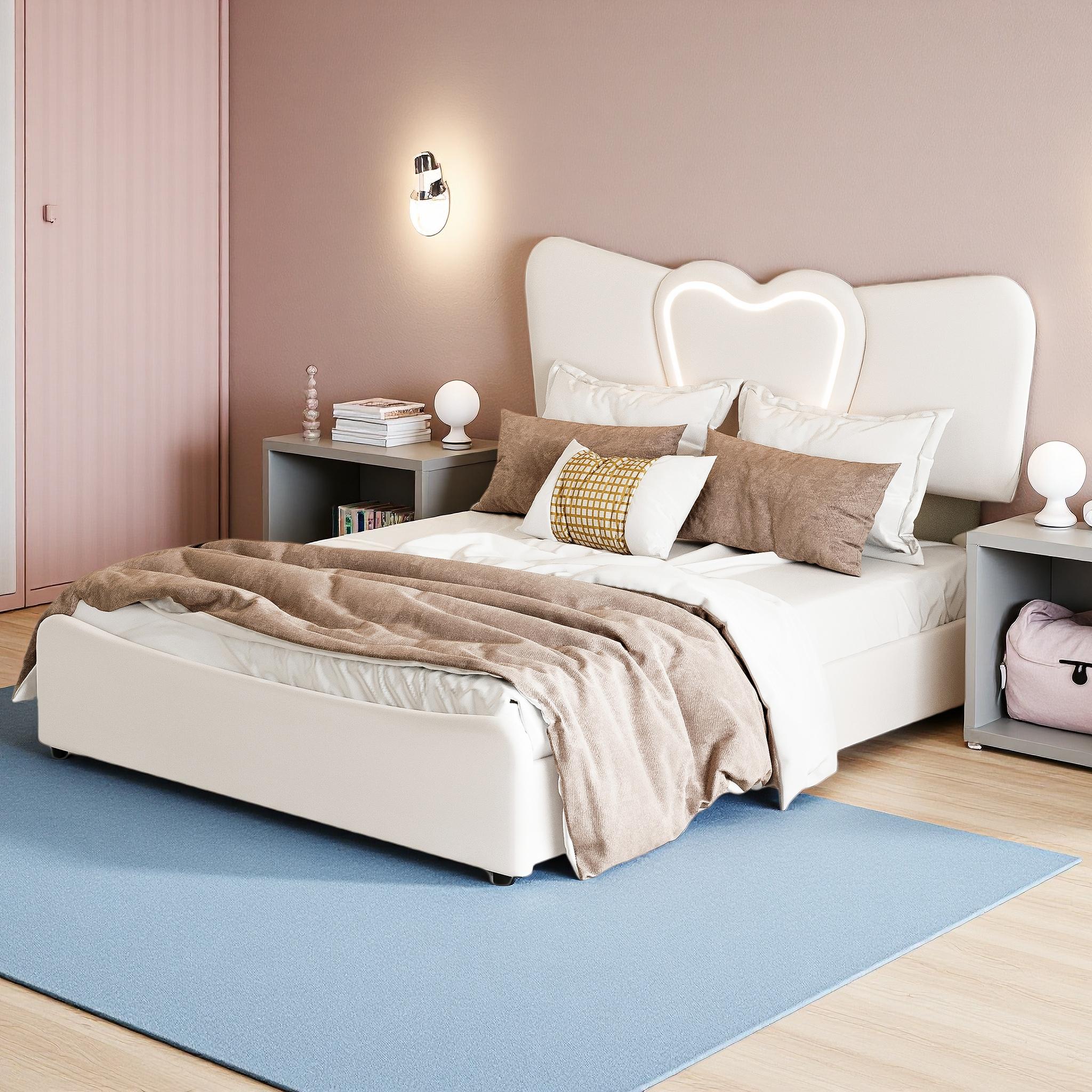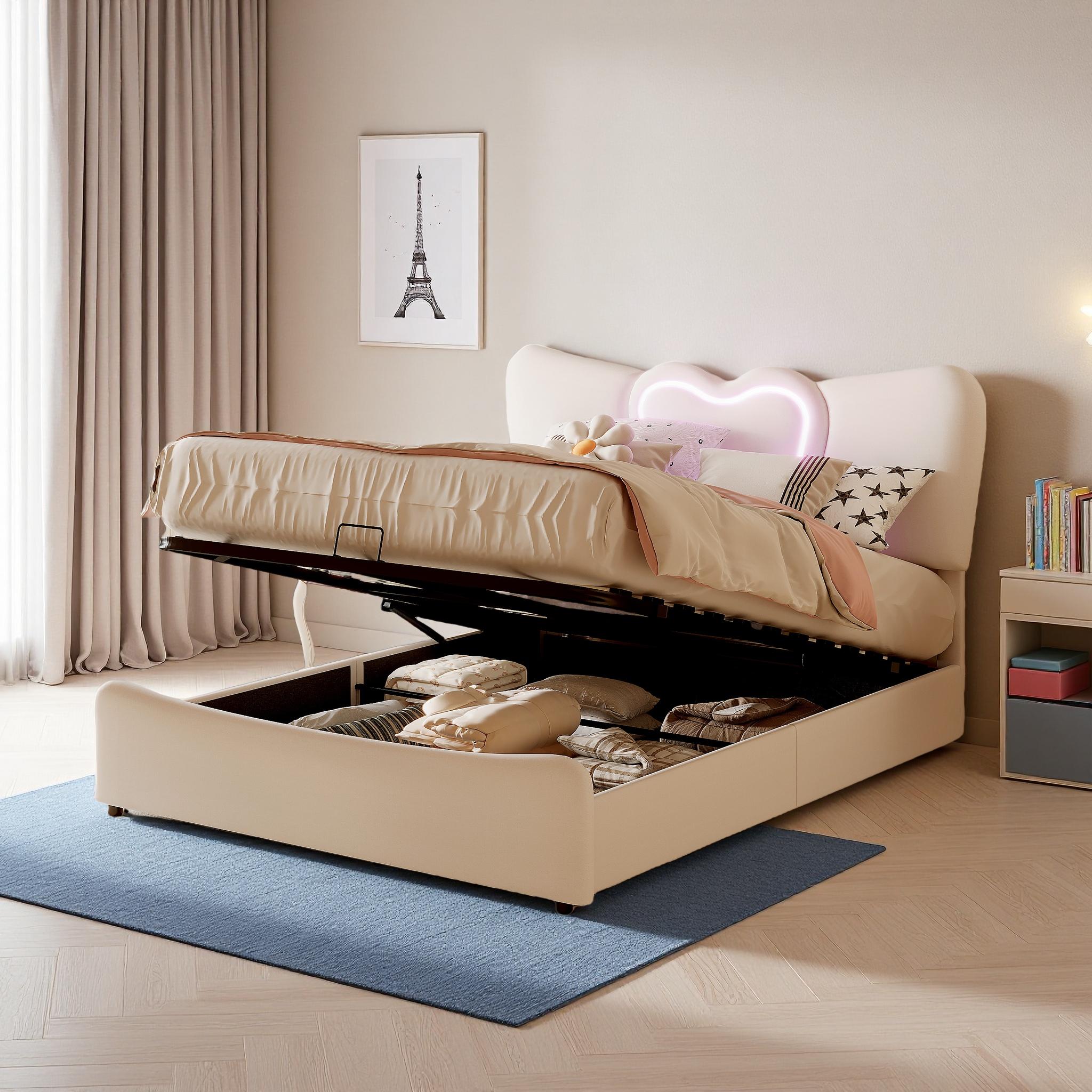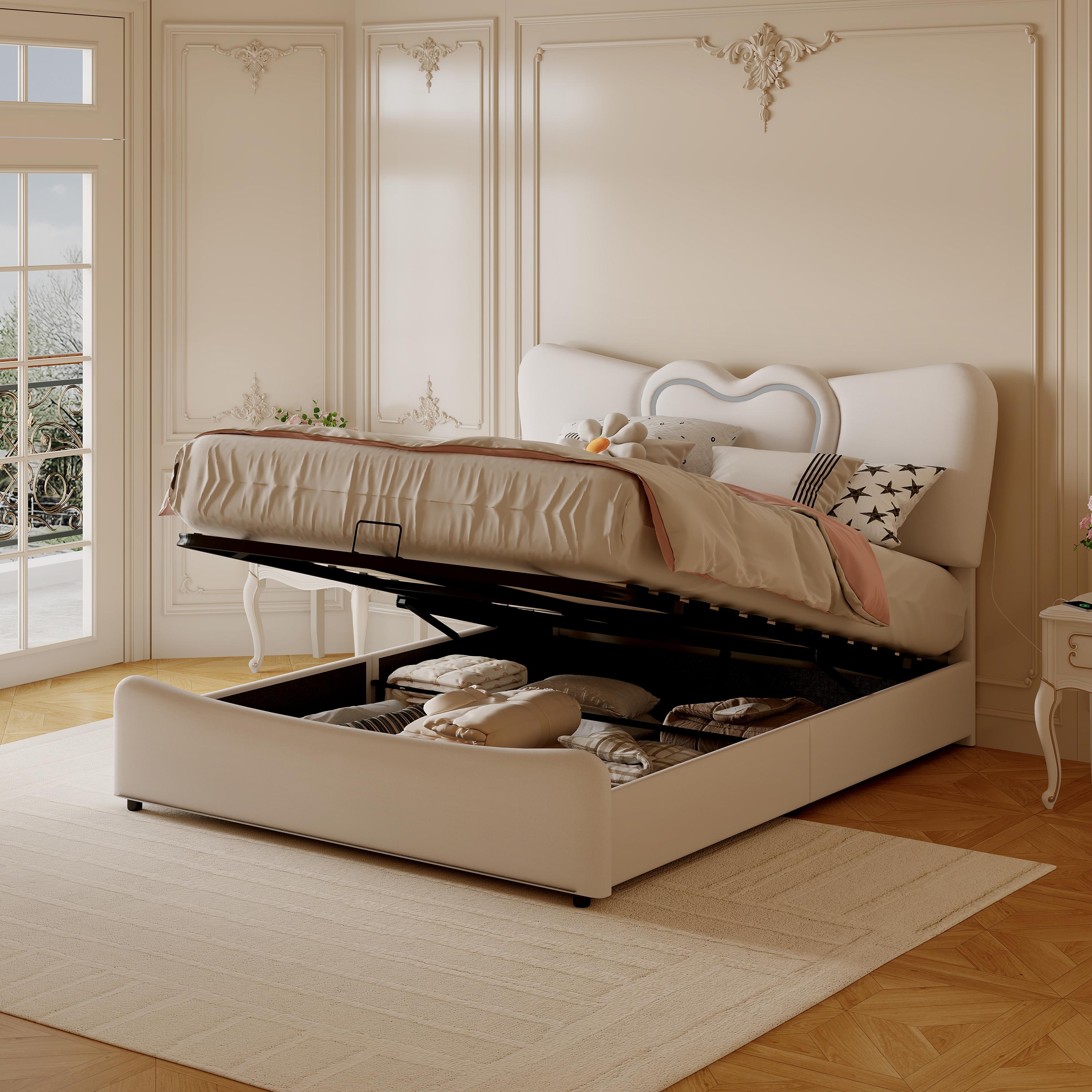 Lit tapissé 140 x 200 cm avec lumières LED et USB, avec rangement, tissu de velours,lit double 160 x 200 cm, beige (sans matelas)