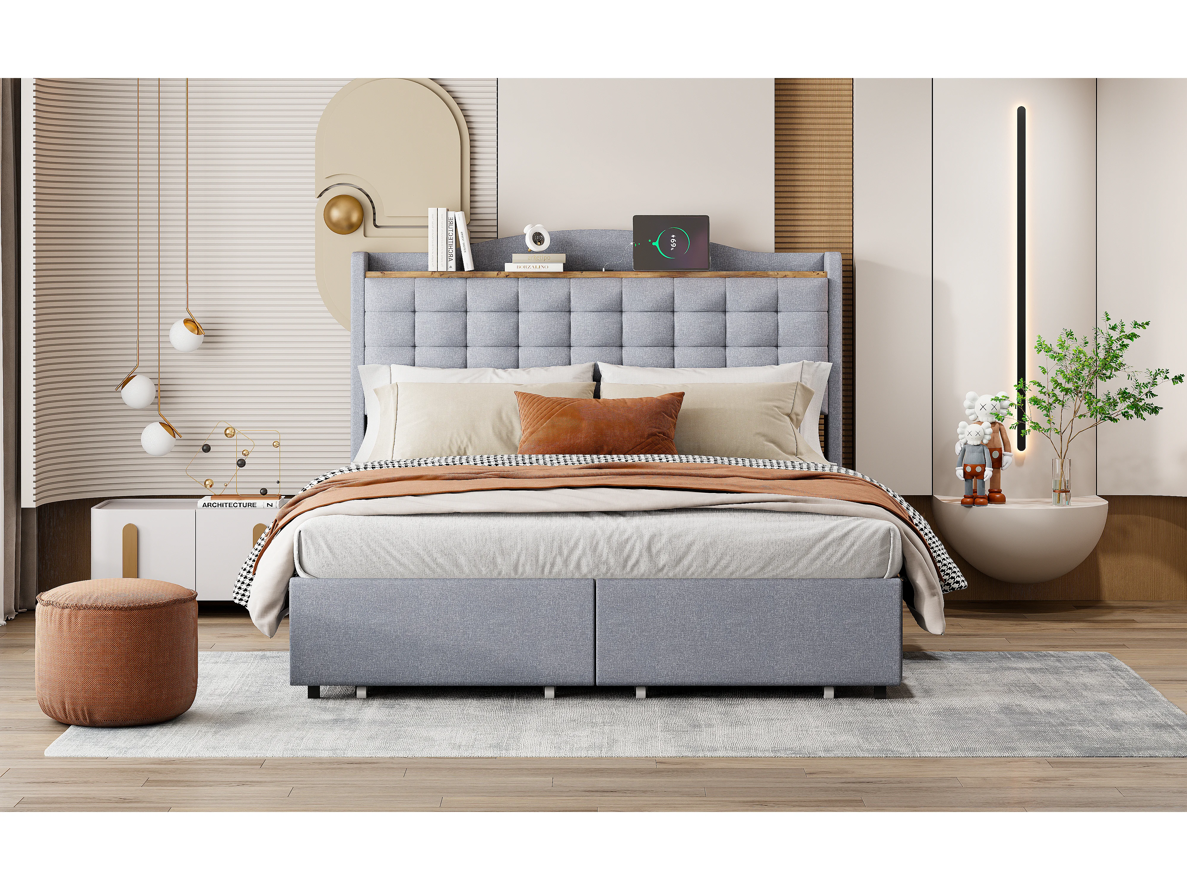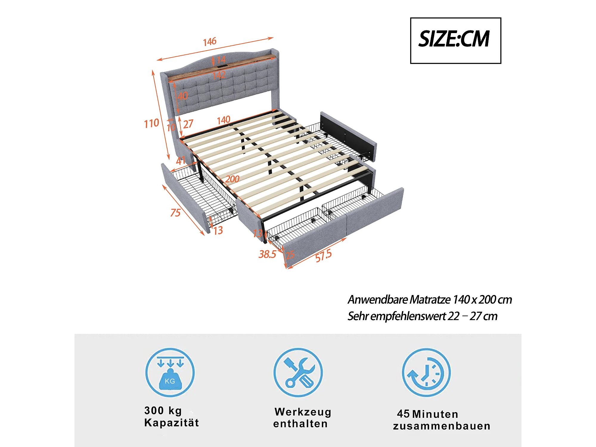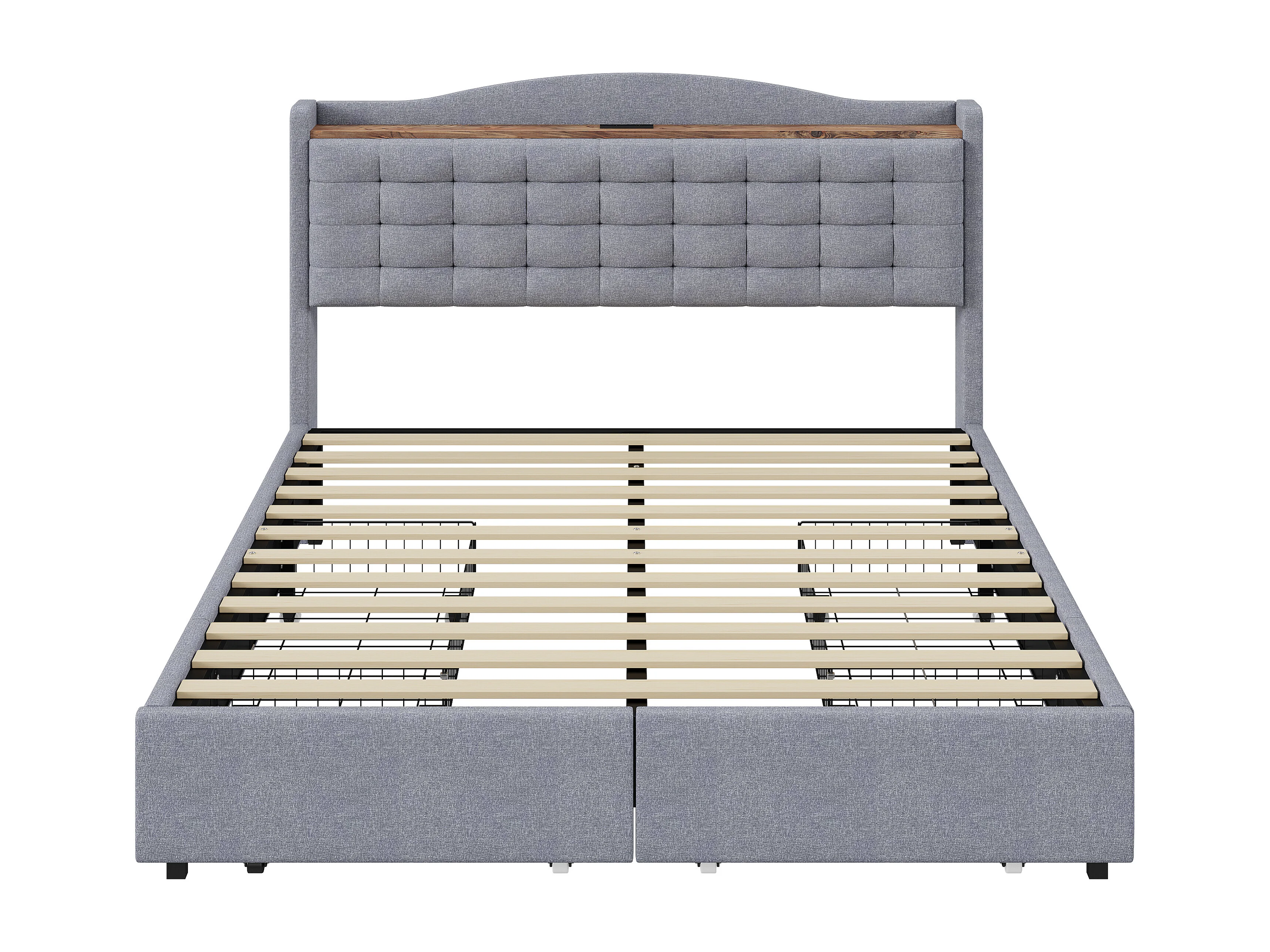 Lit tapissé 140x200 cm avec prise USB, LED, 4 tiroirs, tissu lin gris (200x146x110 cm)