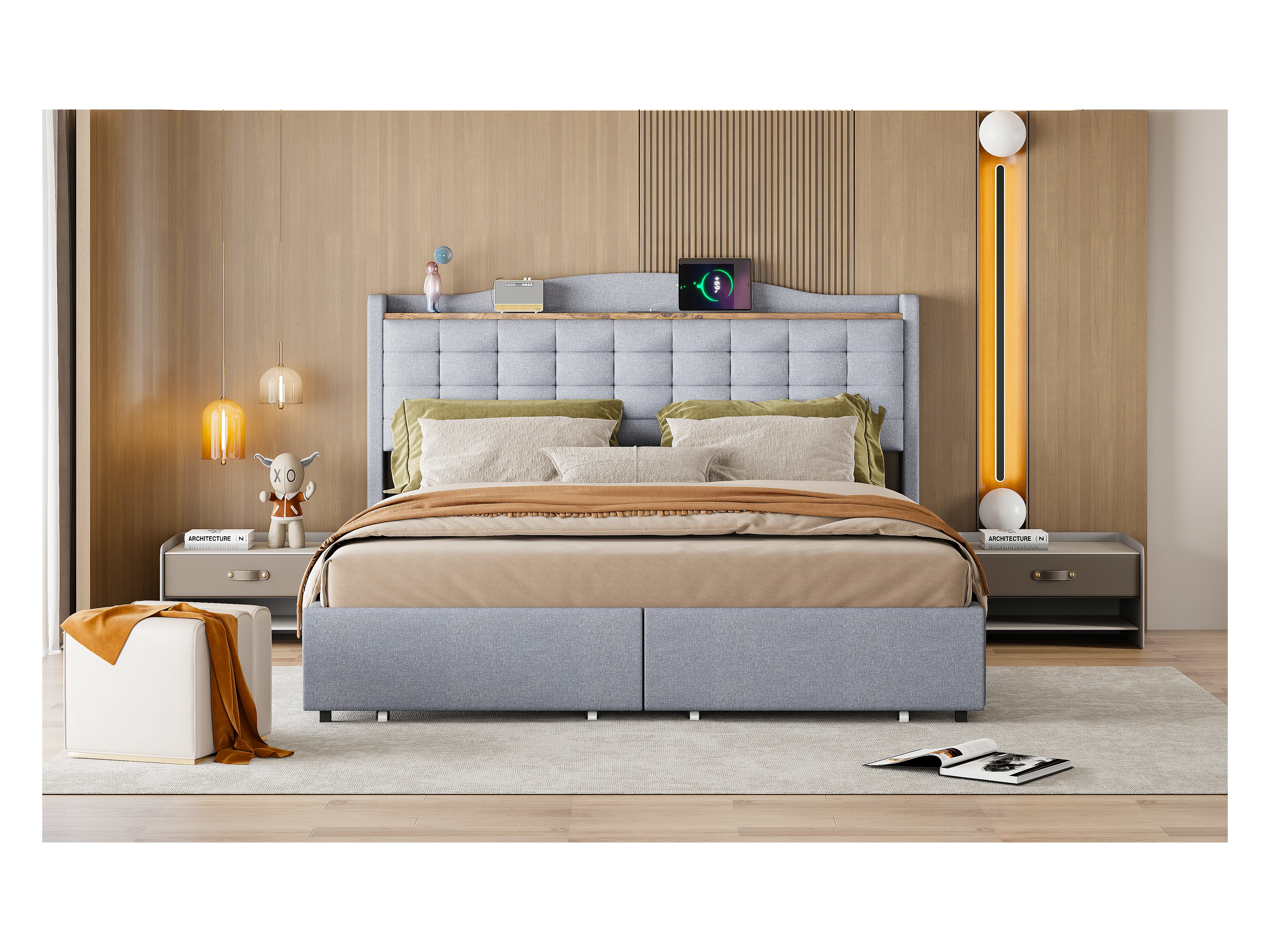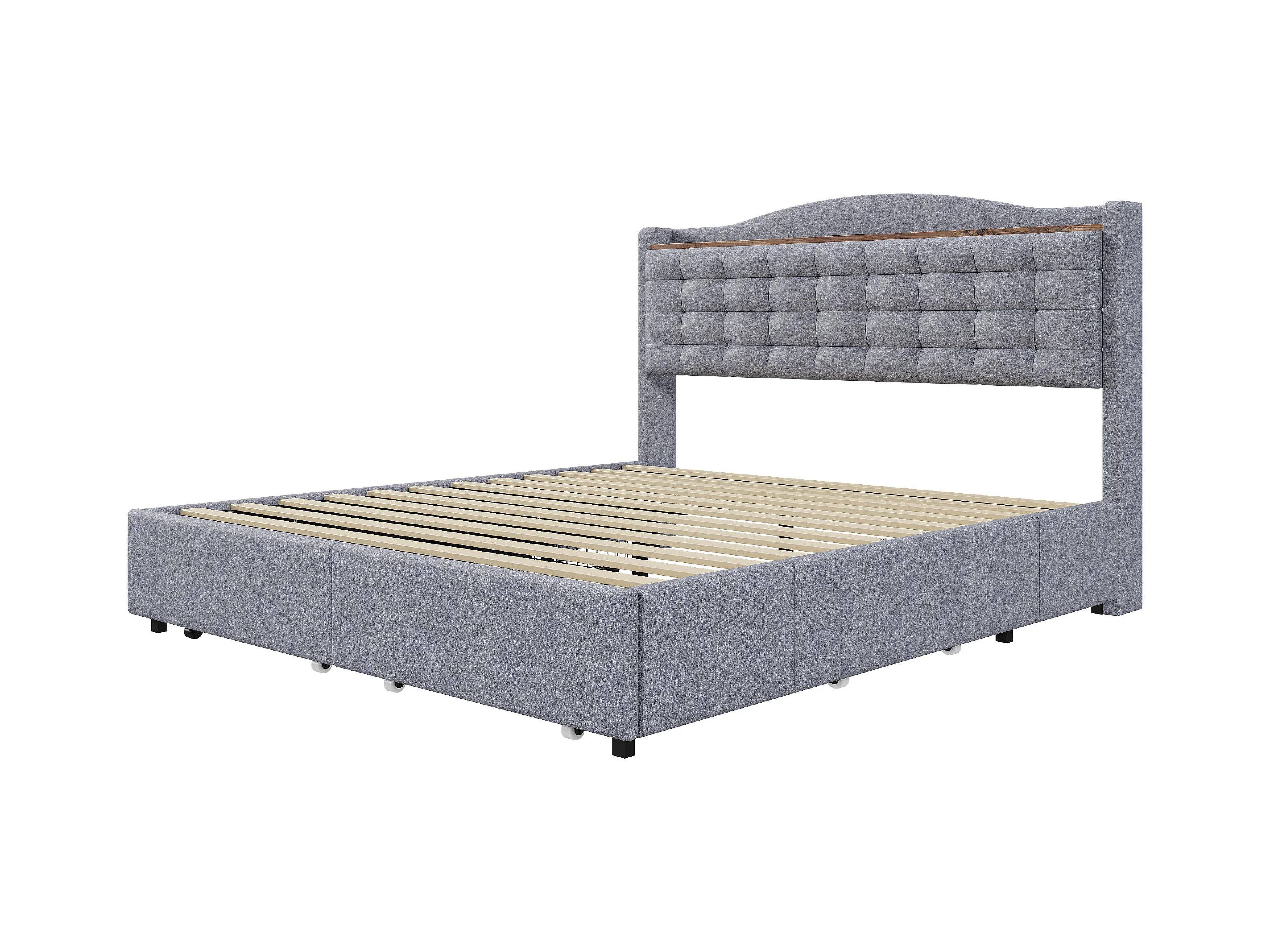 Lit tapissé 160x200 cm avec LED, prise USB, tête réversible, 4 tiroirs, tissu lin gris (201x161x110 cm)