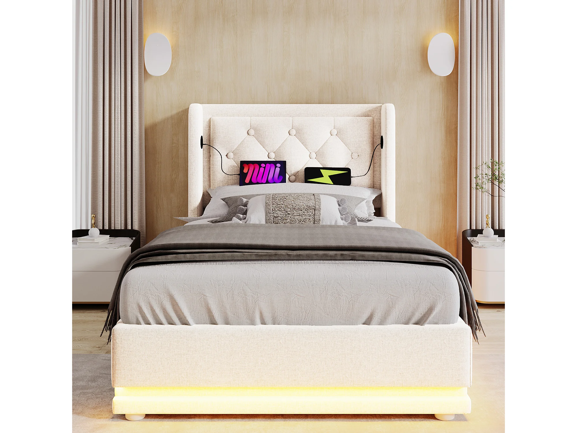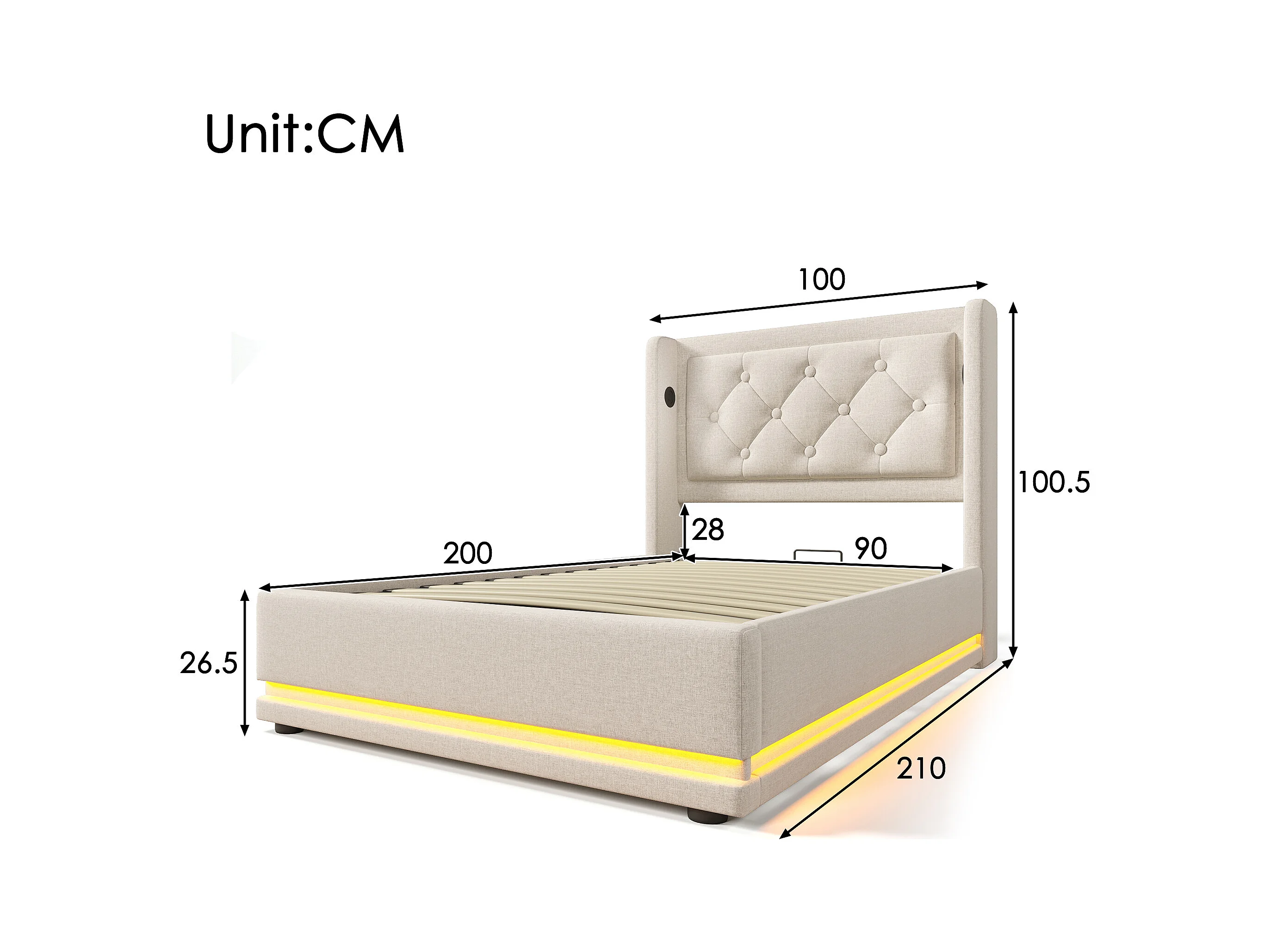 Lit tapissé 90x200 cm simple, LED 3 côtés, hydraulique, tête avec USB-C, coton beige (Avec matelas)