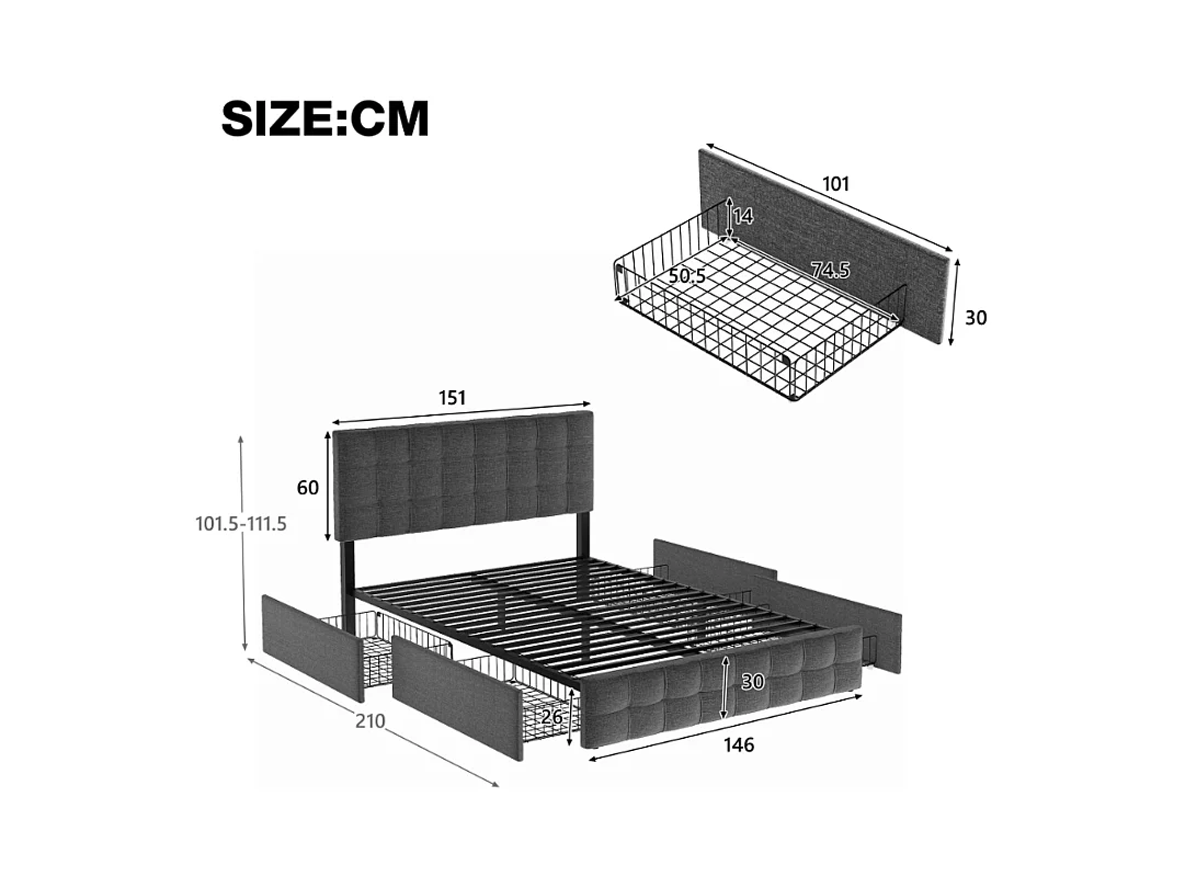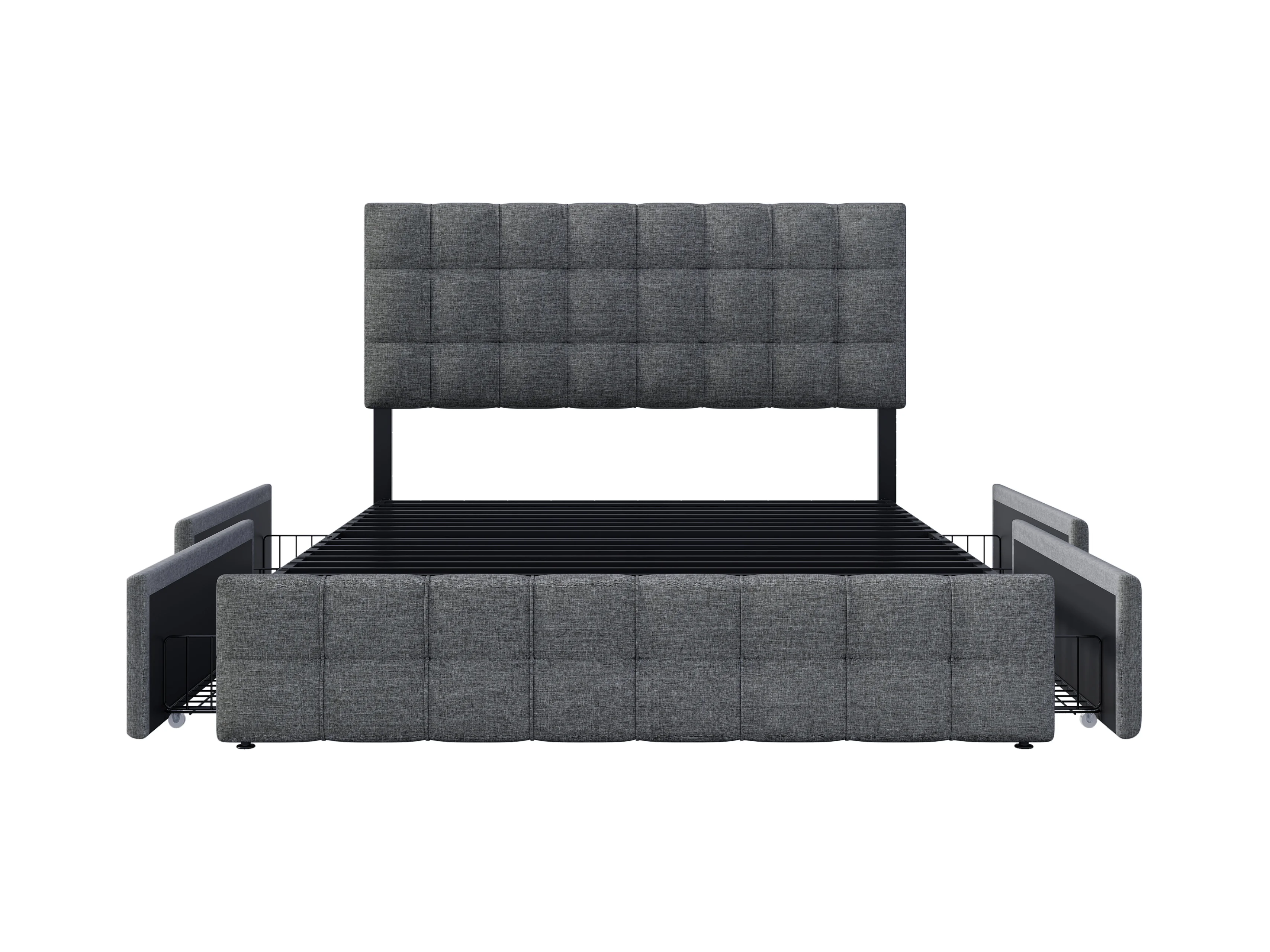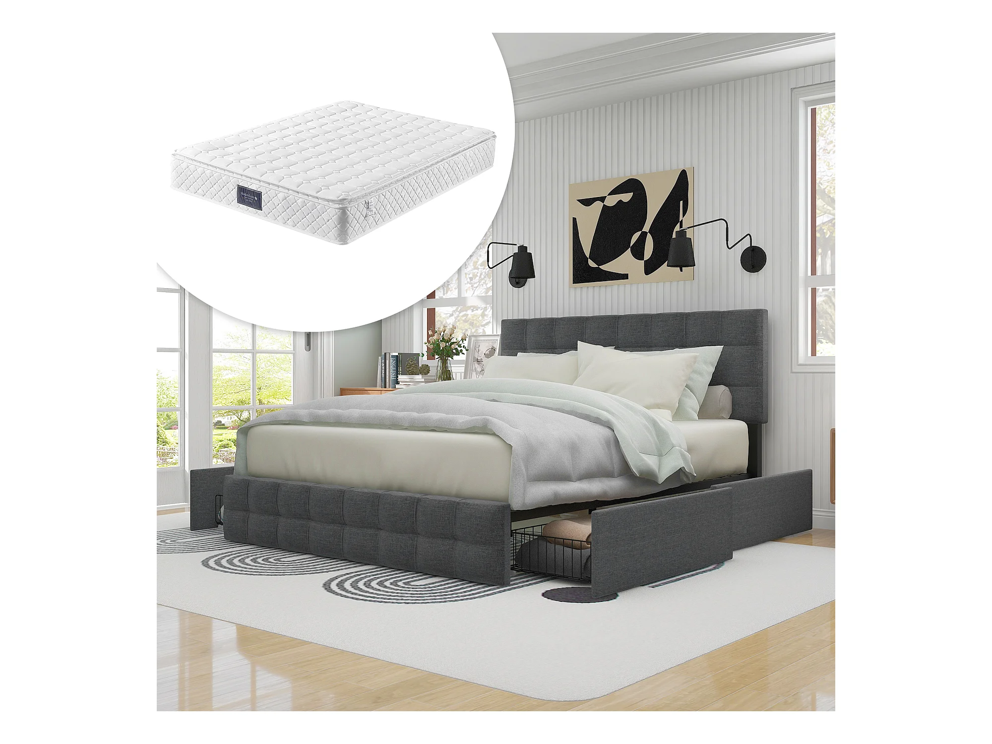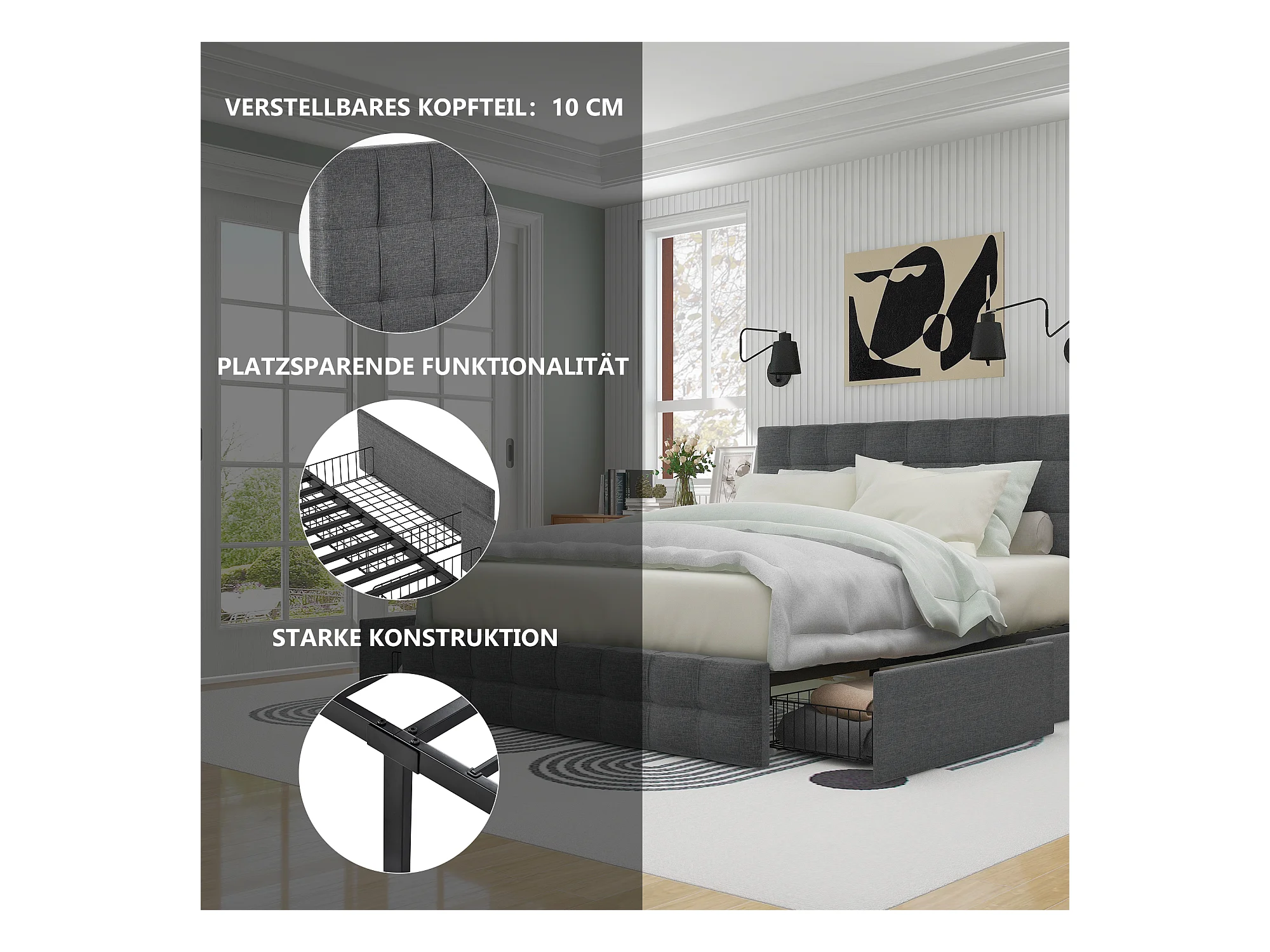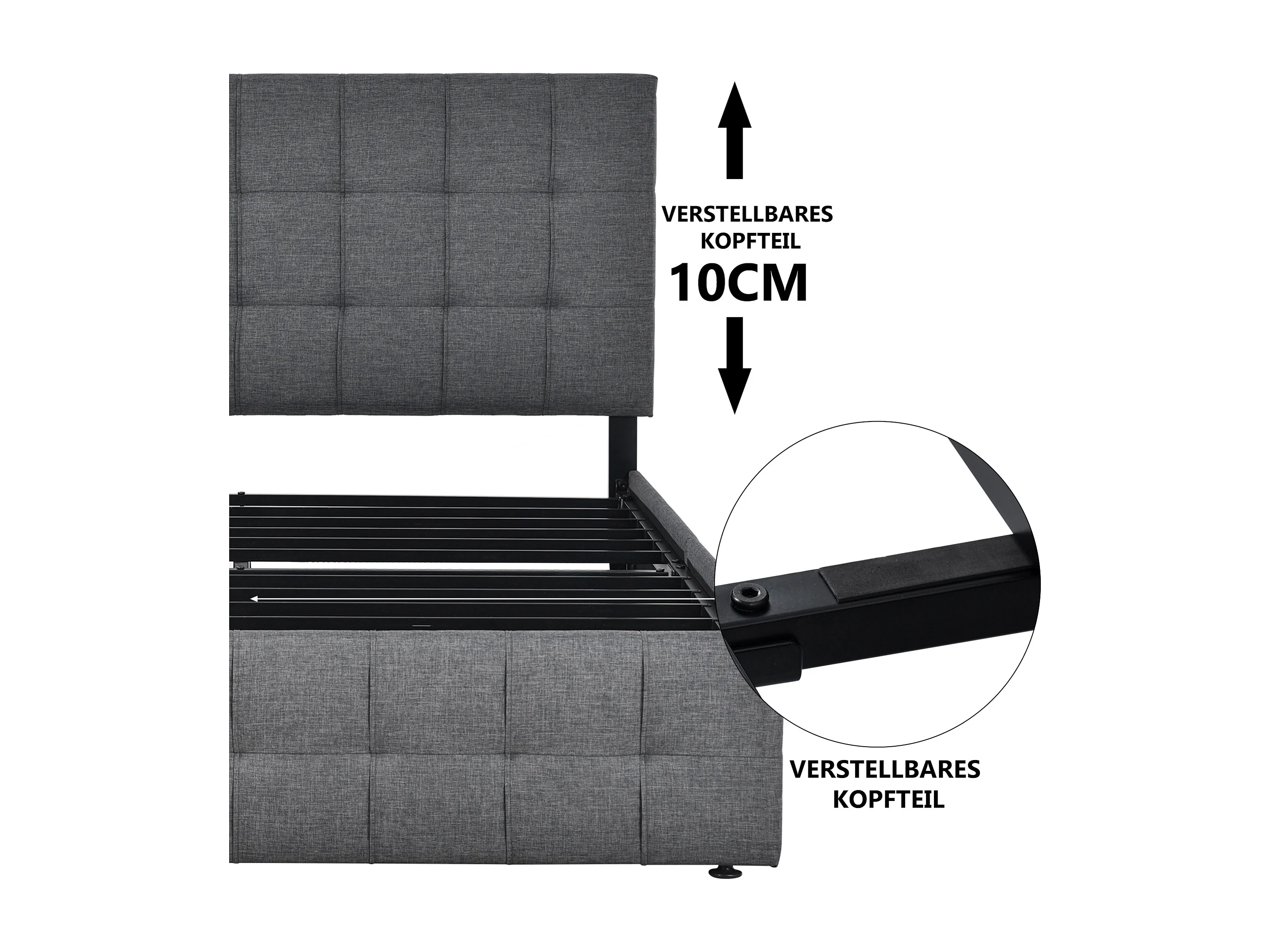Lit tapissé avec 4 tiroirs, matelas à ressorts ensachés, tête de lit réglable, lin gris (210x146x112cm)