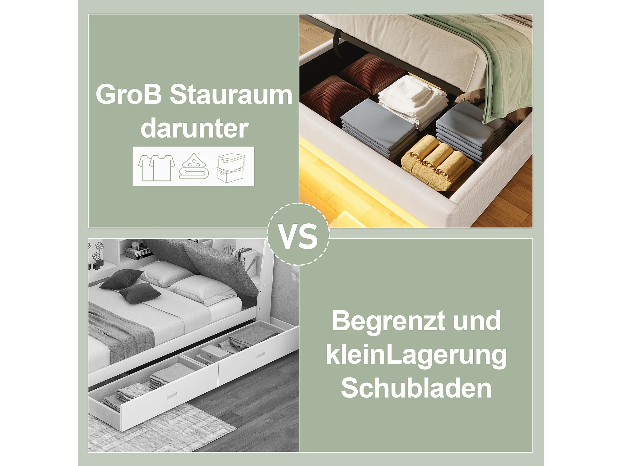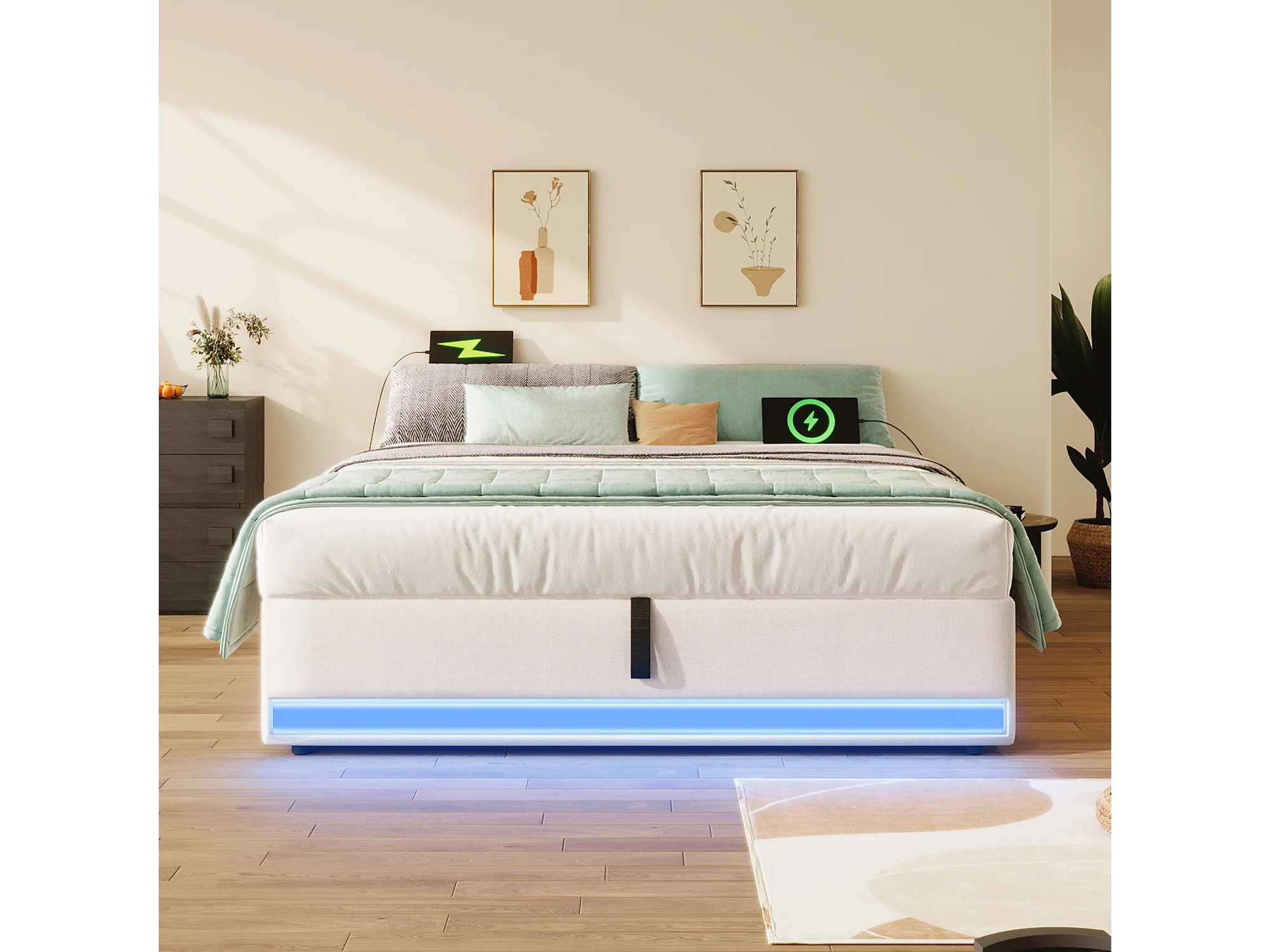 Lit tapissier 140 x 200 cm, avec LED télécommandée, USB et Type-C, petites poches de rangement, sans tête de lit, fonction de stockage hydraulique (203x141.5x32 cm)