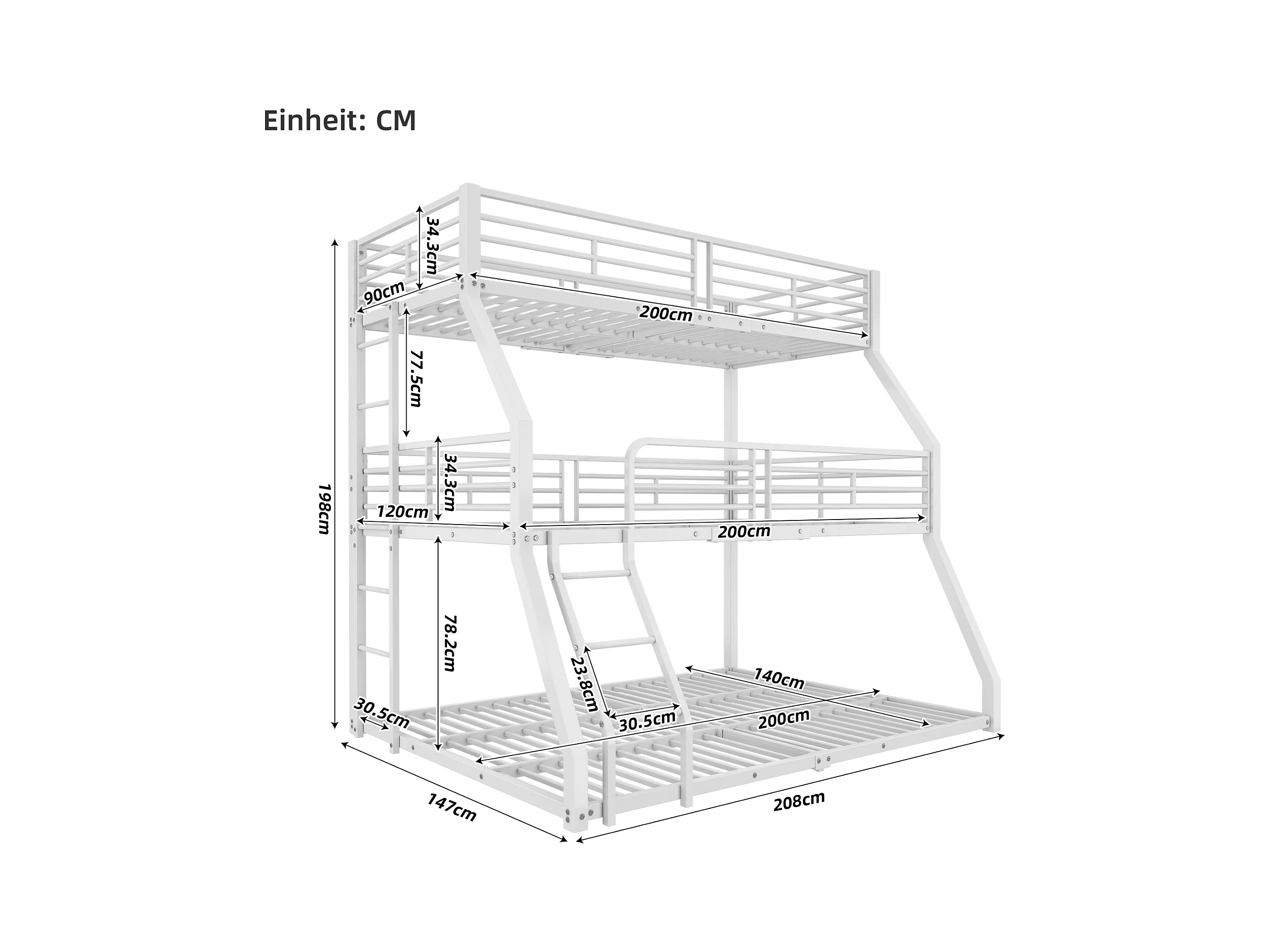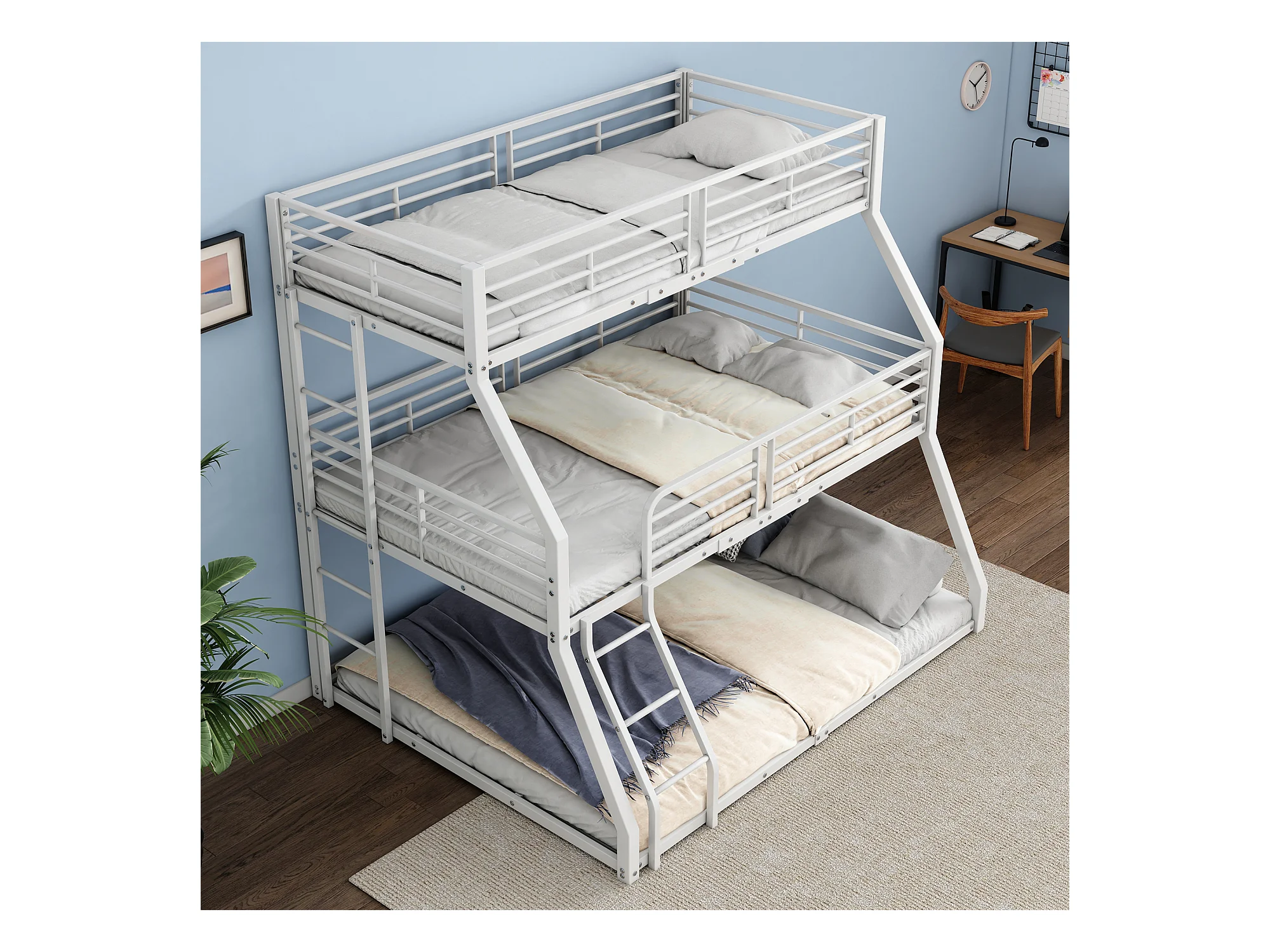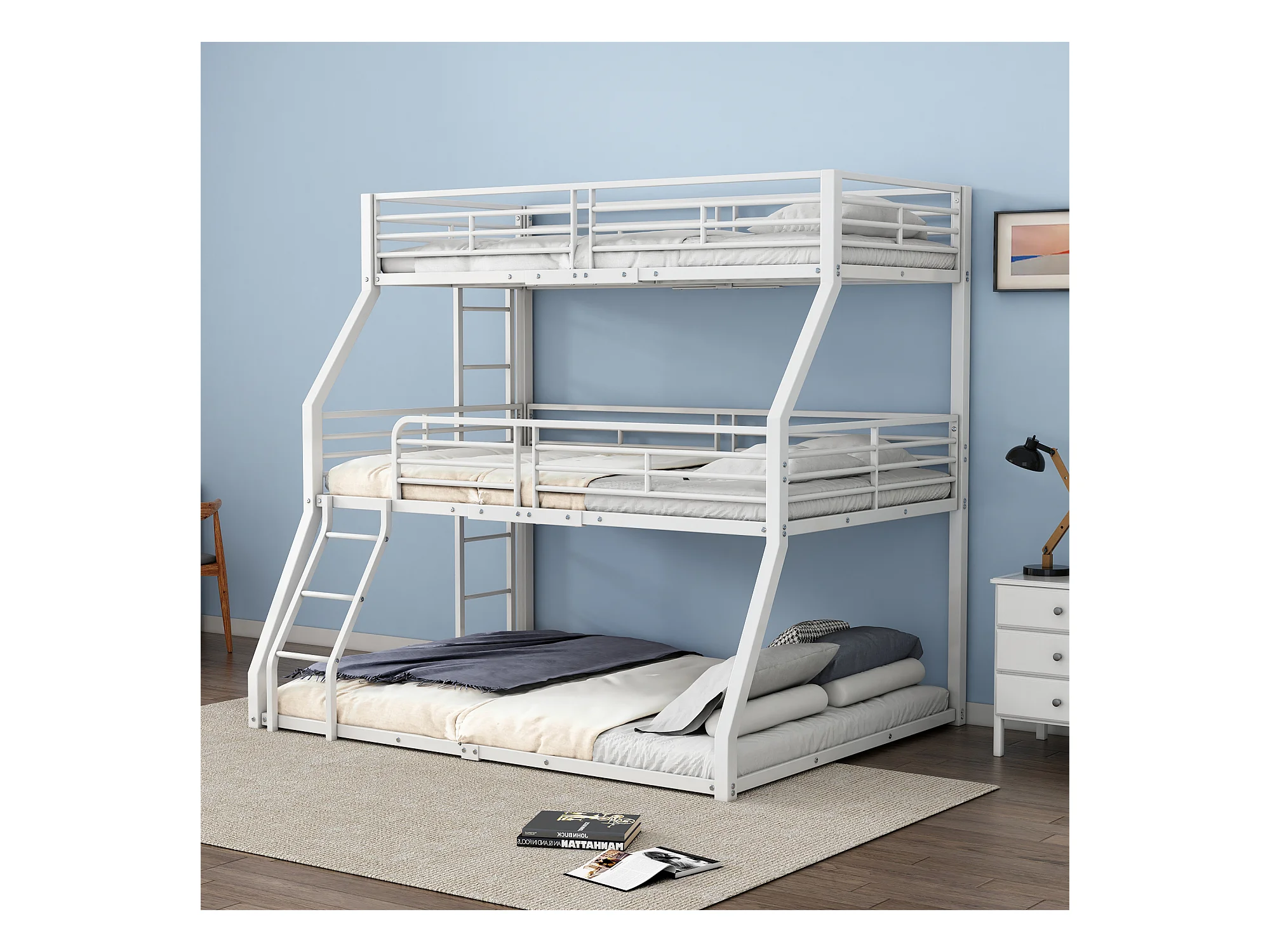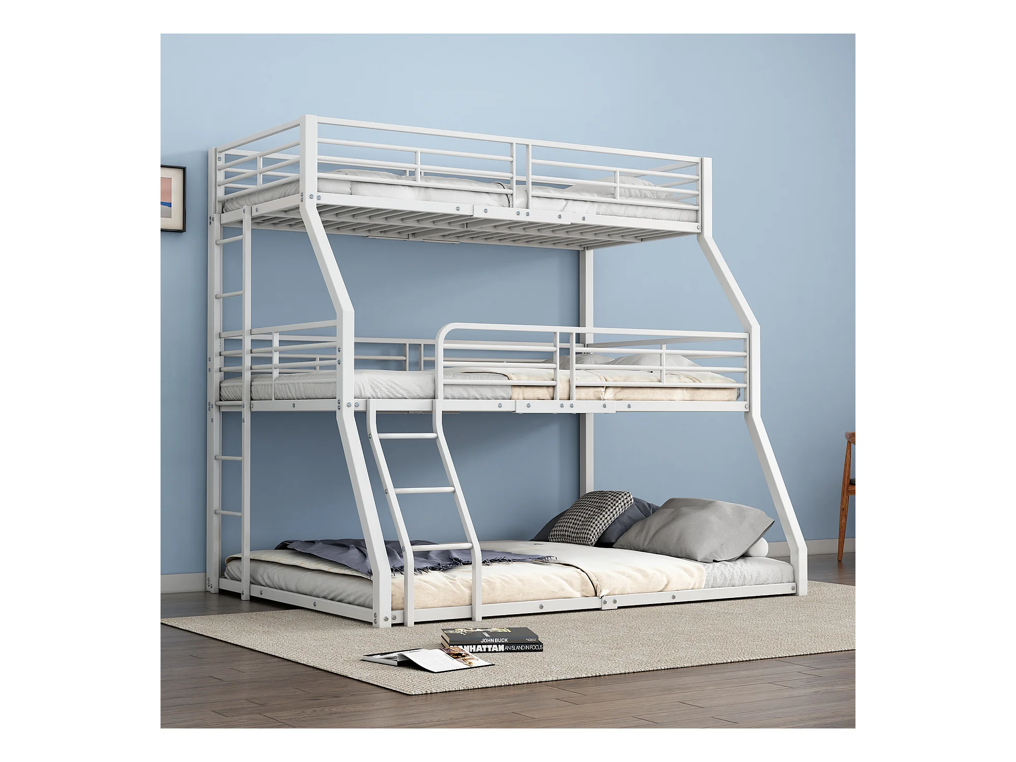Lits superposés triples 90/120/140 x 200 cm avec 2 échelles - Métal - Sommier à lattes - Blanc (sans matelas)