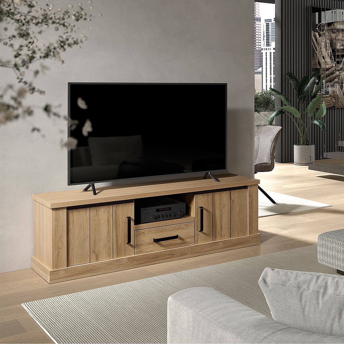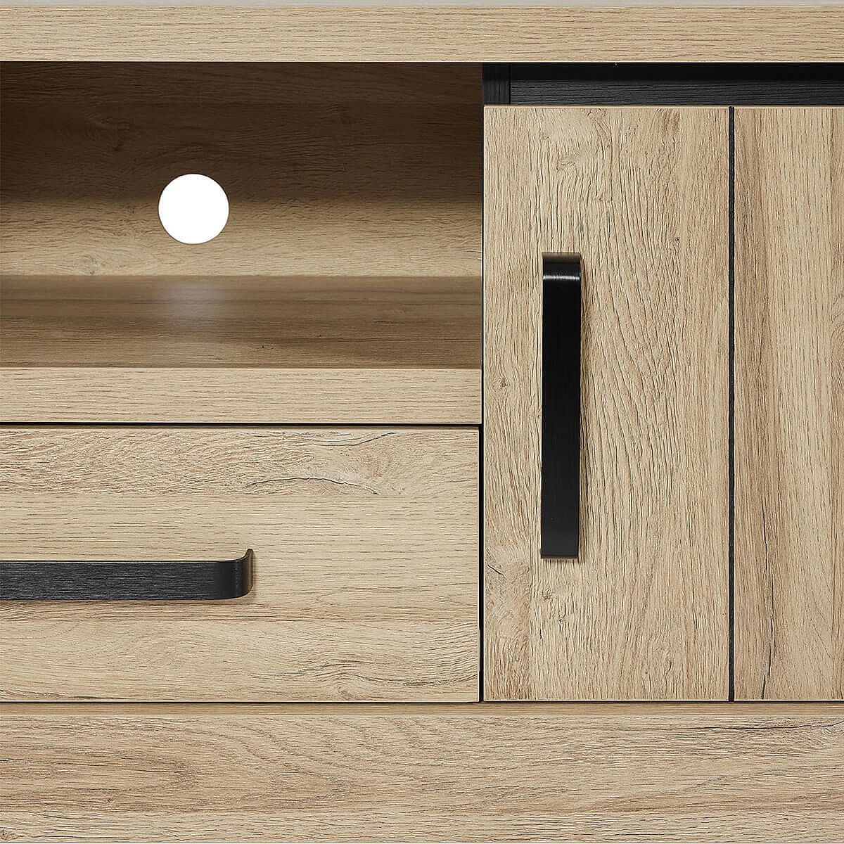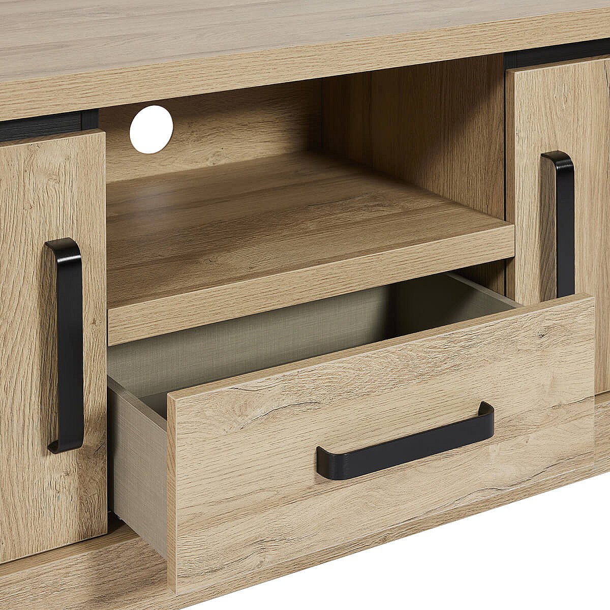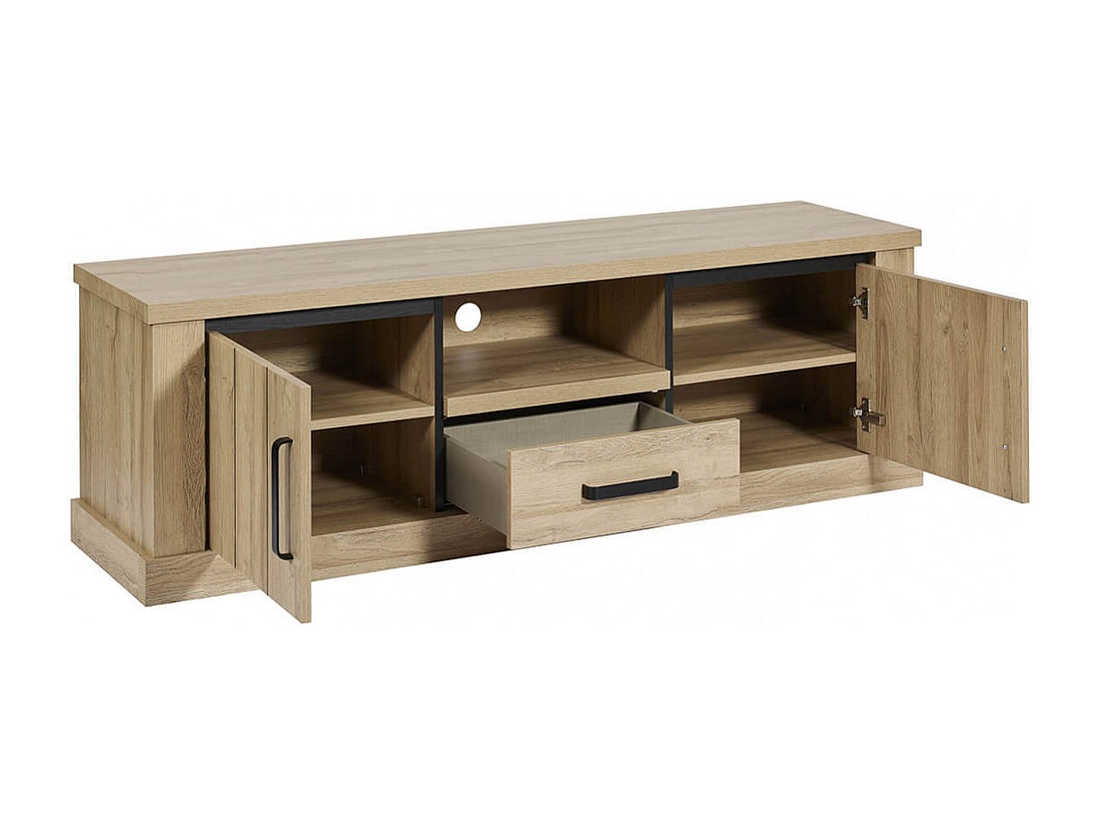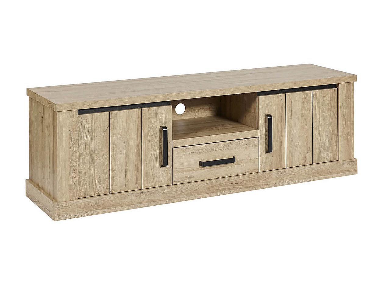 LORENZO - Meuble TV 2 Portes 1 Tiroirs Aspect Bois Chêne Clair Finition Frank