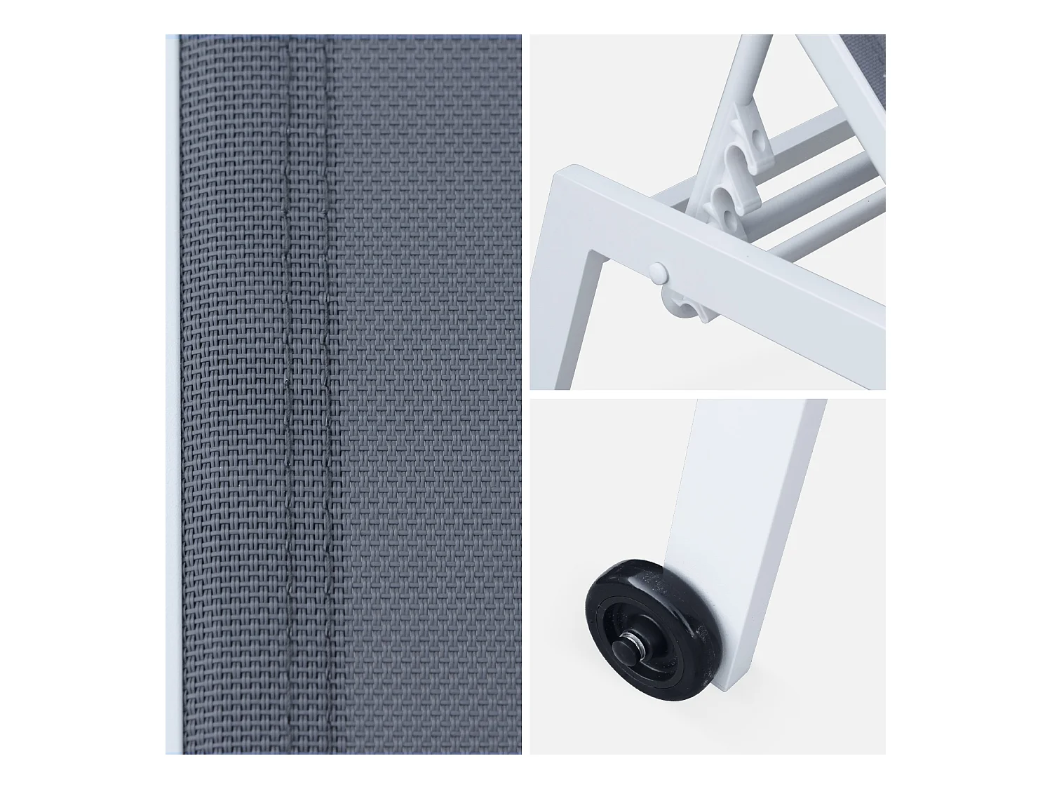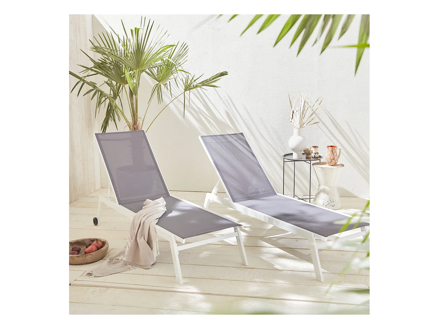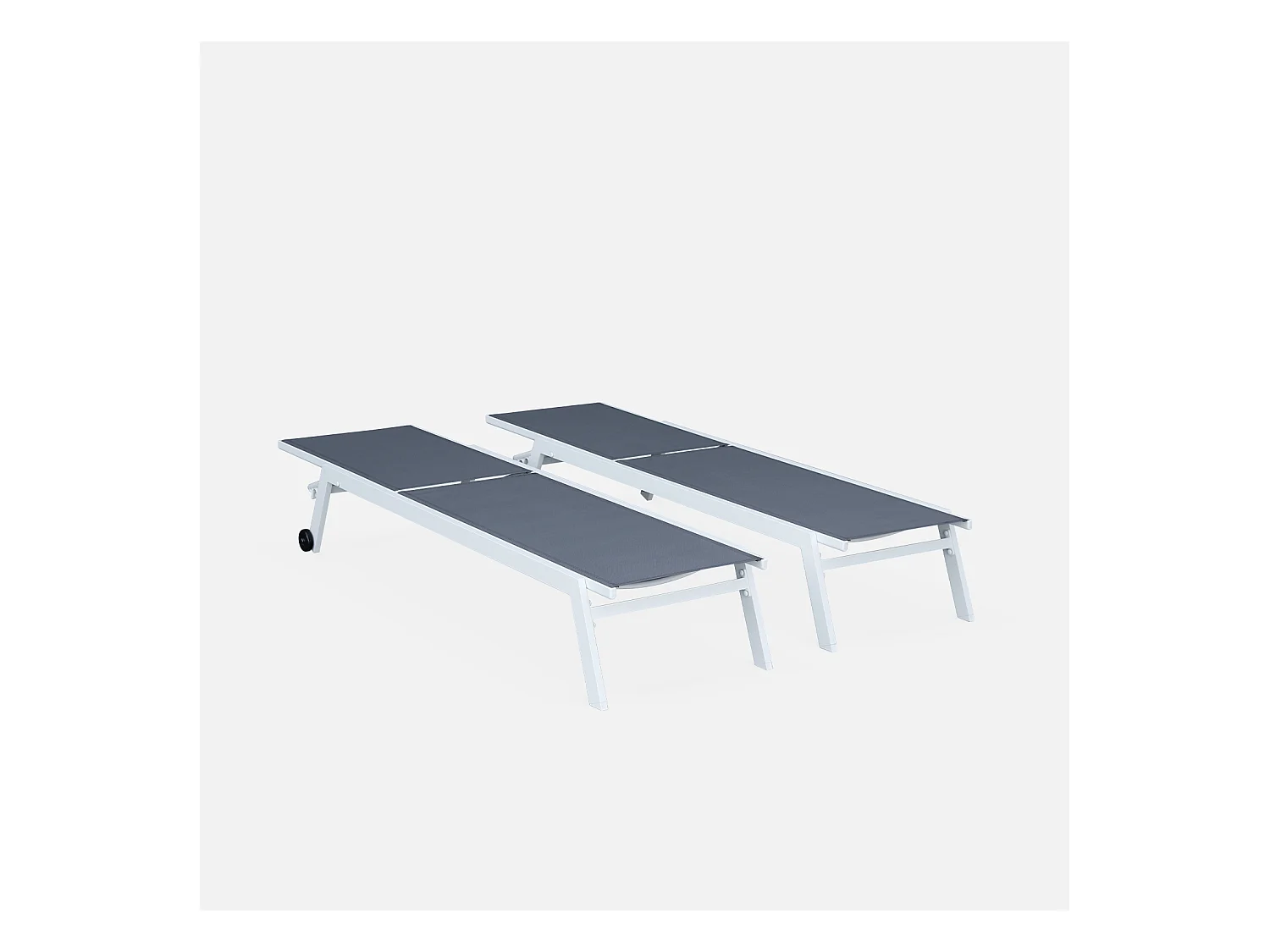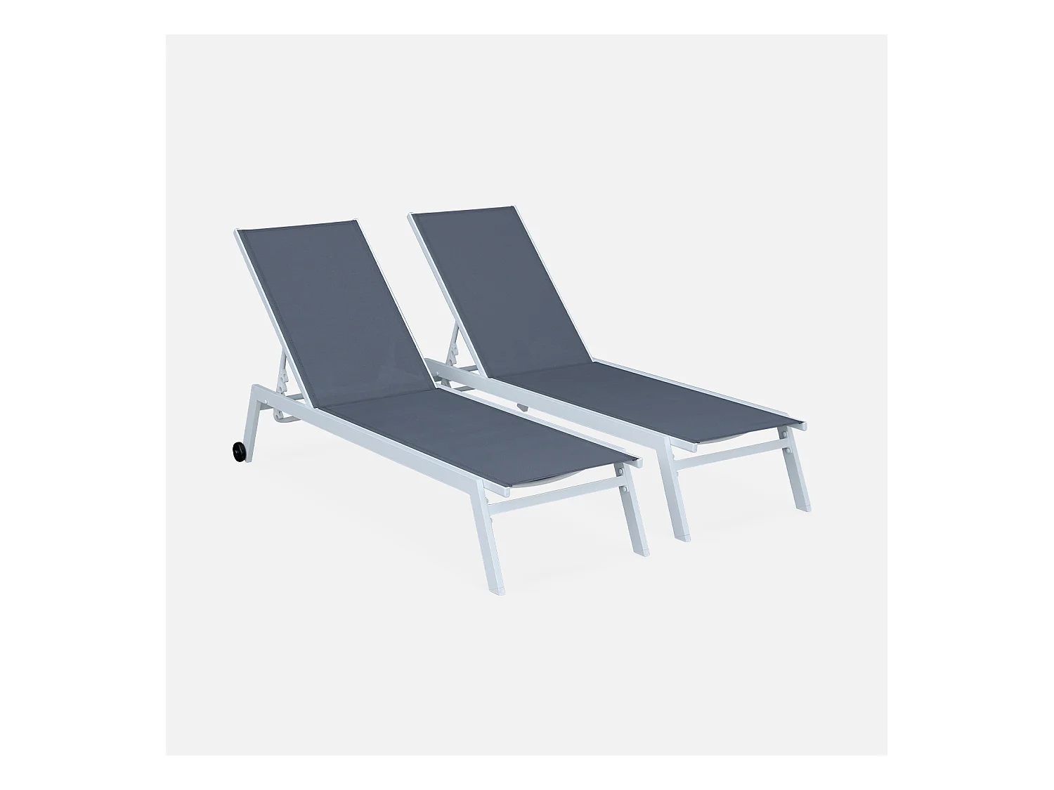 Lot de 2 bains de soleil ELSA en aluminium blanc et textilène gris. transats multi positions avec roulettes