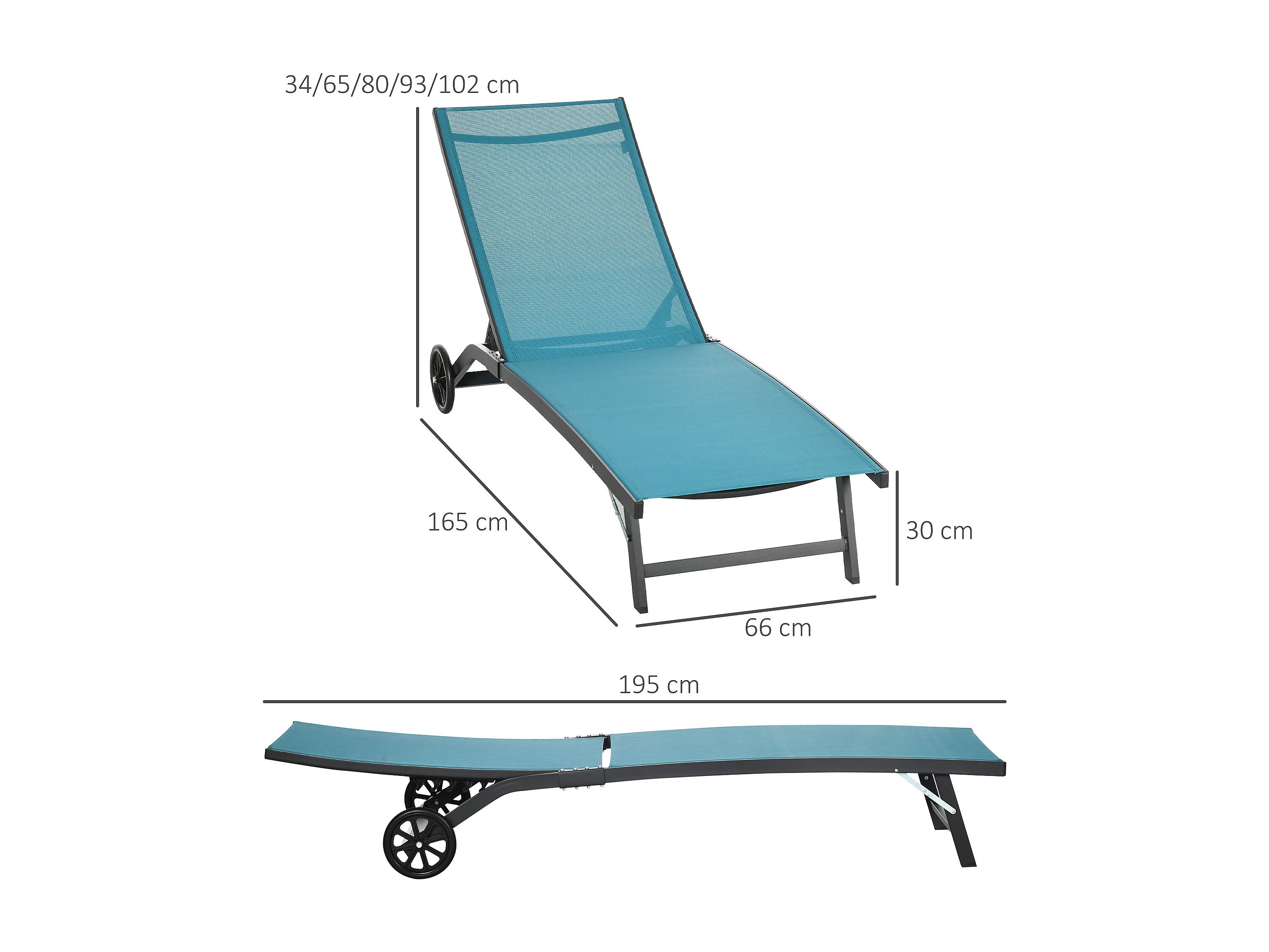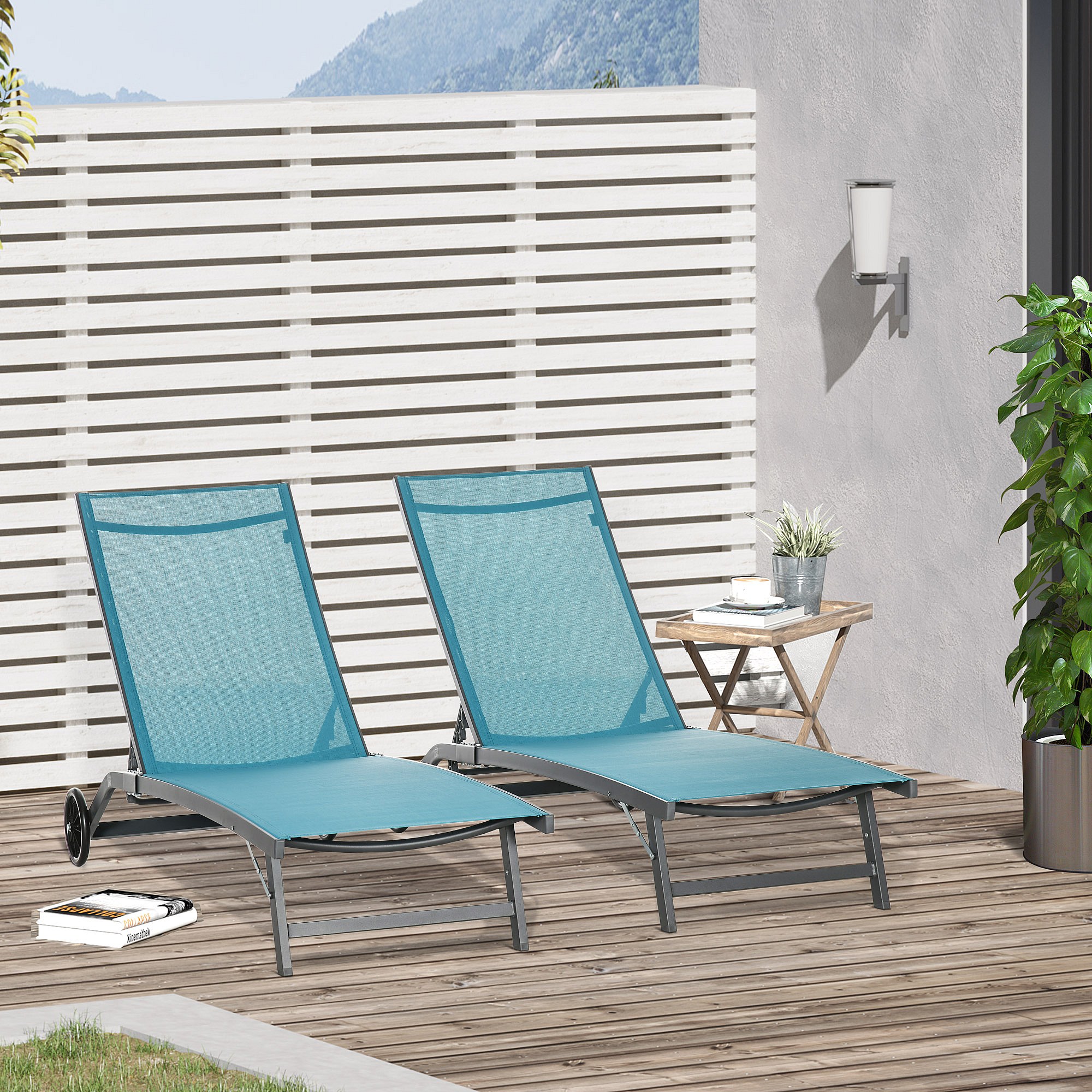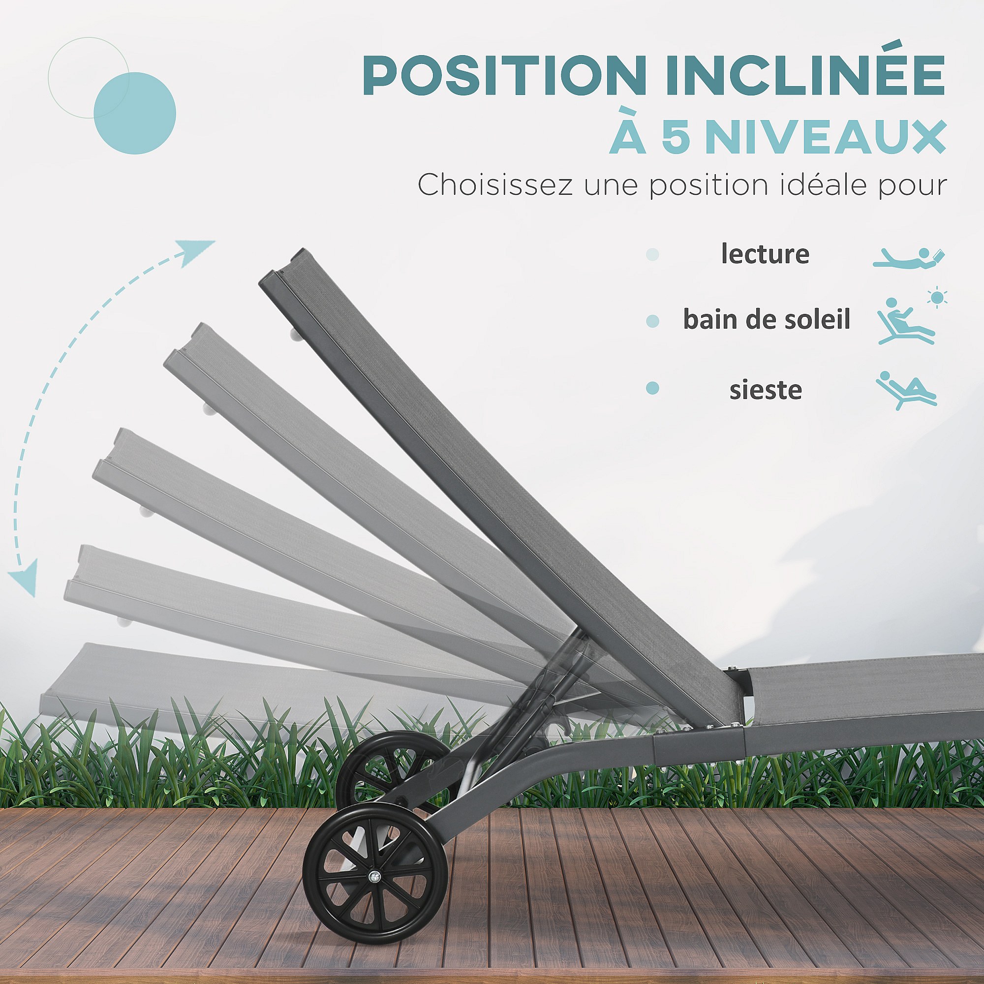 Lot de 2 bains de soleil transats inclinables - 2 roulettes - alu. textilène bleu
