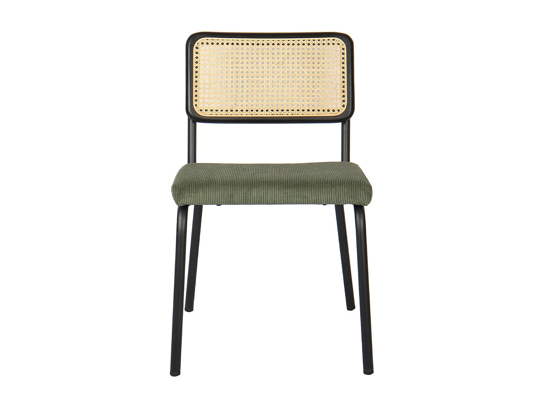 Lot de 2 chaises en métal et bois noir, cannage naturel et velours côtelé vert - Paula