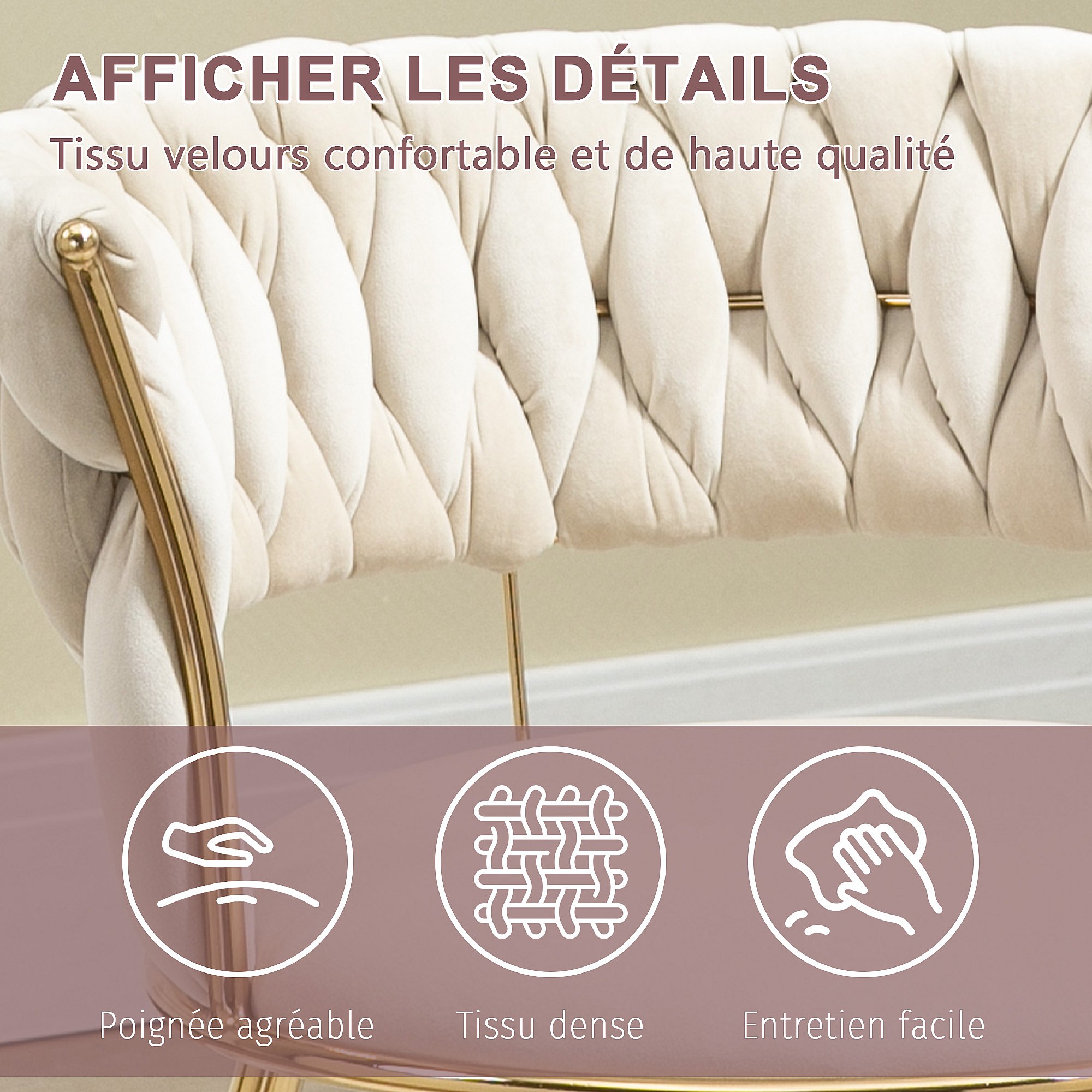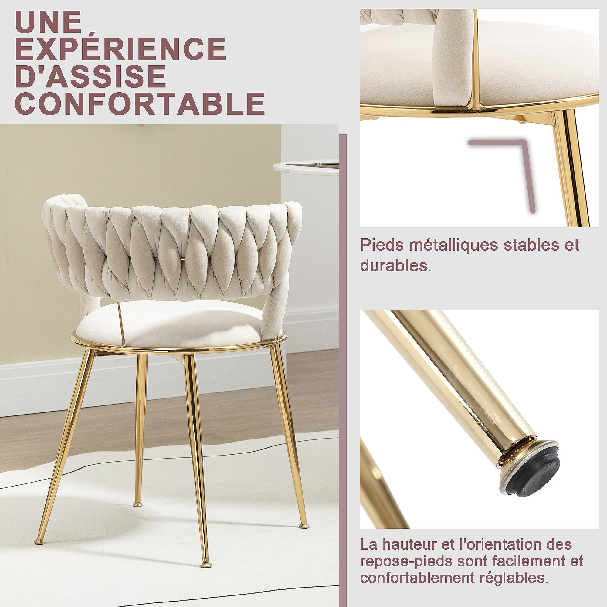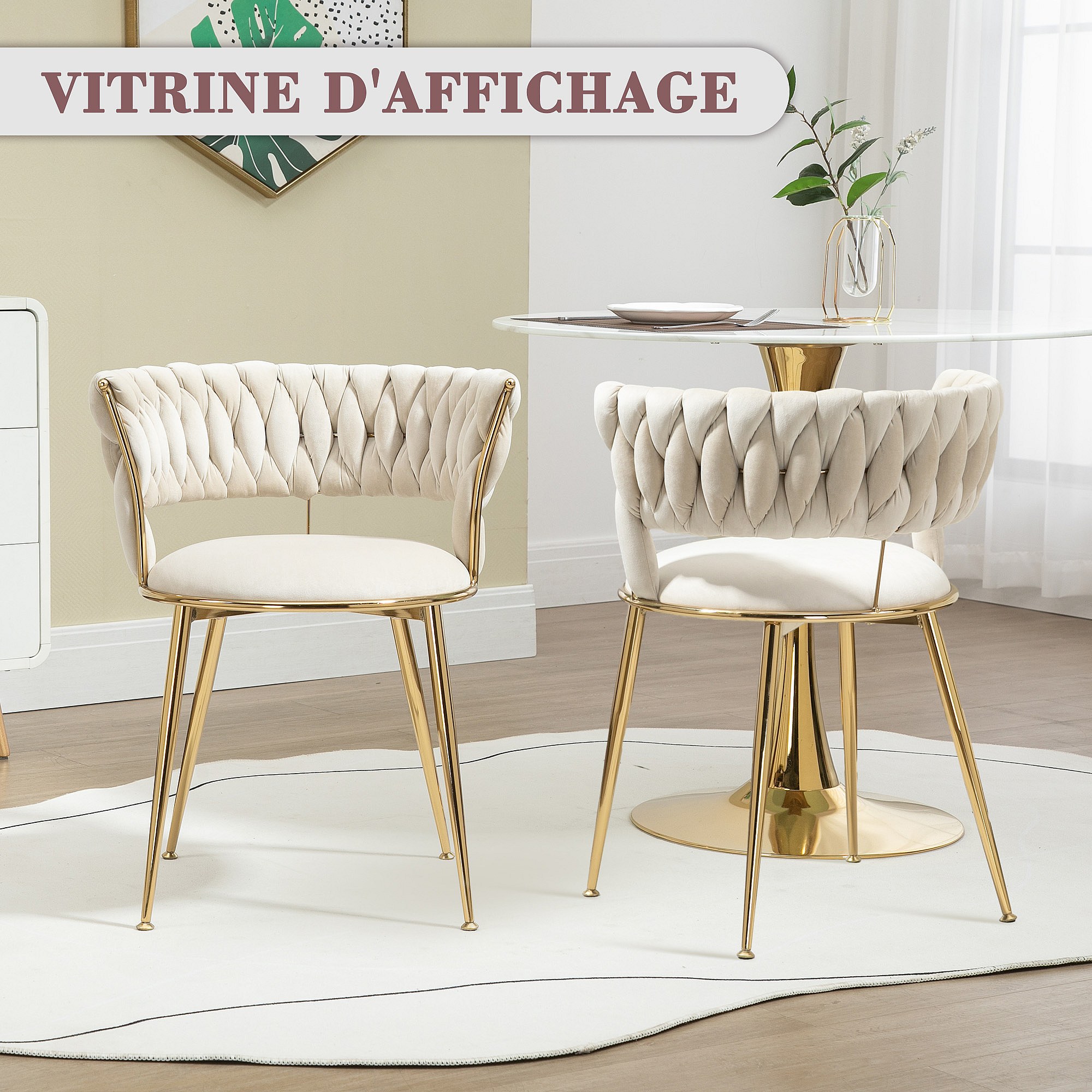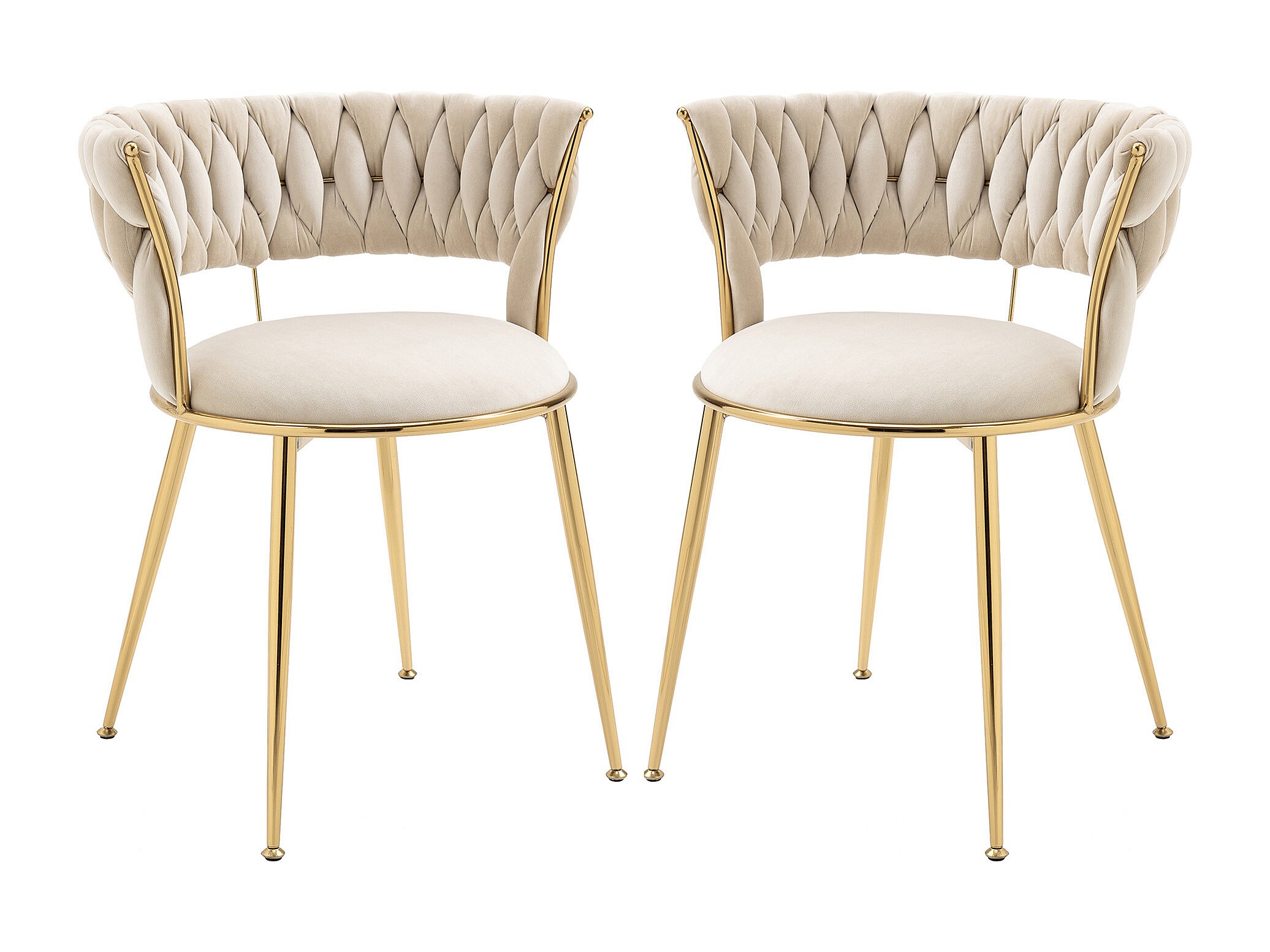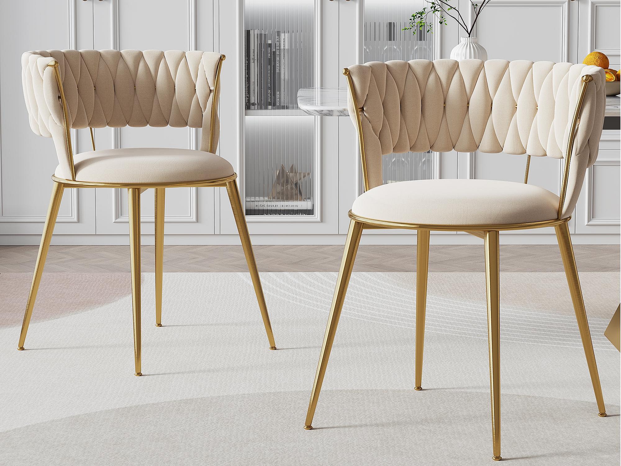 Lot de 2 chaises en velours ivoire - dossier ajouré tressé et pieds dorés - Idéales pour intérieur chic et contemporain