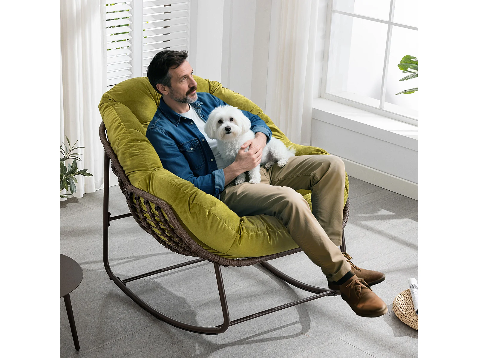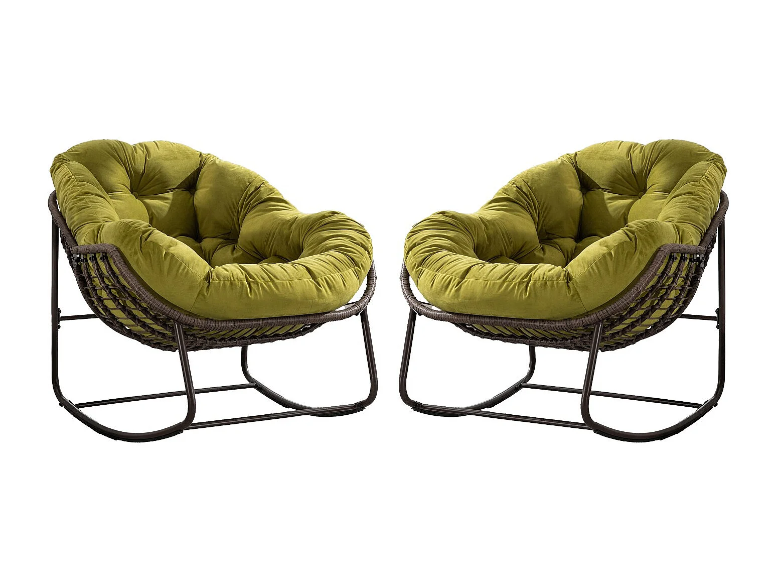 Lot de 2 Fauteuils à Bascule en Rotin Naturel – Forme Œuf et Coussins Vert amande – Confortable pour Salon, Véranda ou Chambre