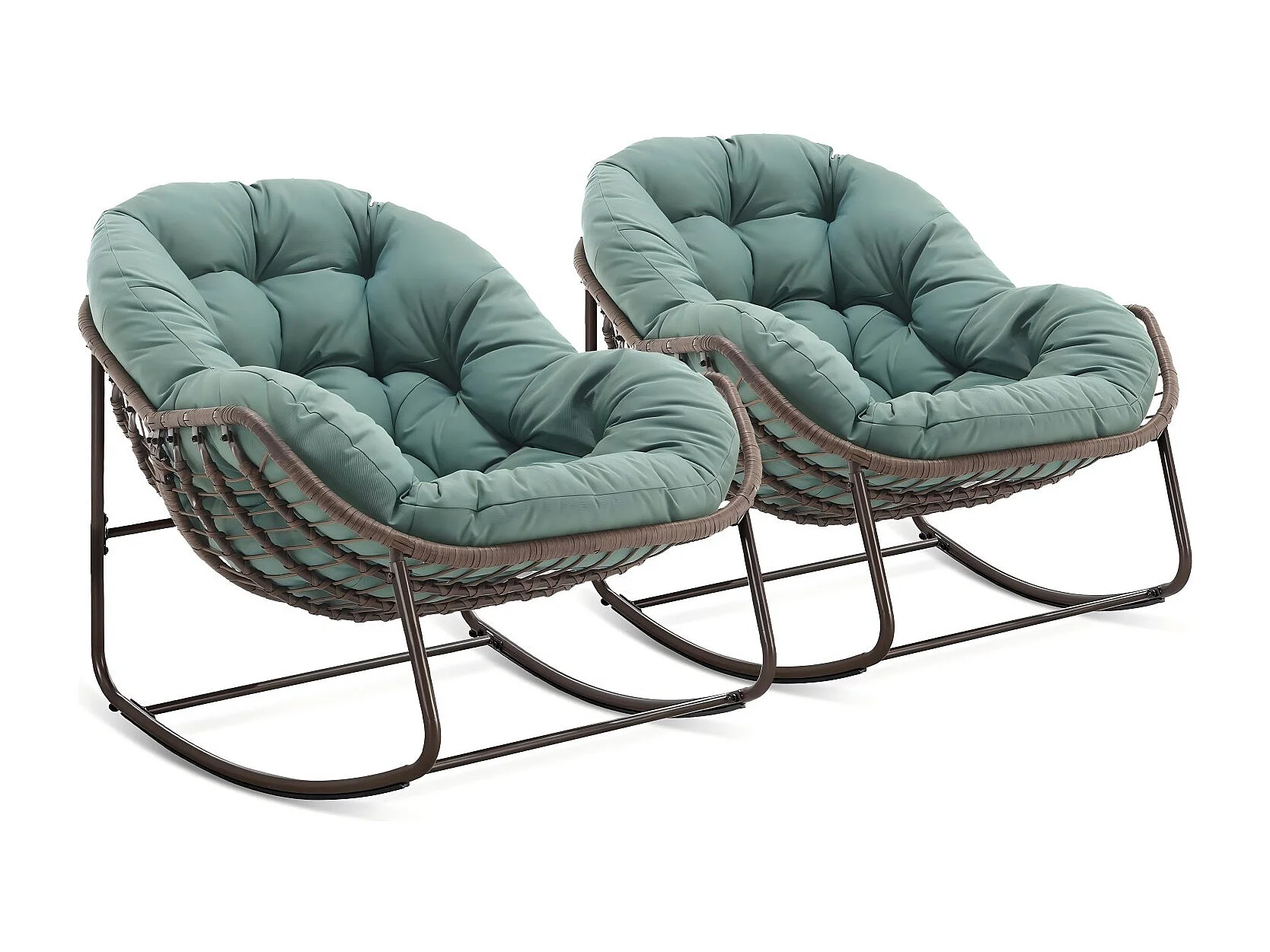 Lot de 2 Fauteuils à Bascule en Rotin Naturel – Forme Œuf et Coussins Vert Clair – Confortable pour Salon, Véranda ou Chambre