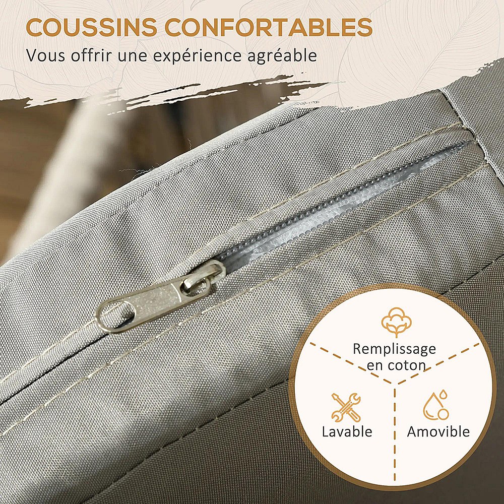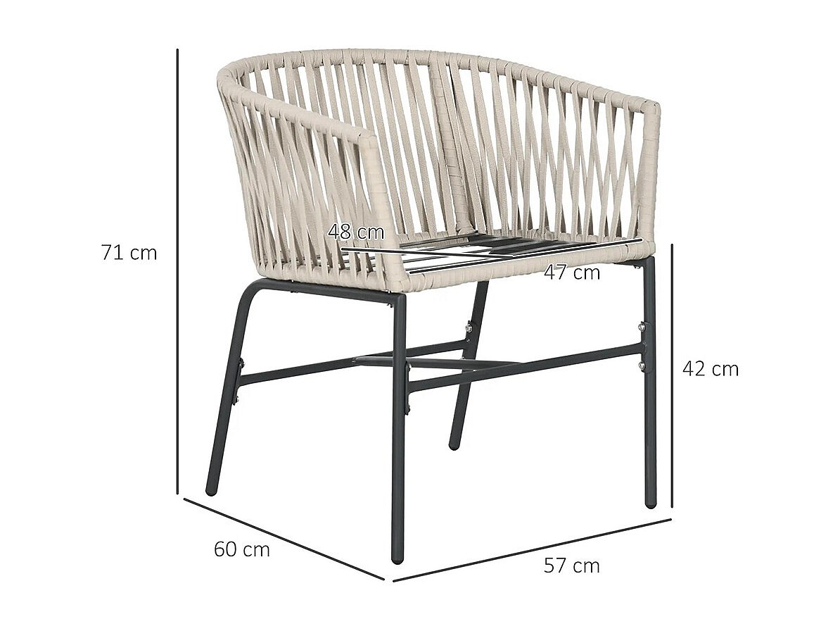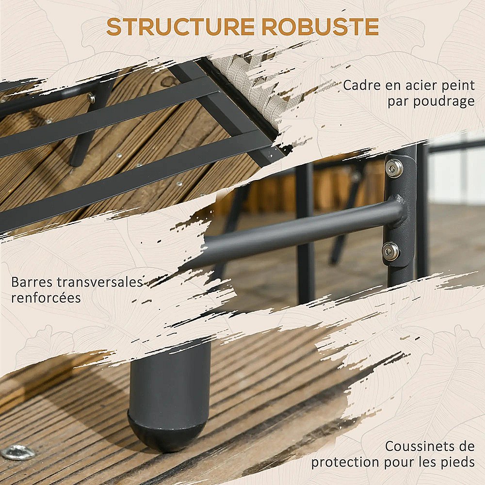 Lot de 2 fauteuils chaises de jardin 2 places et métal et corde PE avec coussins noir et gris