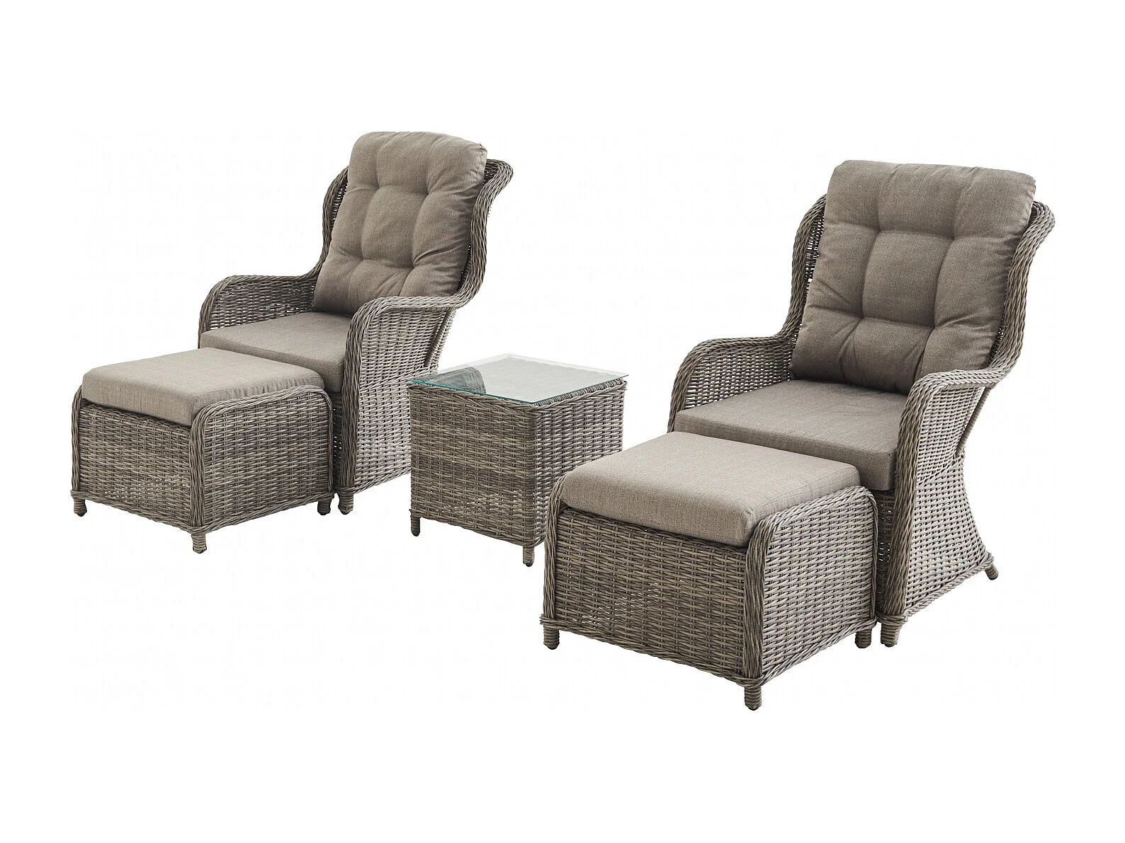 Lot de 2 fauteuils relax en résine tressée arrondie avec repose pieds et table basse - Barletta Gris - Aspect rotin. coussins beige. structure aluminium