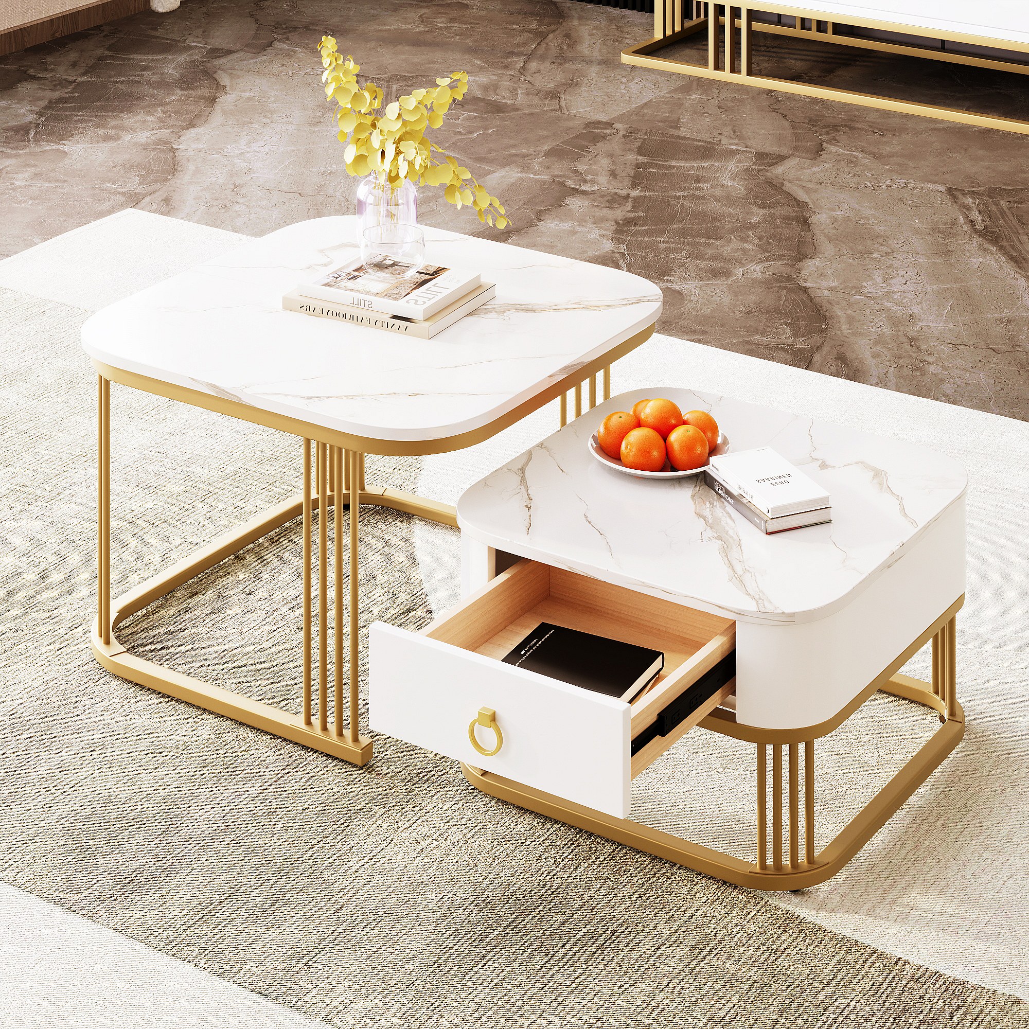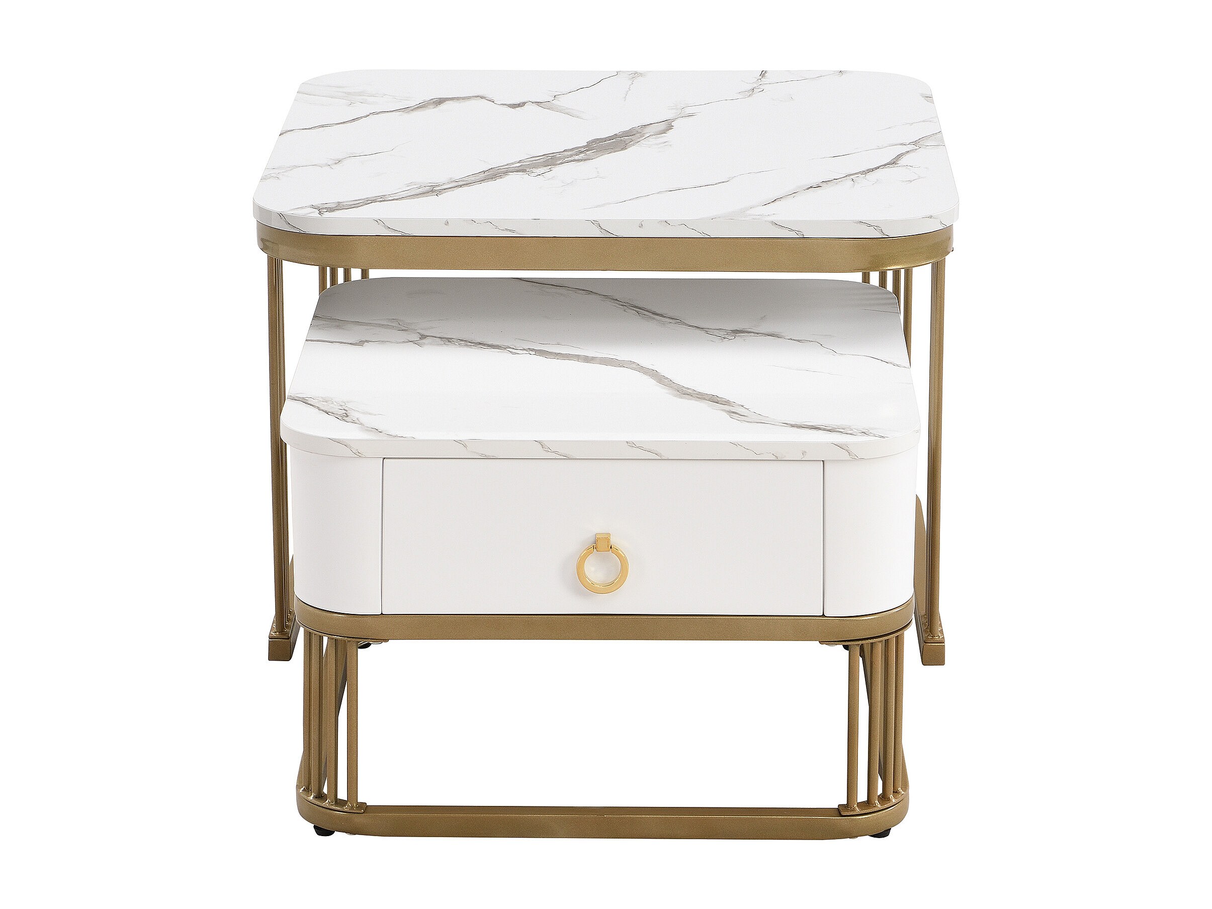 Lot de 2 tables basses carrées empilables avec tiroir, placage de marbre blanc, cadre doré