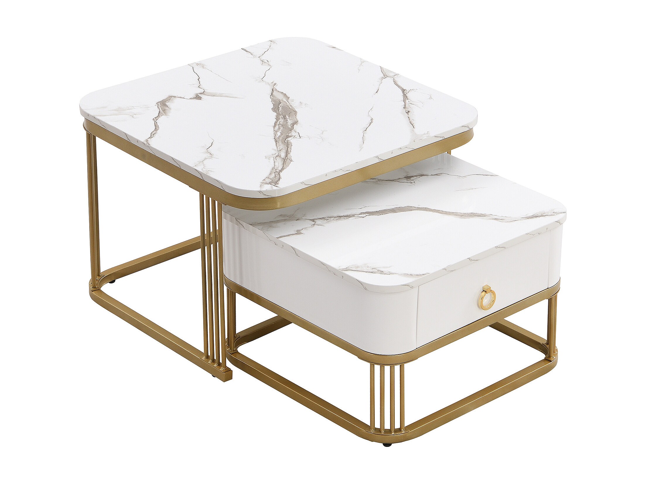 Lot de 2 tables basses gigognes avec 1 tiroirs, table basse carrée - plateaux en aspect marbre - bois et métal - Blanc brillant