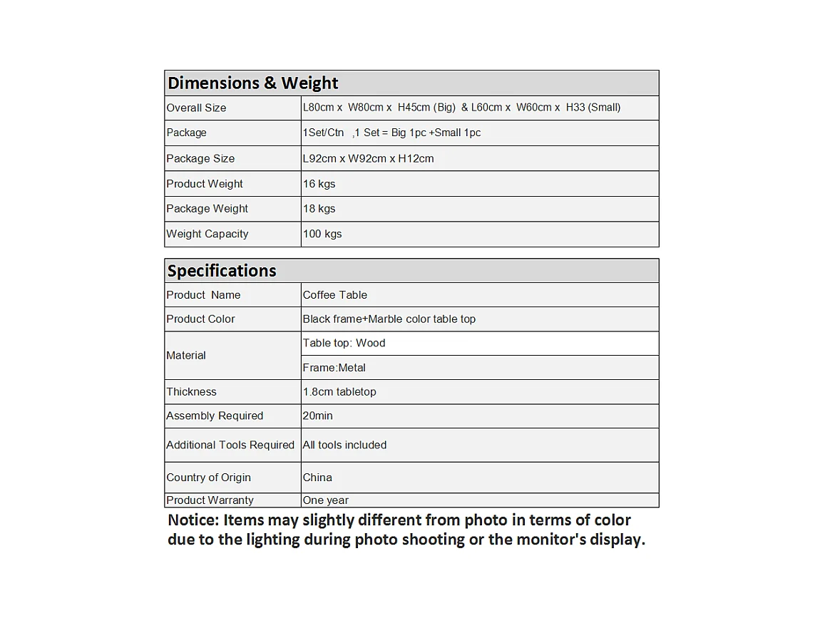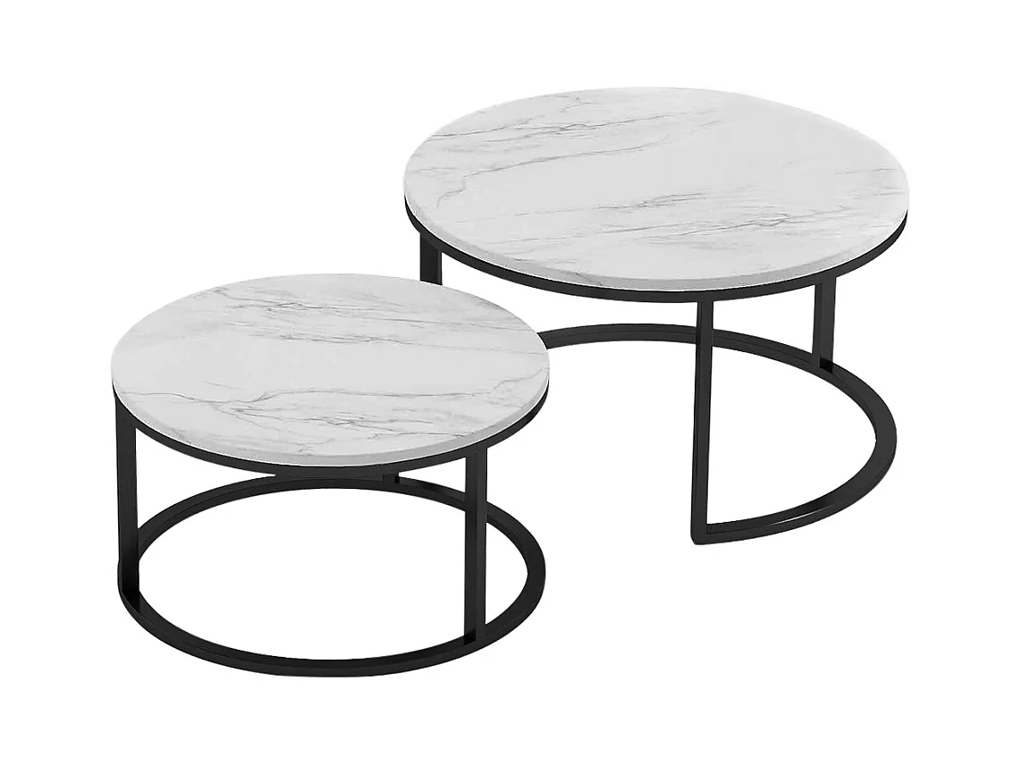 Lot de 2 Tables Basses gigognes, avec marbré brillant, Noir et Blanc