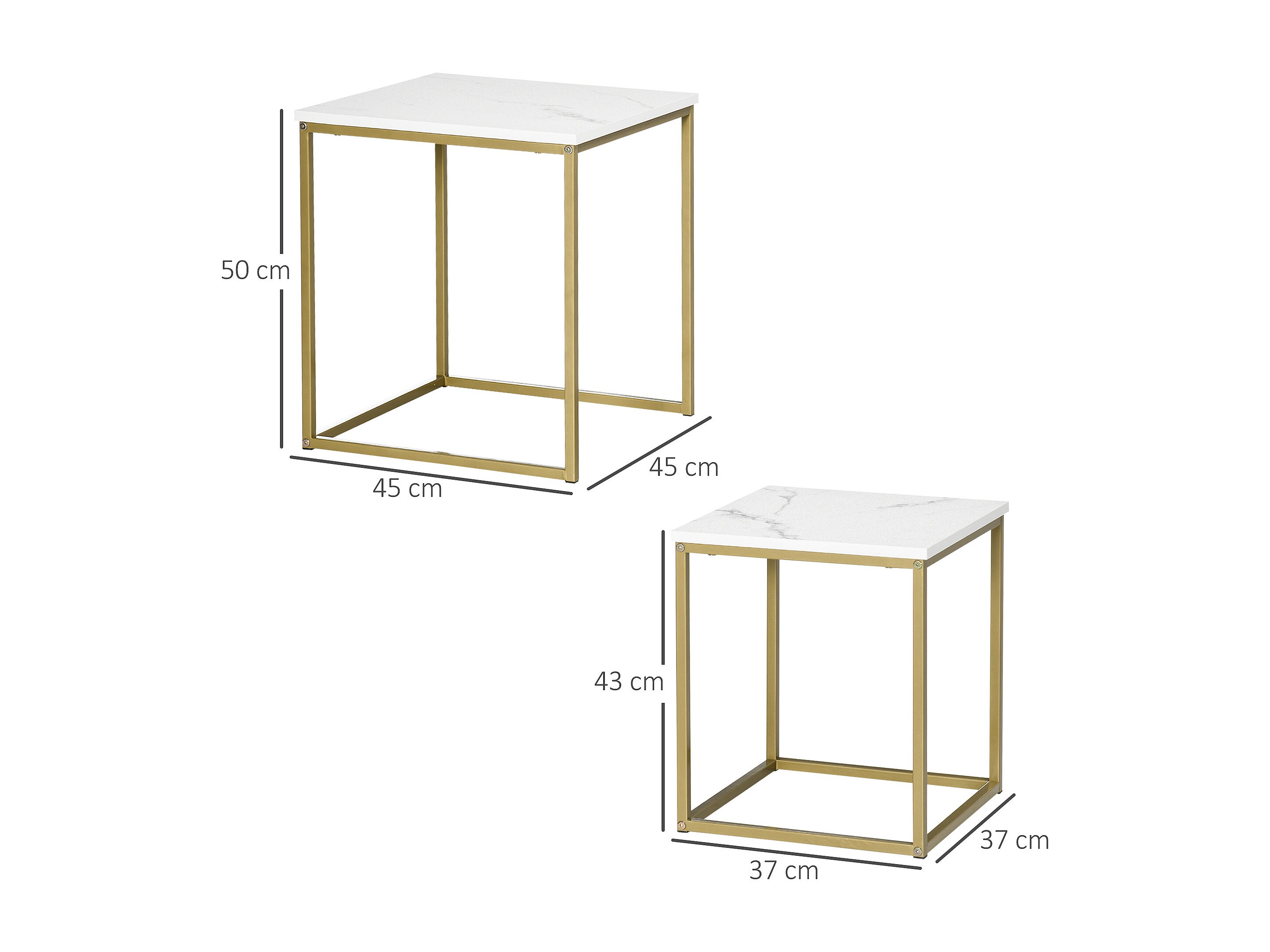 Lot de 2 tables basses gigognes carrées style art déco - acier doré panneaux aspect marbre blanc