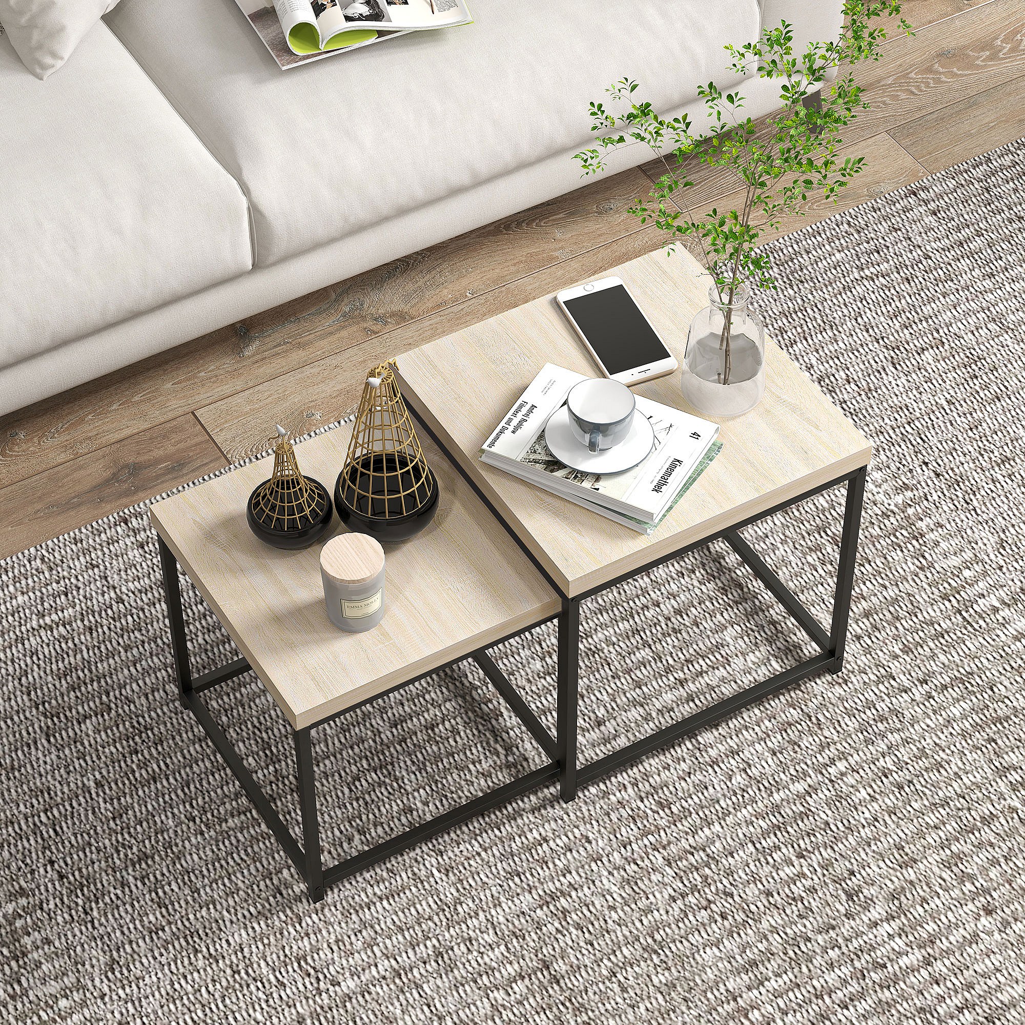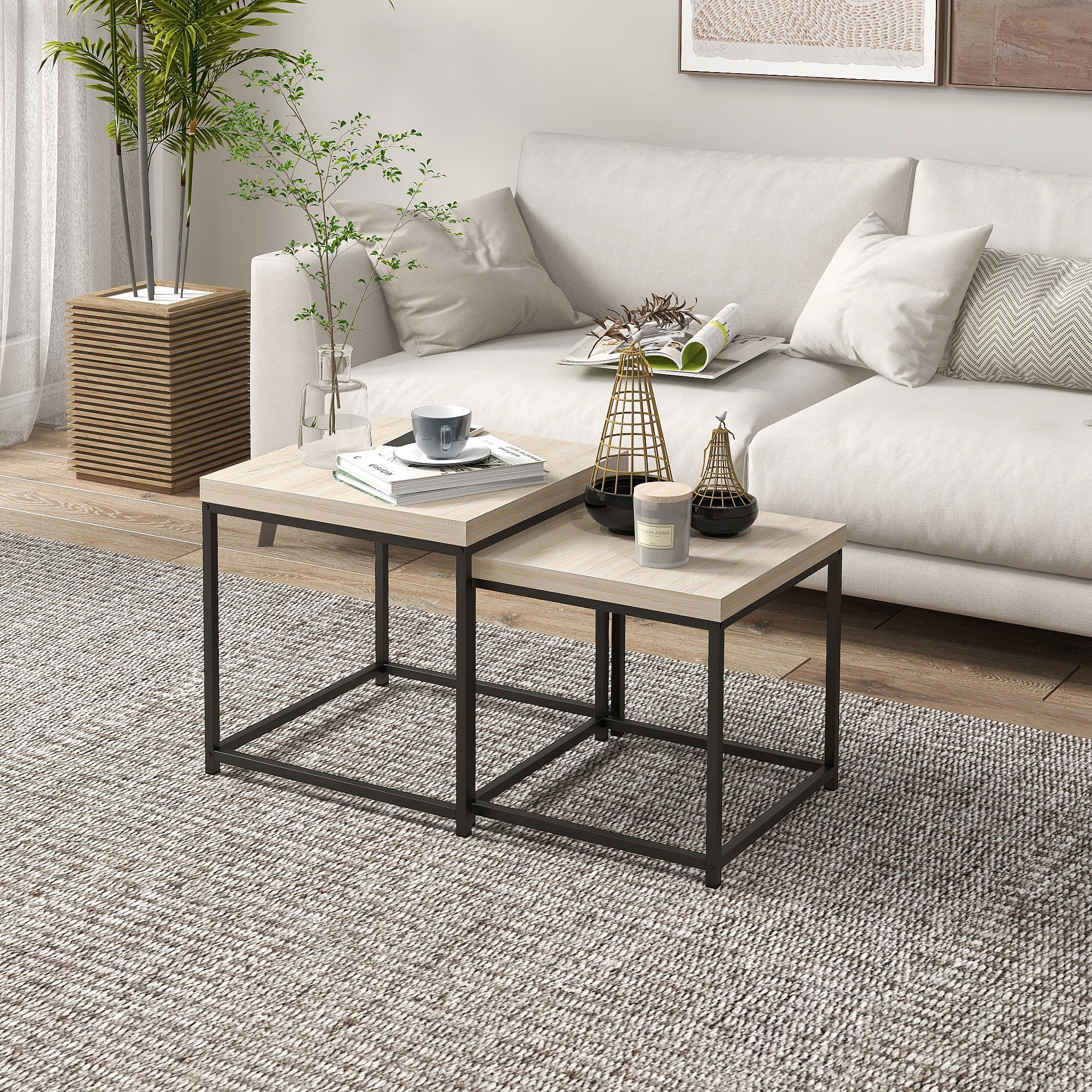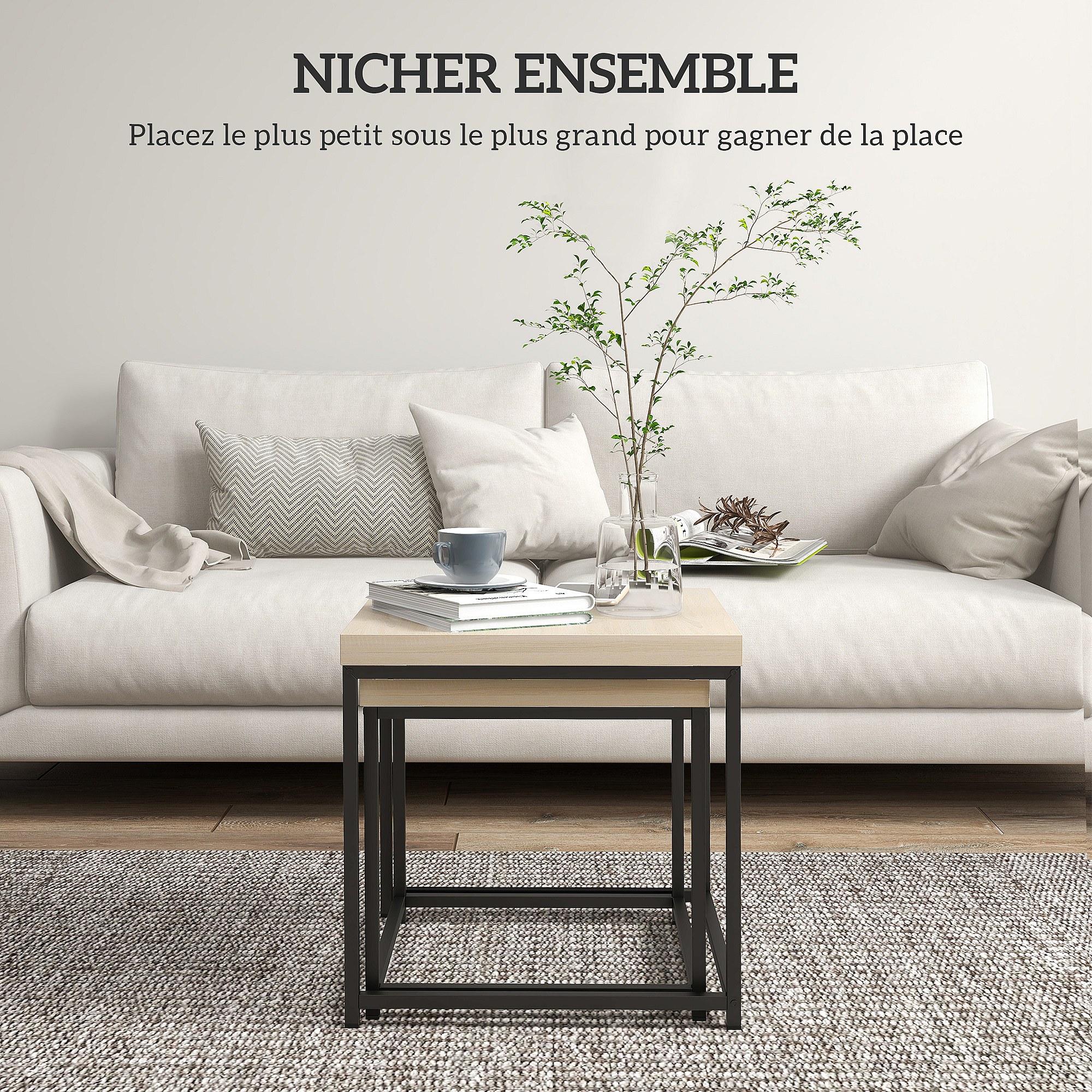 Lot de 2 tables basses gigognes carrées style contemporain - acier noir panneaux aspect chêne clair