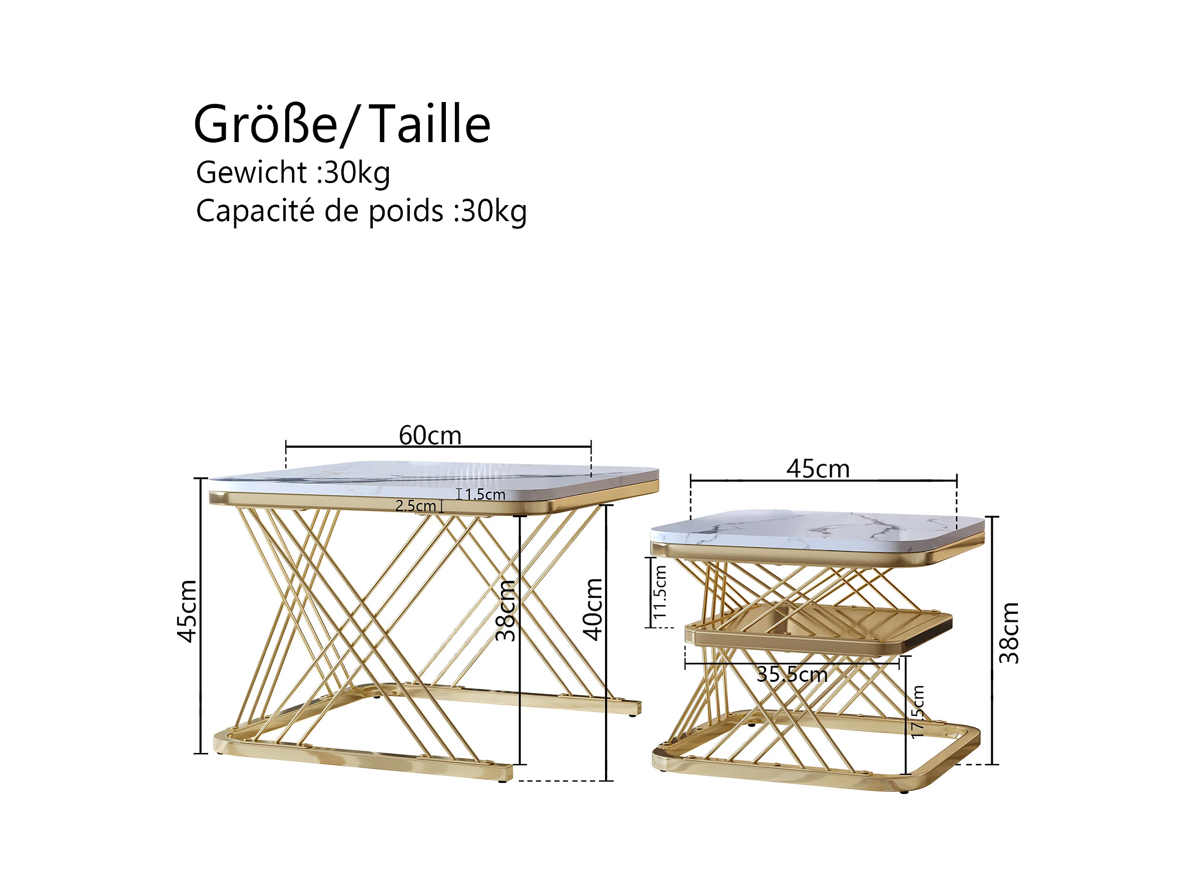 Table basse 2 pièces, design haut de gamme, MDF marbré brillant, pieds réglables, charge 30kg (60 x 60 x 45 cm & 45 x 45 x 40 cm)