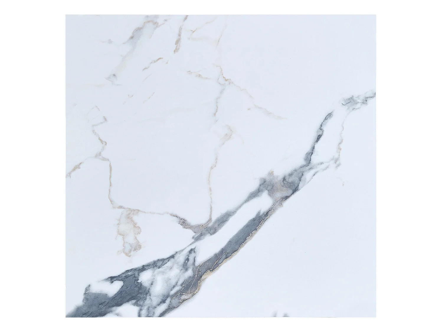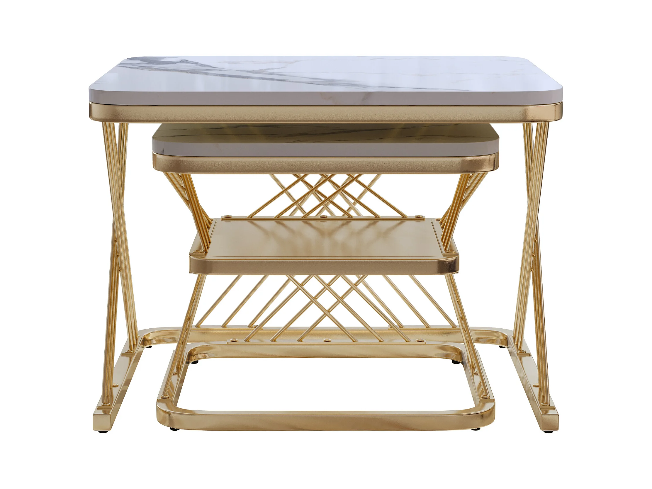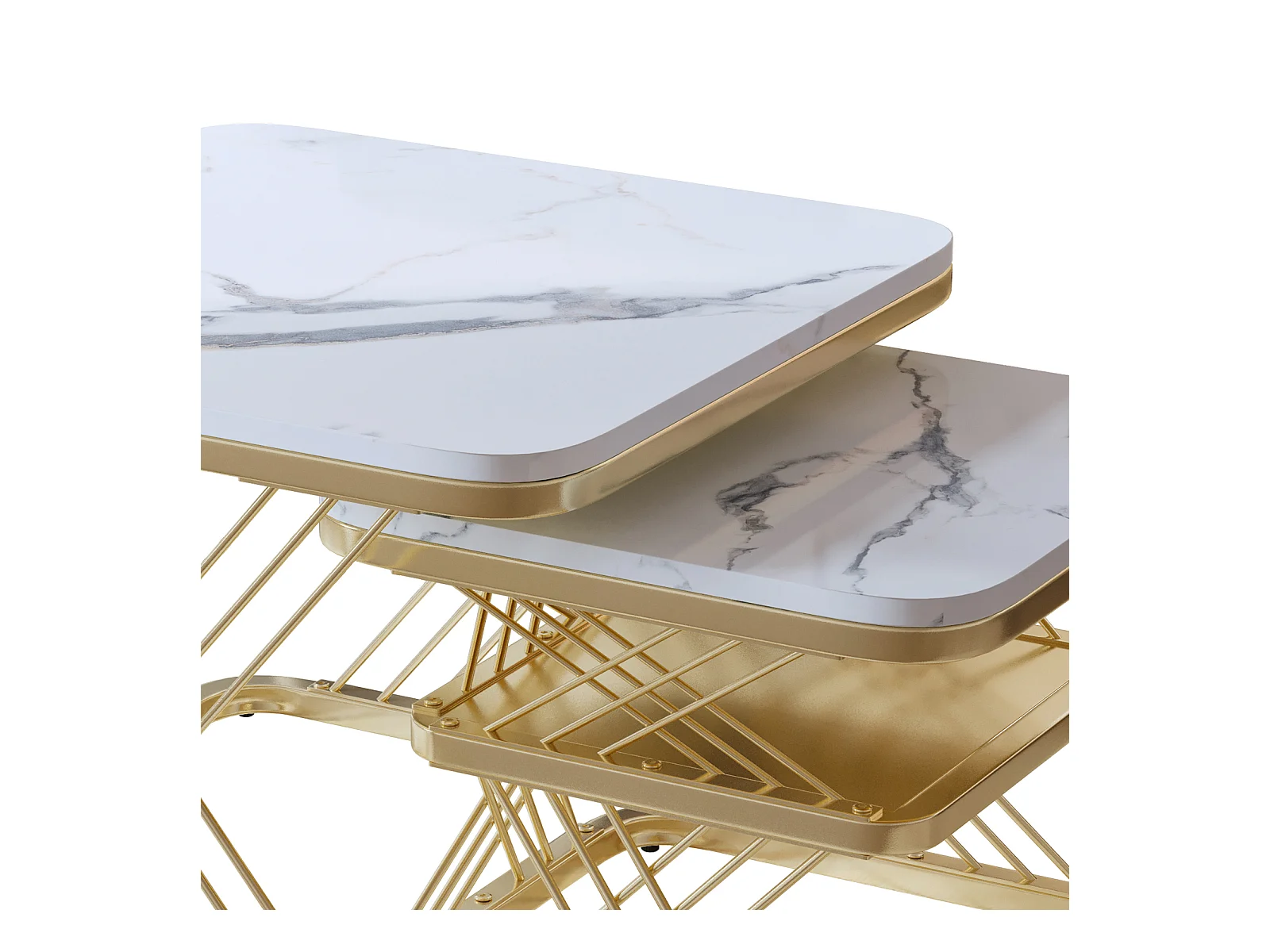 Lot de 2 tables basses gigognes carrées style art déco - acier doré panneaux aspect marbre blanc