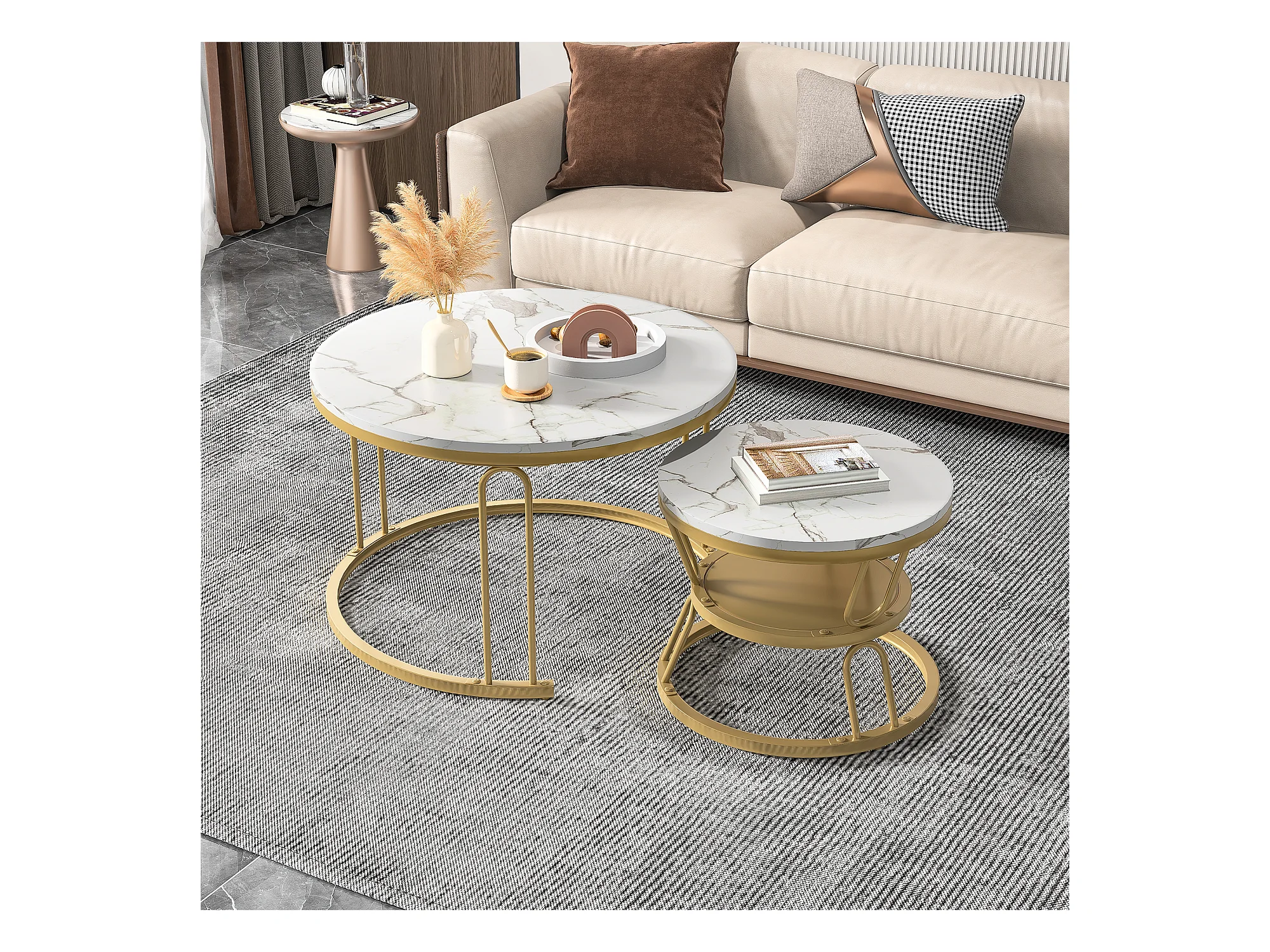 Lot de 2 Tables Basses gigognes, avec marbré brillant, Or et Blanc