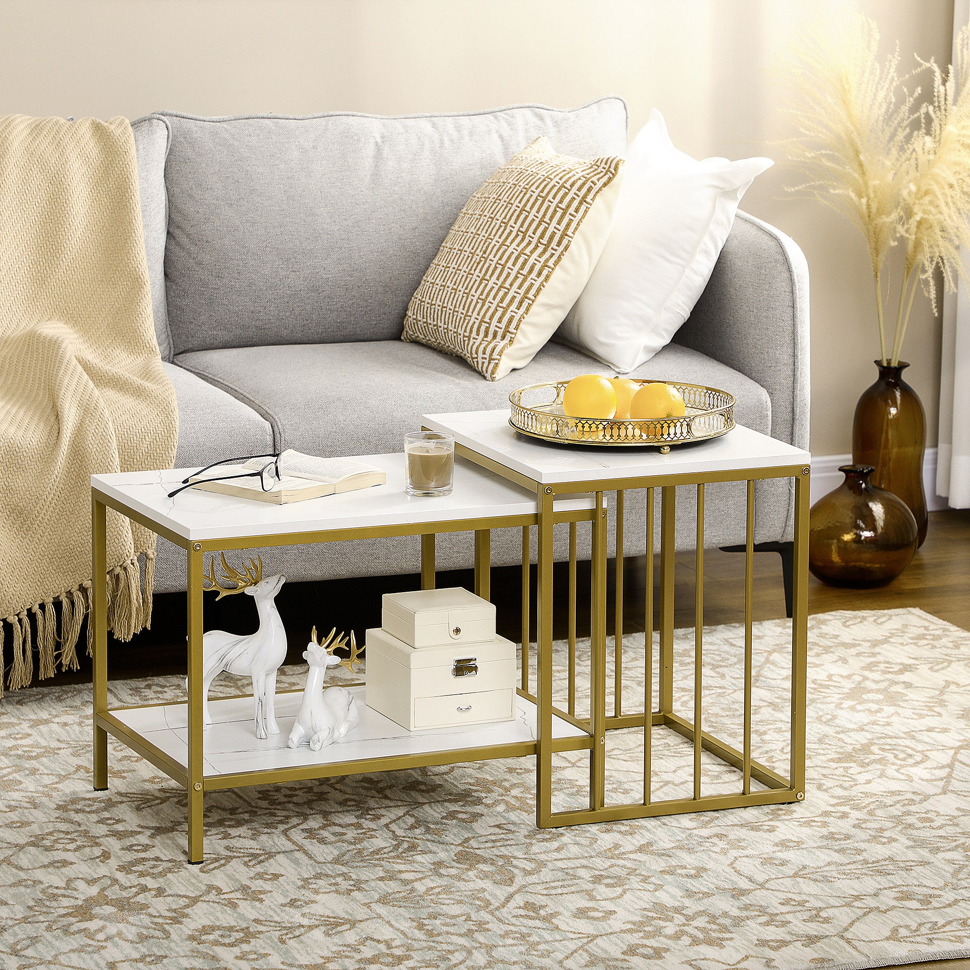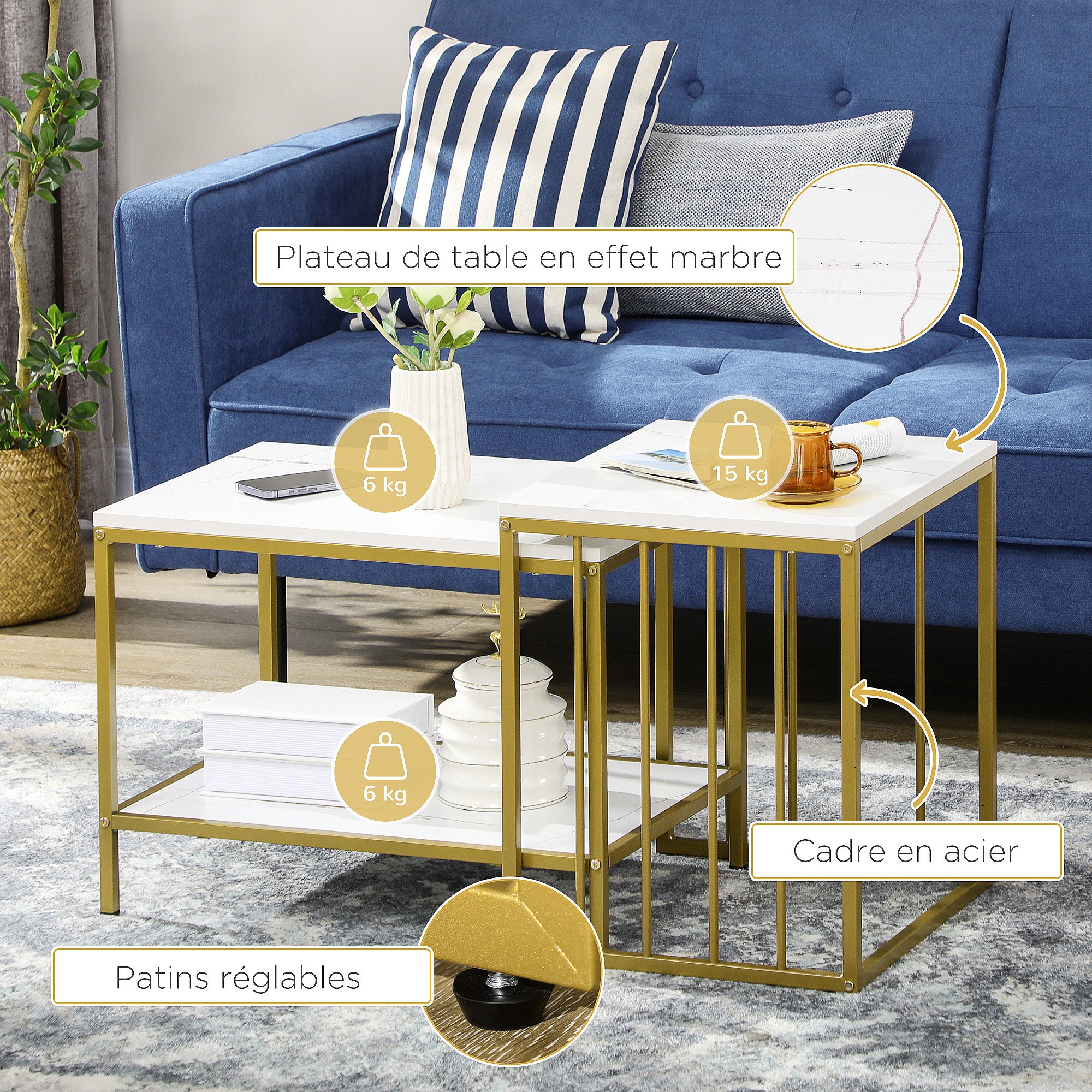 Lot de 2 tables basses gigognes carrées style art déco - acier doré panneaux aspect marbre blanc