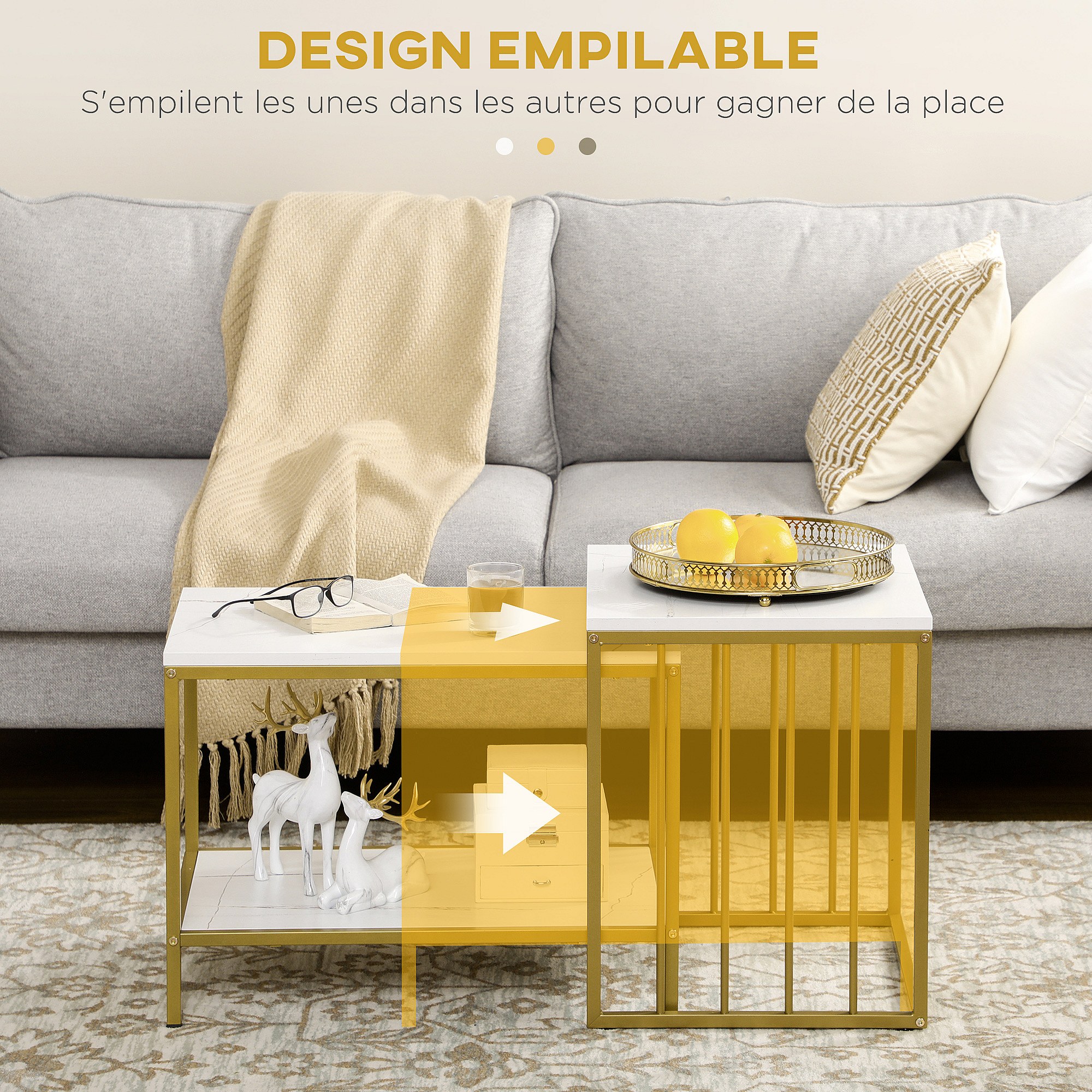 Lot de 2 tables basses gigognes - tables d'appoint rondes encastrables style néo-rétro bicolore structure métal doré plateau MDF aspect marbre blanc