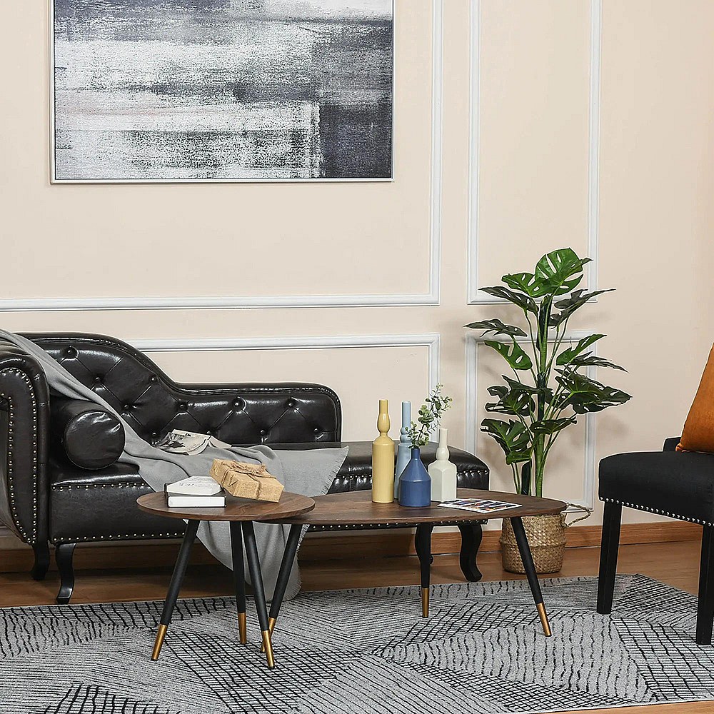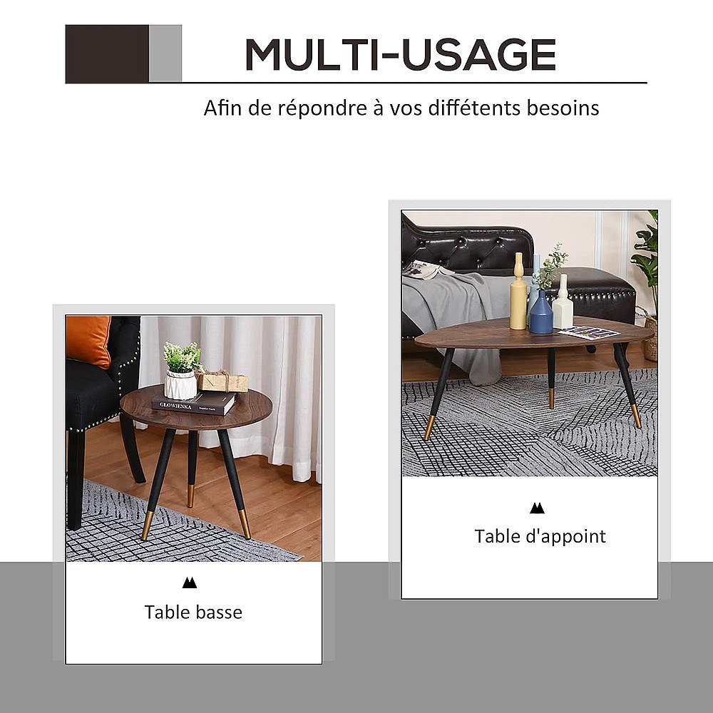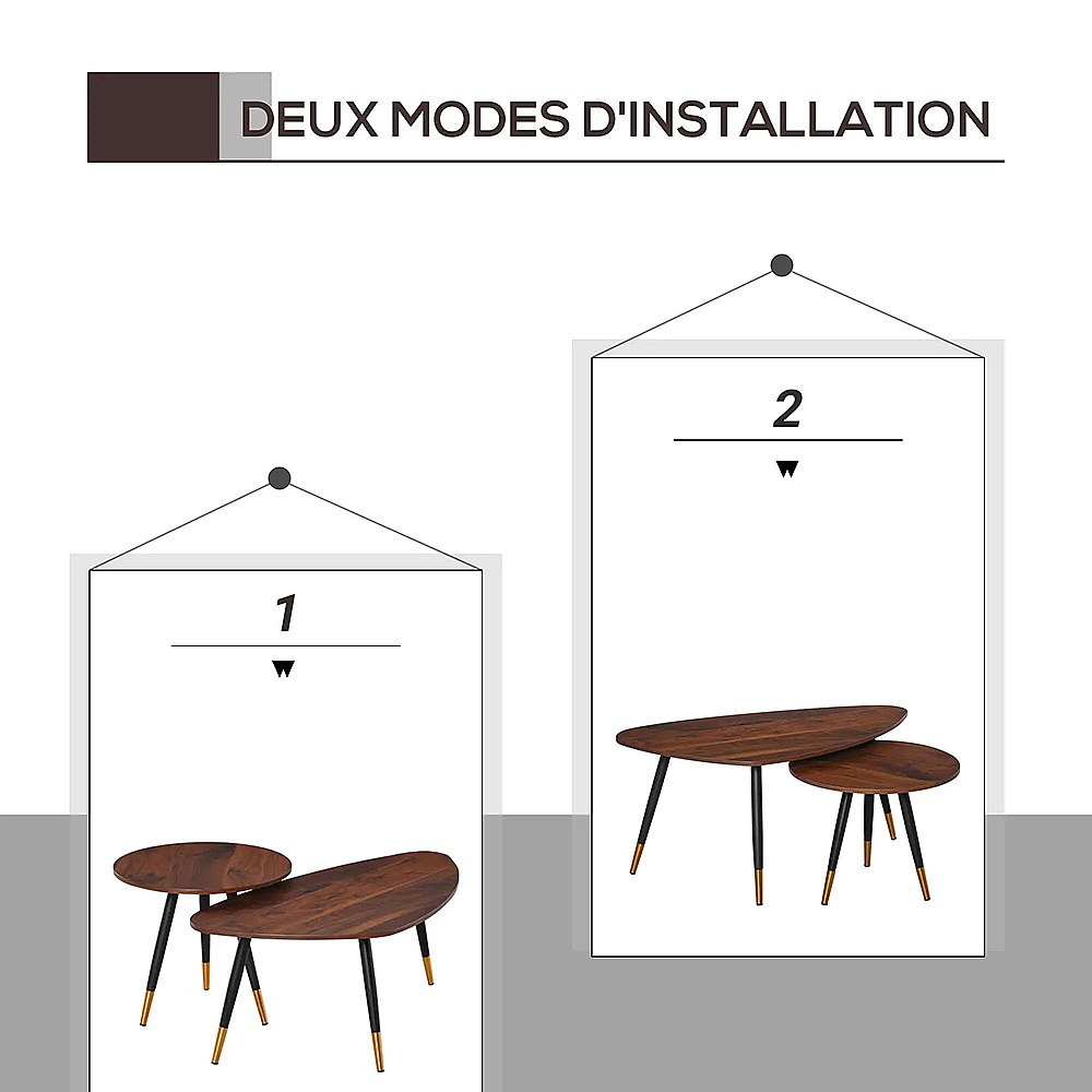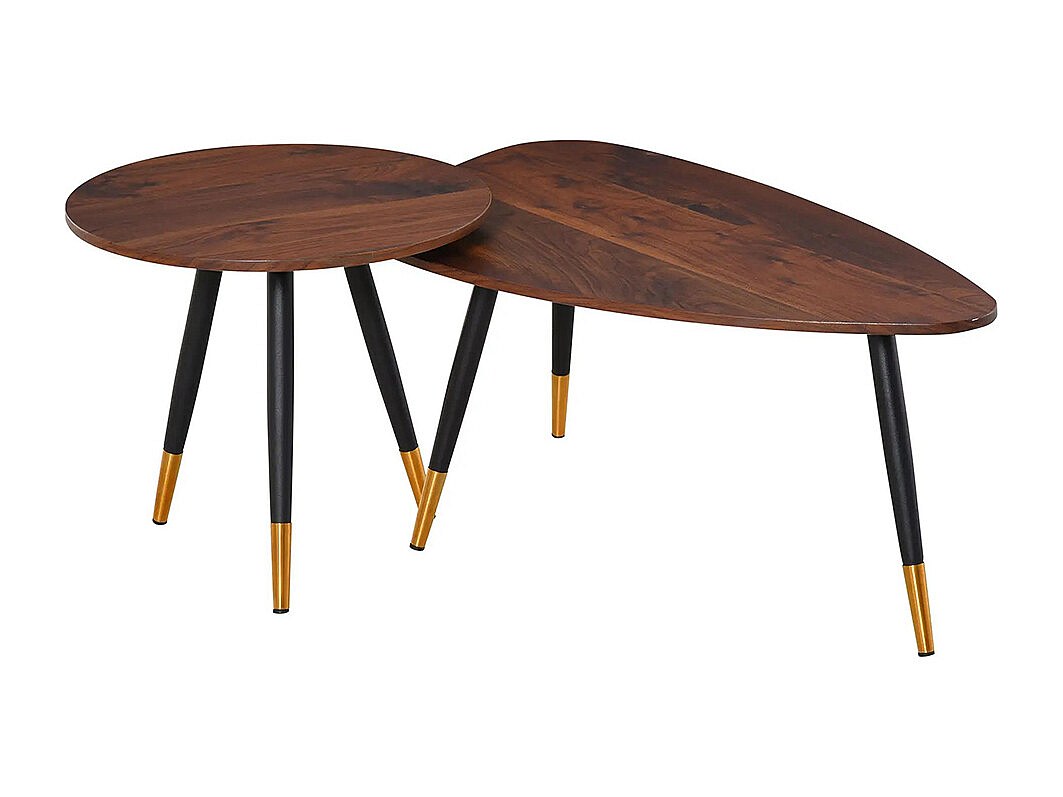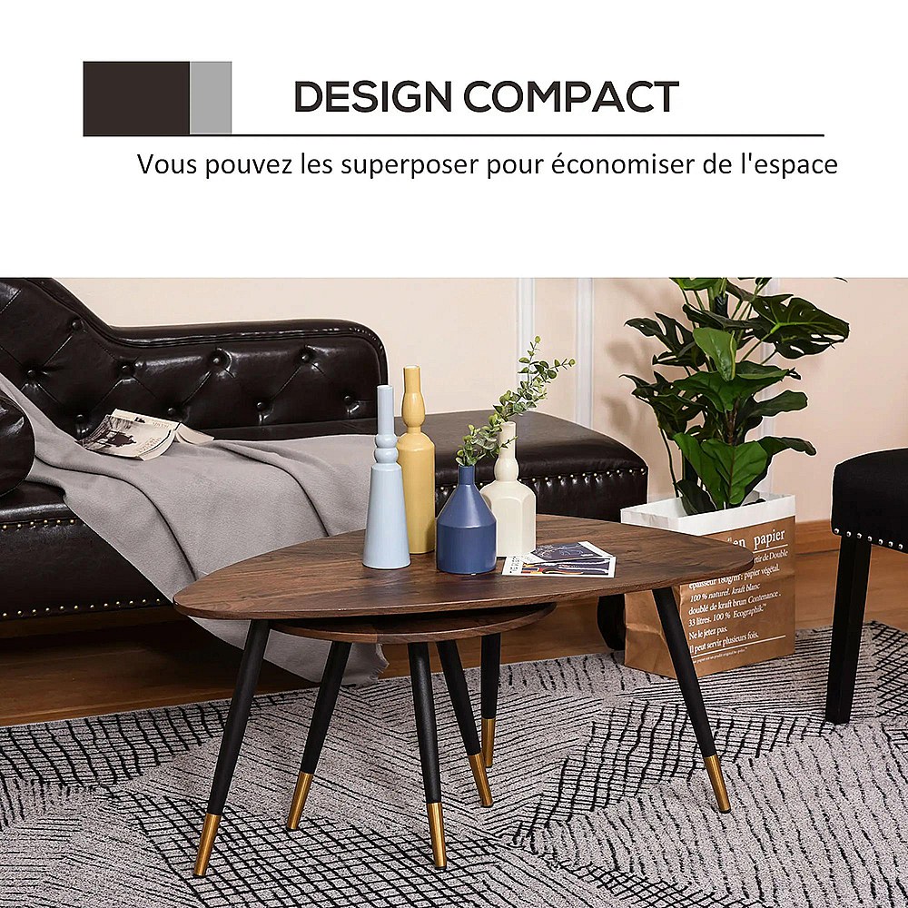 Lot de 2 Tables Basses gigognes Style Art déco Pieds effilés inclinés métal Noir extrémités doré Plateaux MDF Aspect Teck foncé