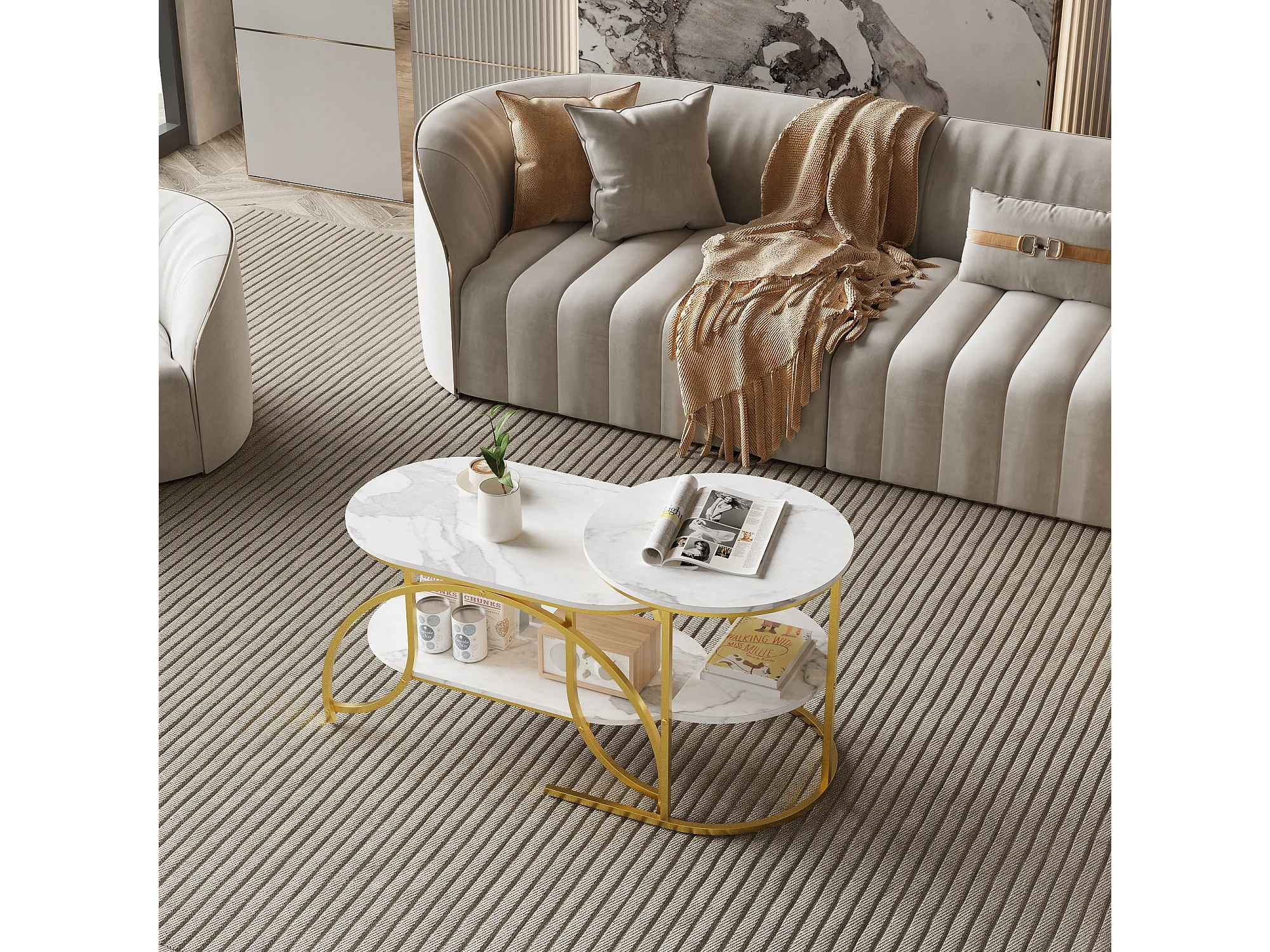 Lot de 2 Tables Basses gigognes, Table Basse Ronde en marbre, Tables d'appoint Ronde, Doré + Blanc