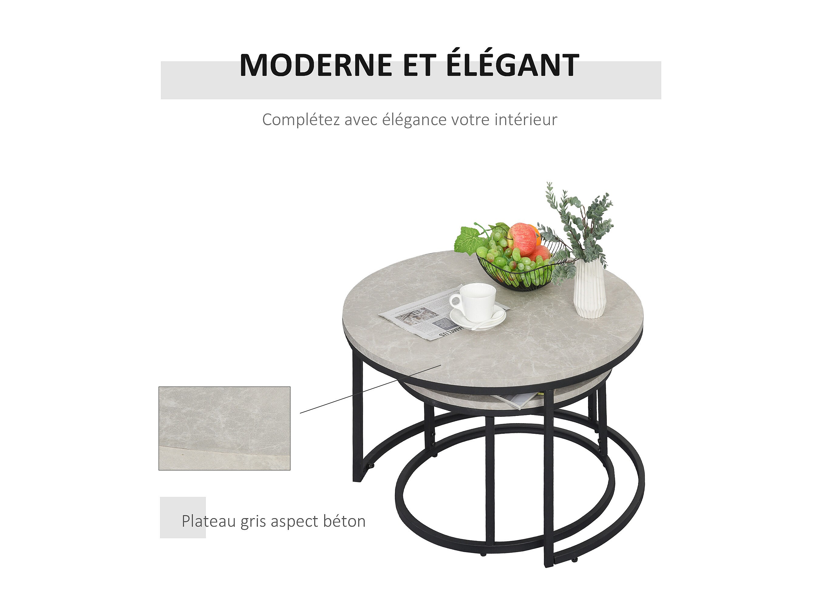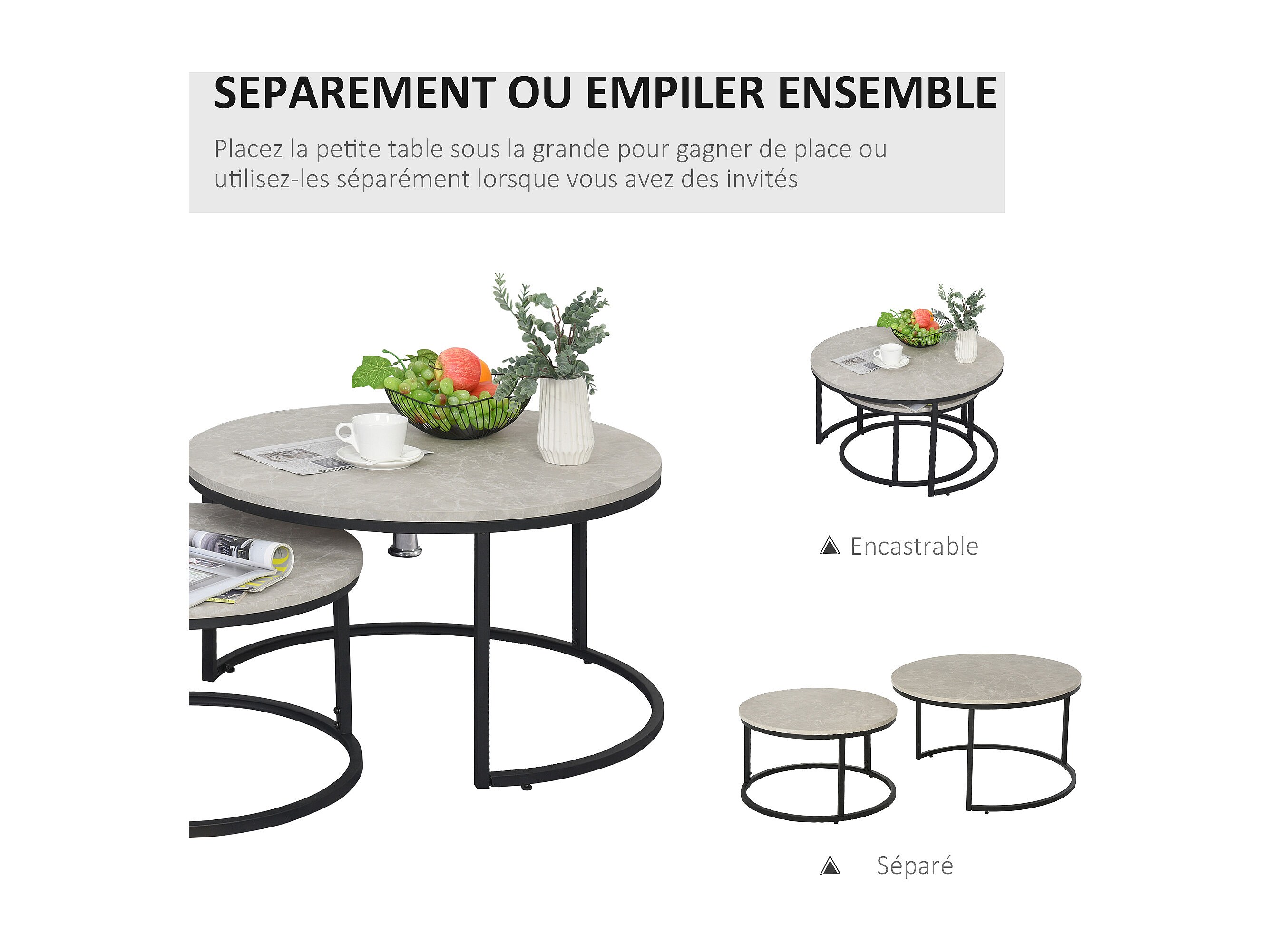 Lot de 2 tables basses rondes gigogne empilables piètement acier noir plateau aspect marbre gris