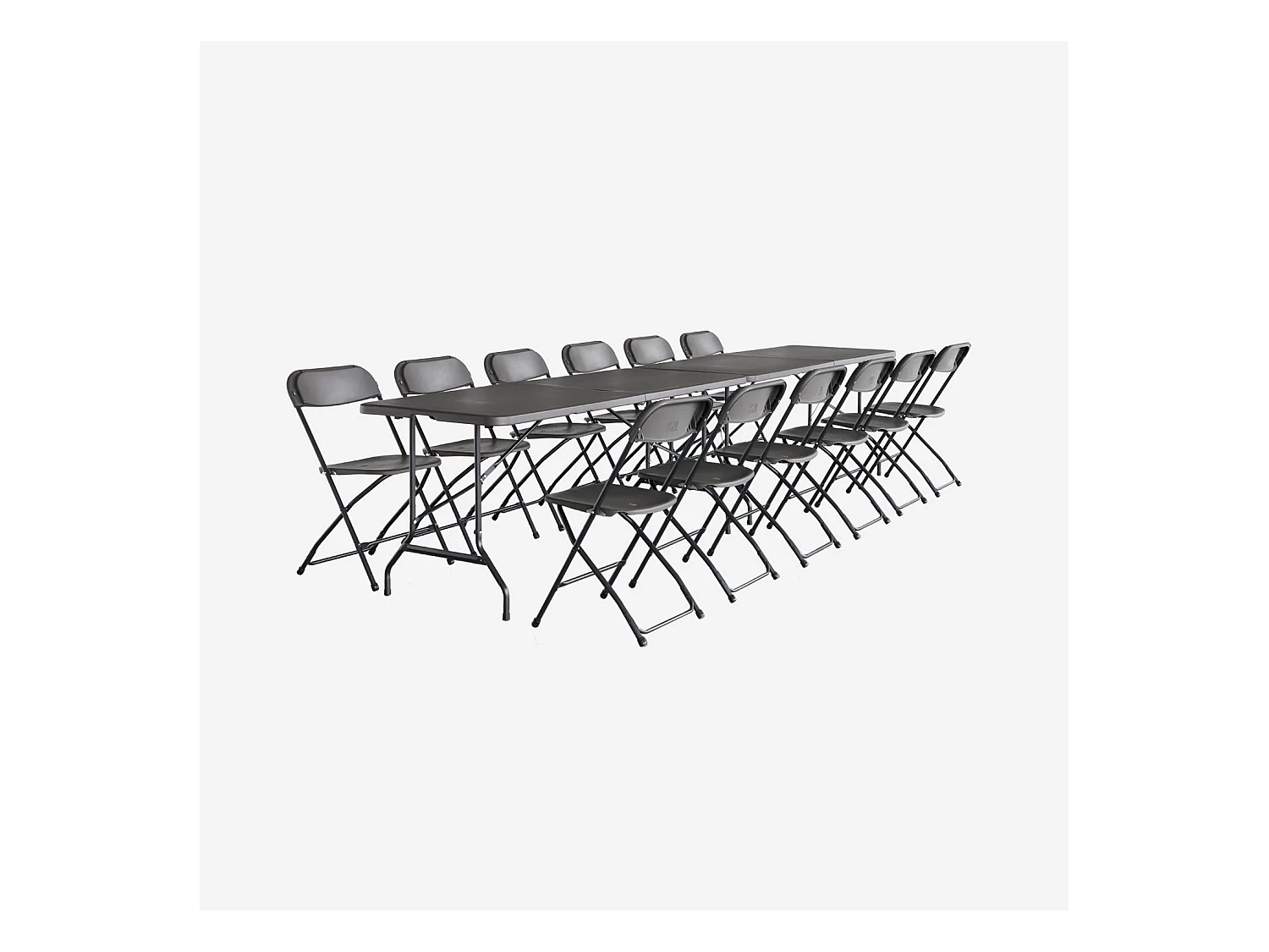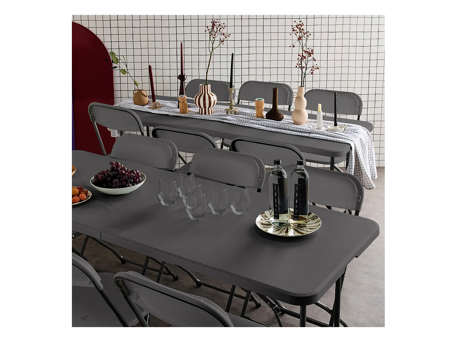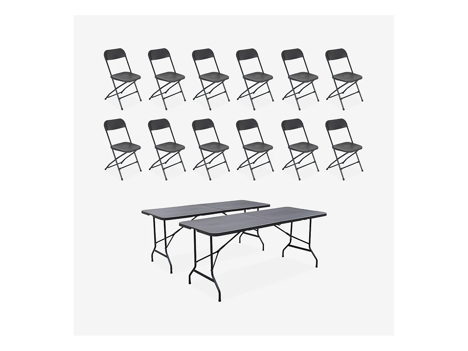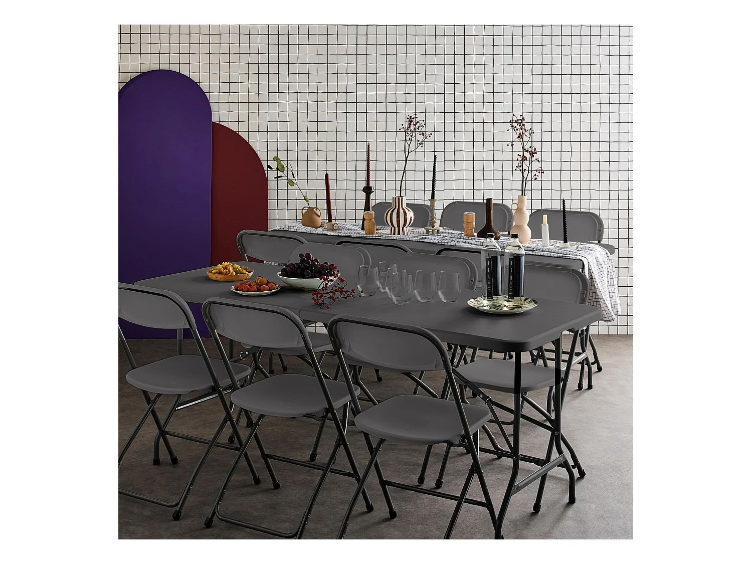 Lot de 2 tables de réception pliables en plastique gris 180cm + 12 chaises d'appoint. table de camping