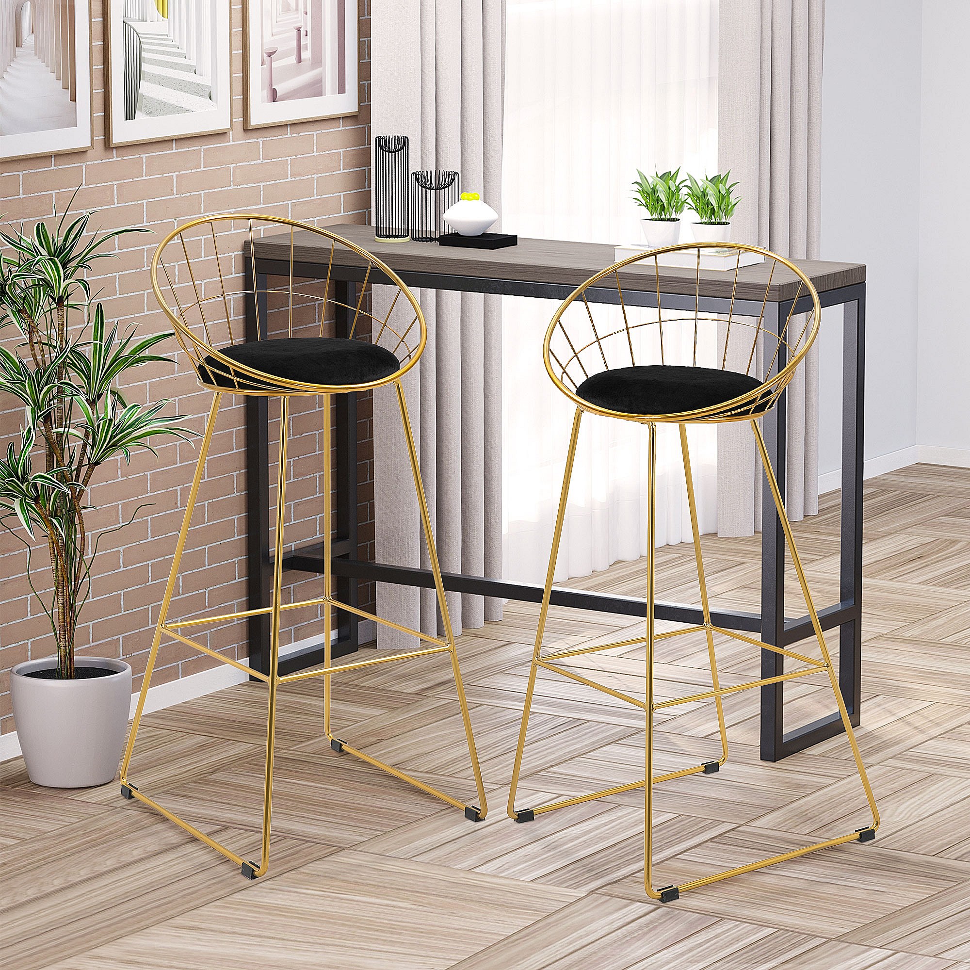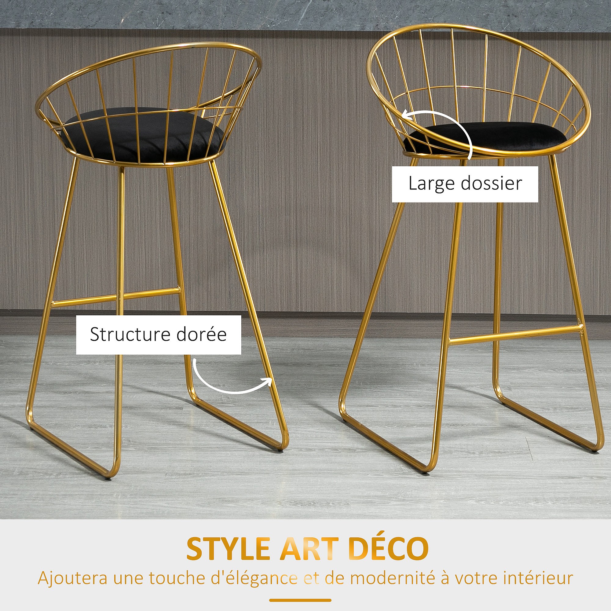 Lot de 2 tabourets de bar design avec repose-pied structure métal et coussin velours 52,5 x 47 x 97 cm noir et doré