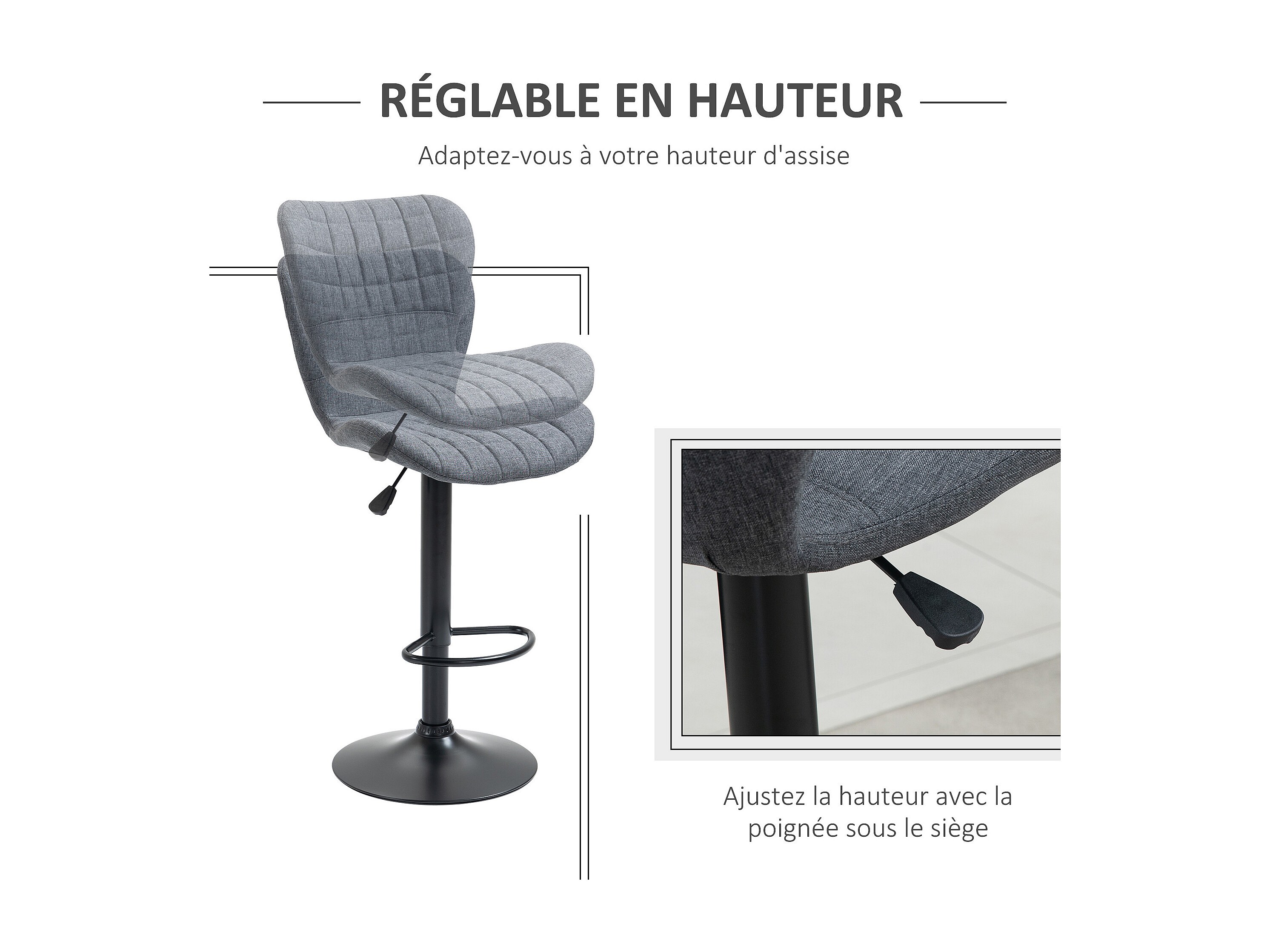 Lot de 2 tabourets de bar design néo-rétro réglable pivotant avec repose-pied métal noir lin gris