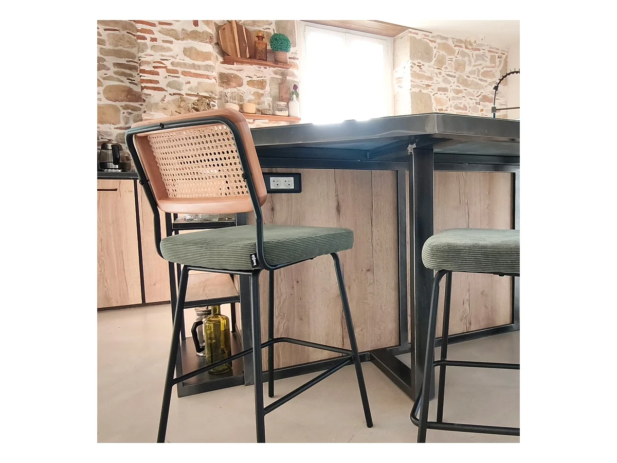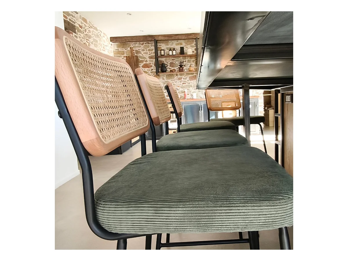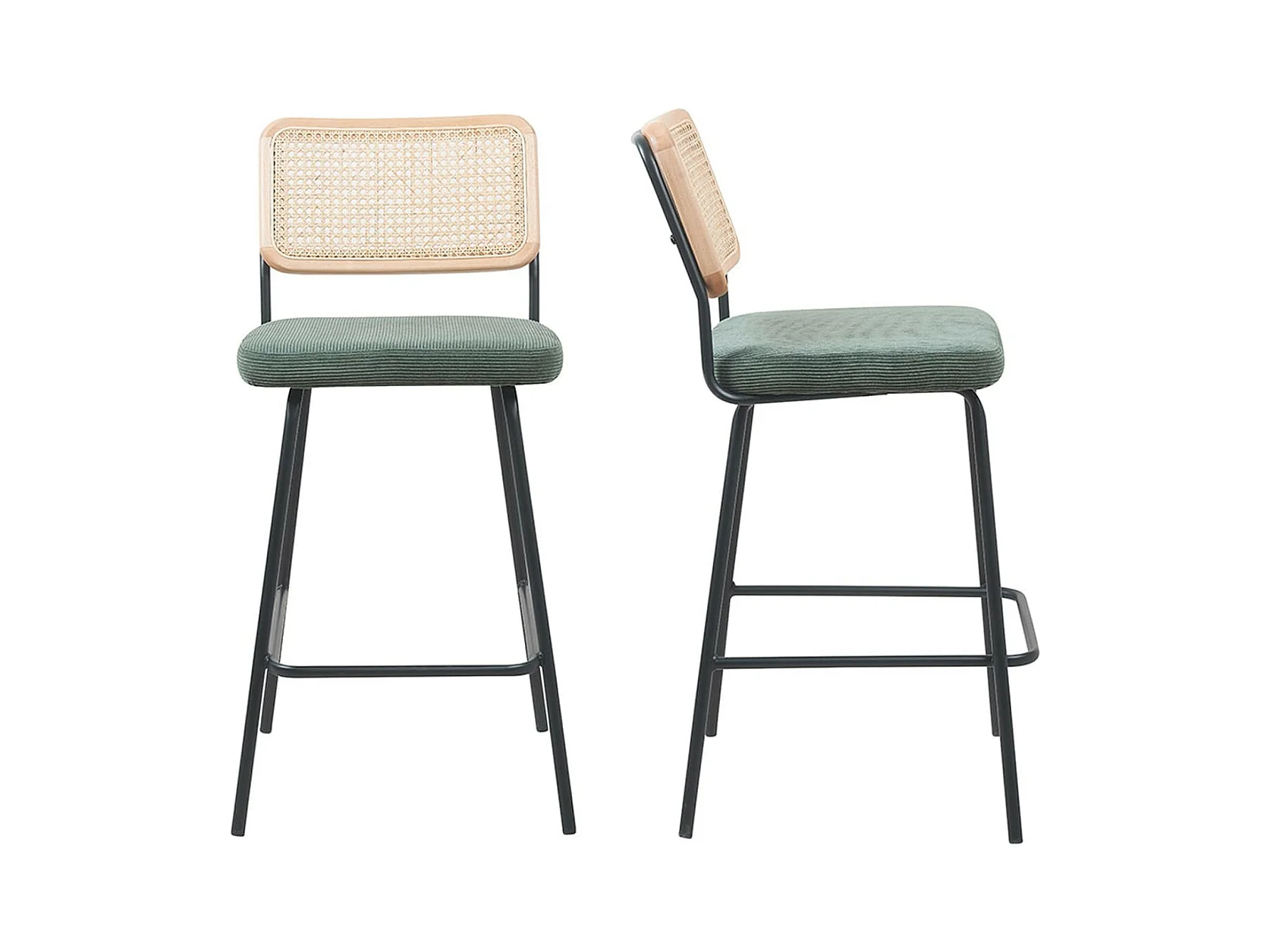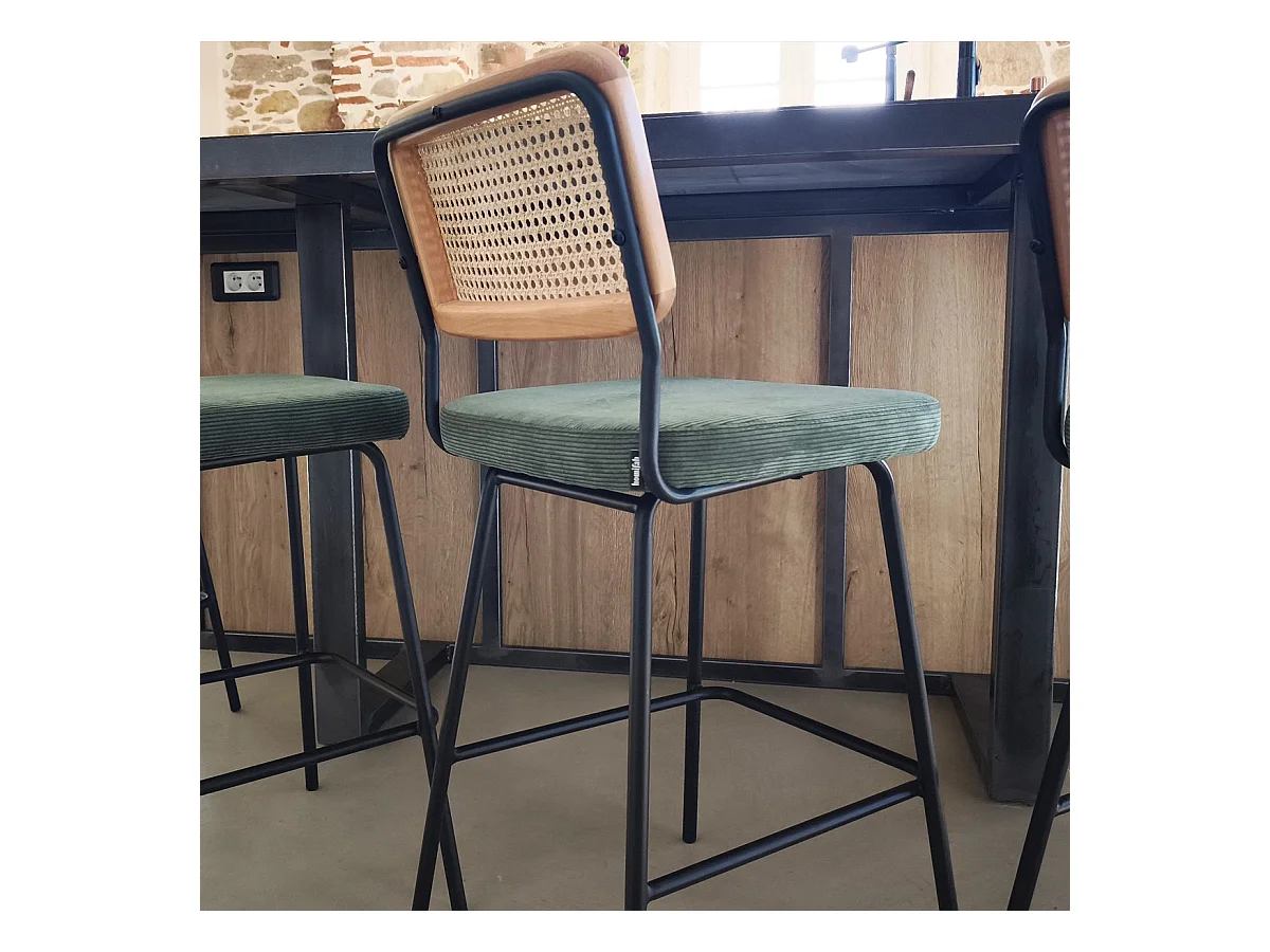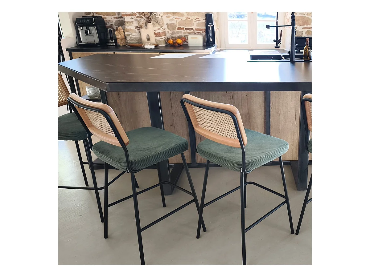 Lot de 2 chaises de bar en cannage et velours côtelé vert, piètement noir - Muse