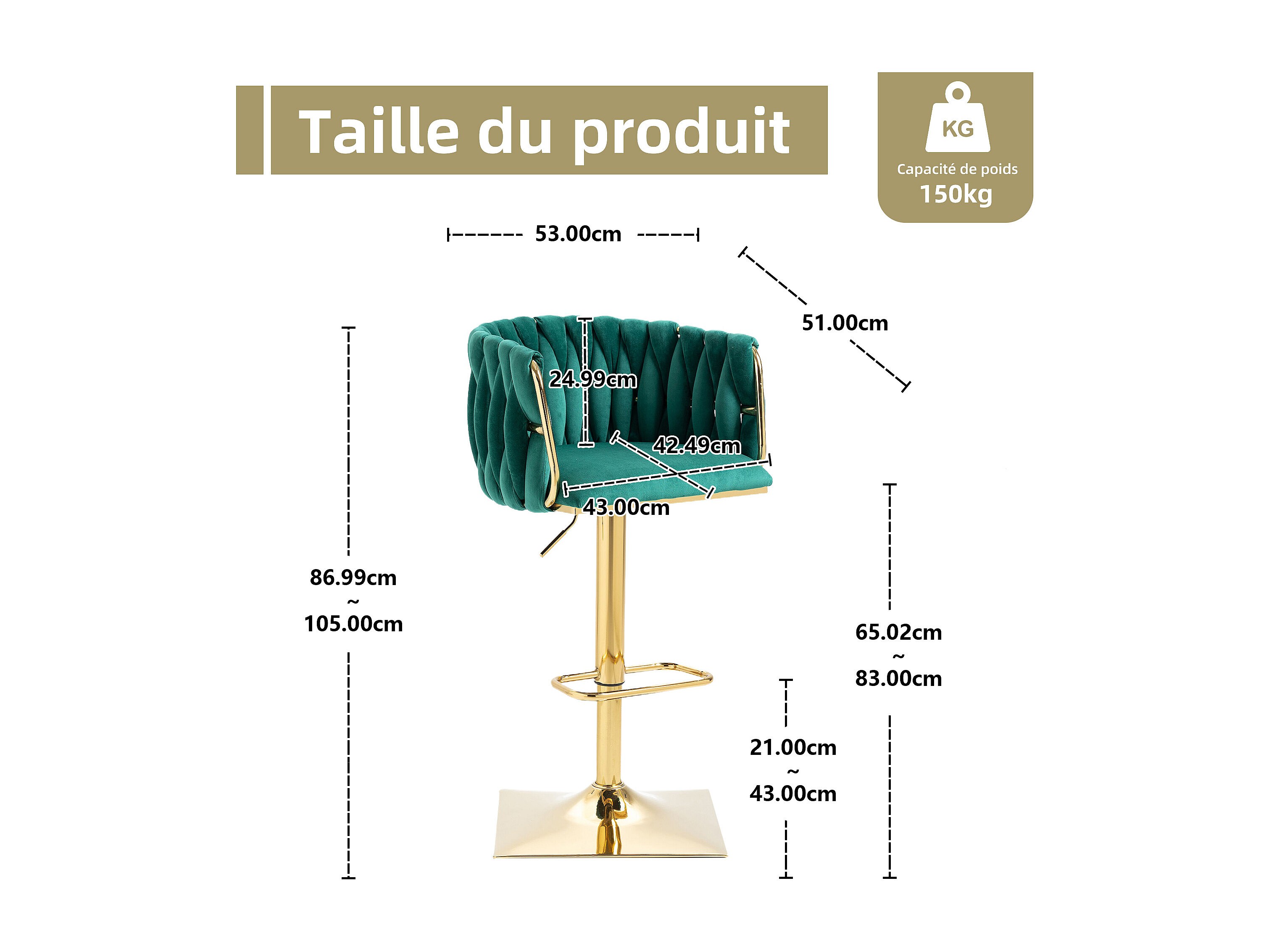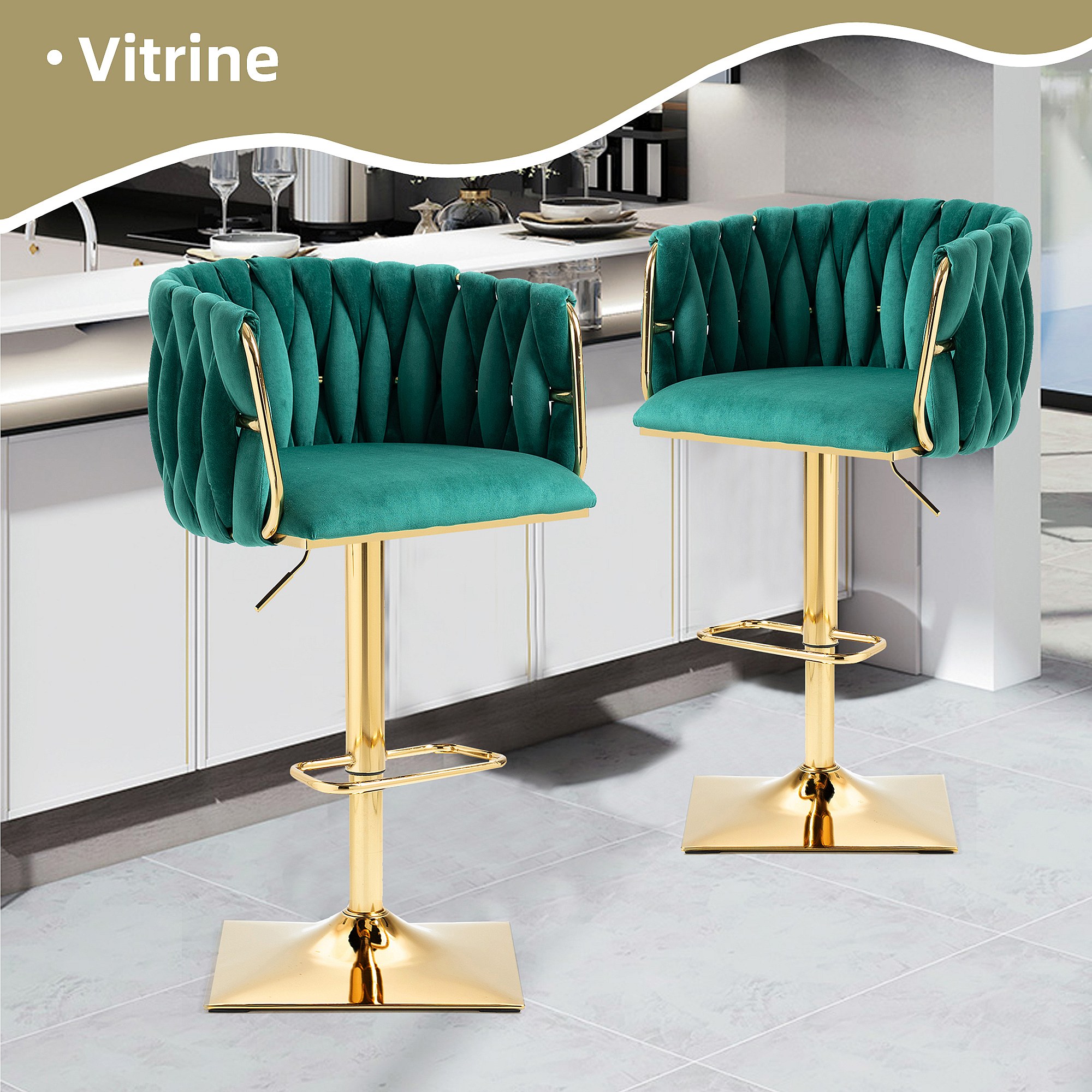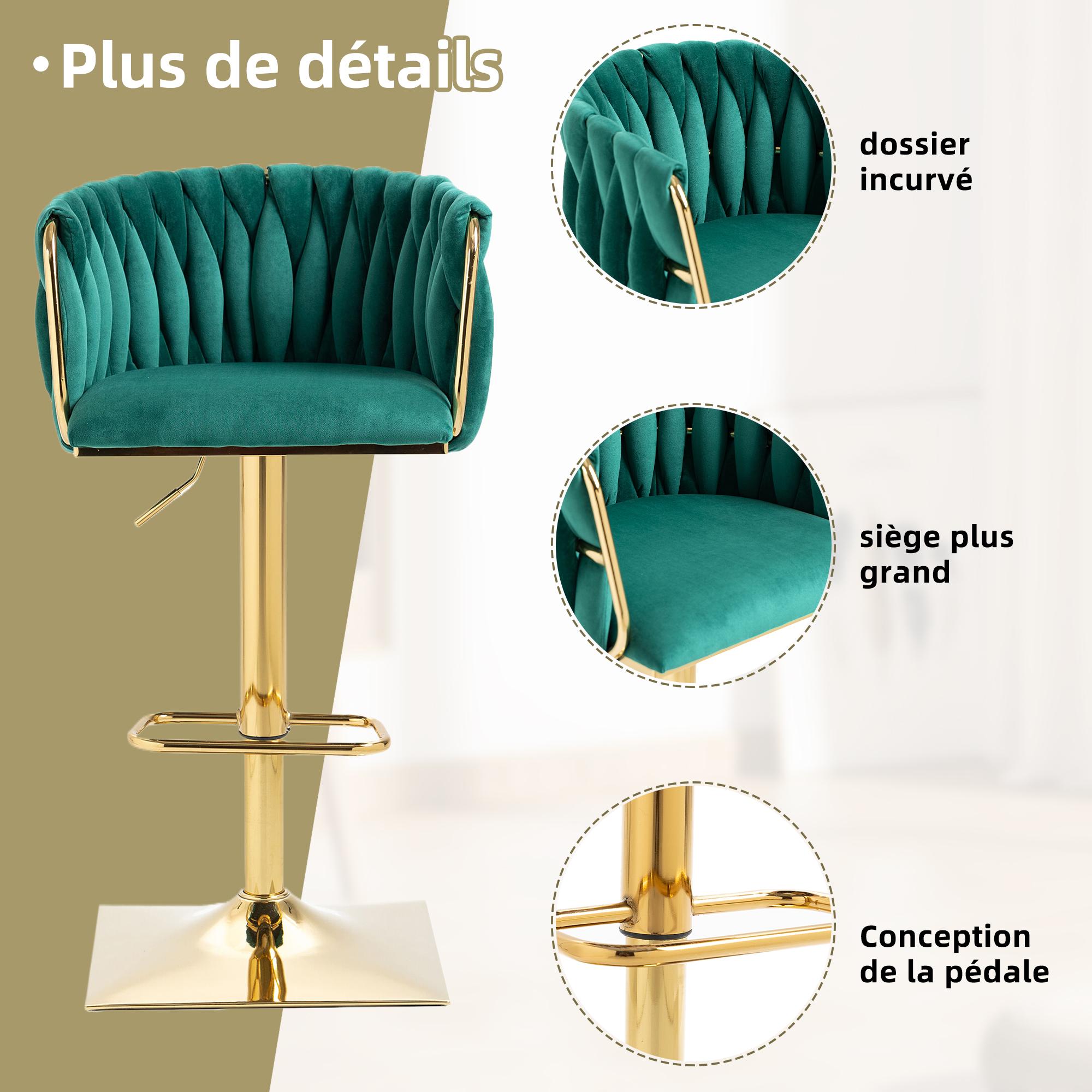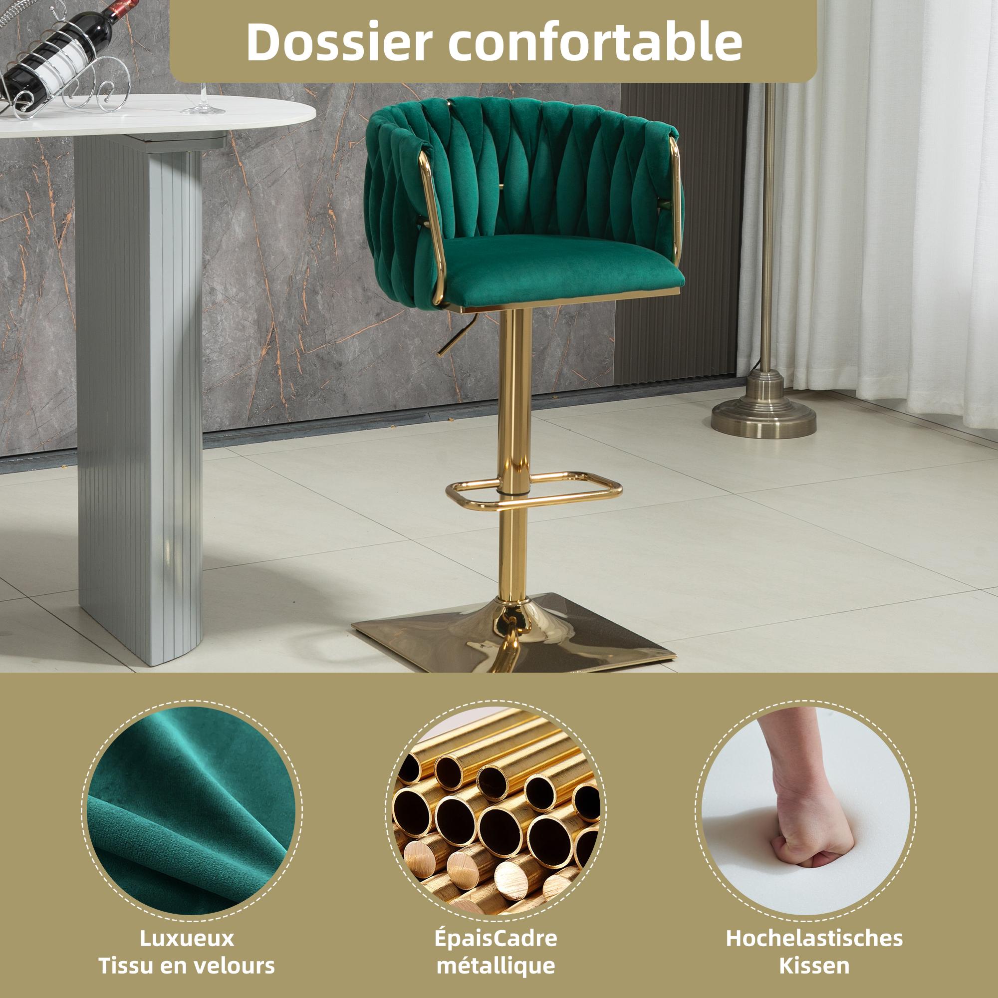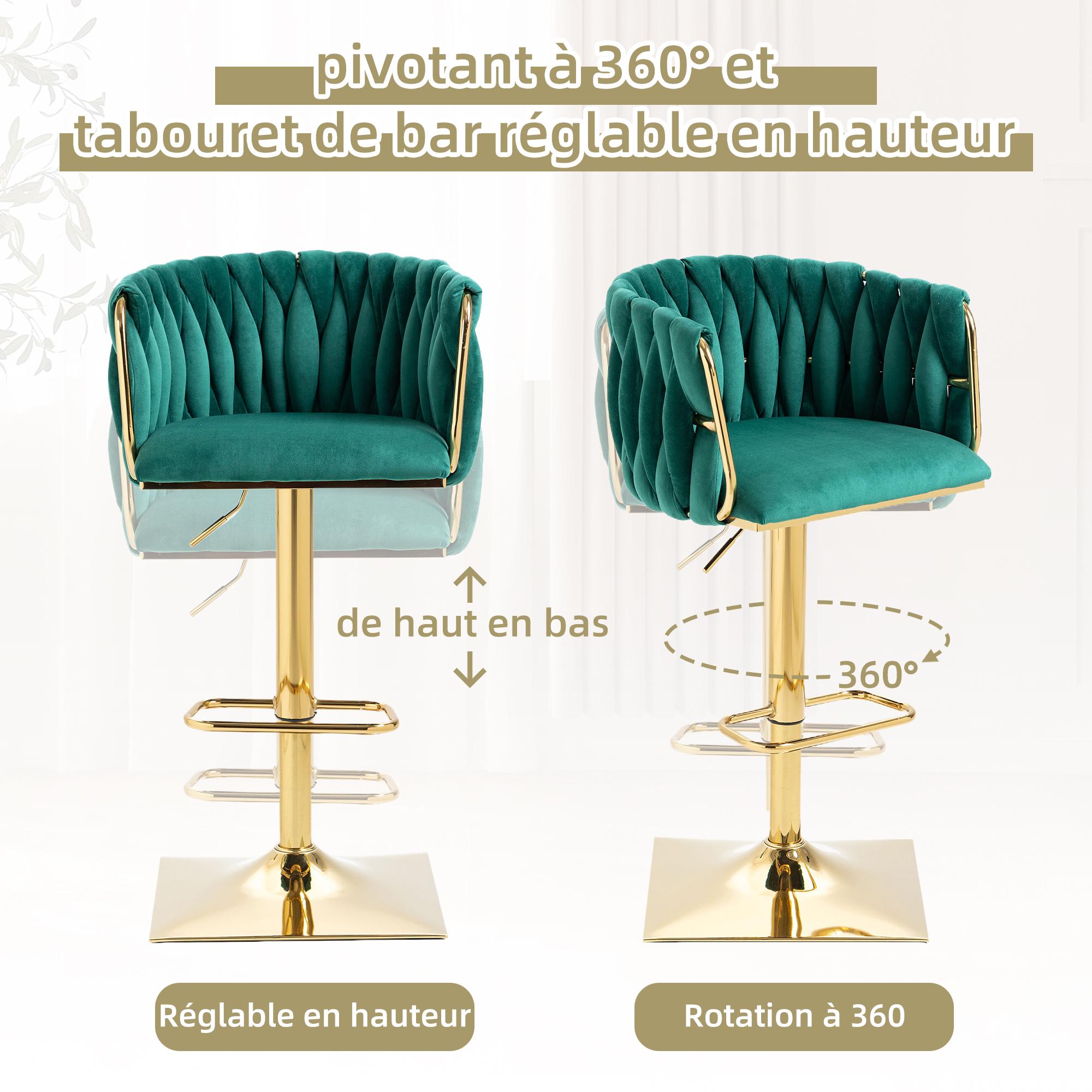 Lot de 2 Tabourets de Bar Tressés en Vert - Pieds en Métal Doré - Repose-Pieds - Hauteur Réglable - Rotation 360° - Idéal pour Cuisine, Salon ou Bar