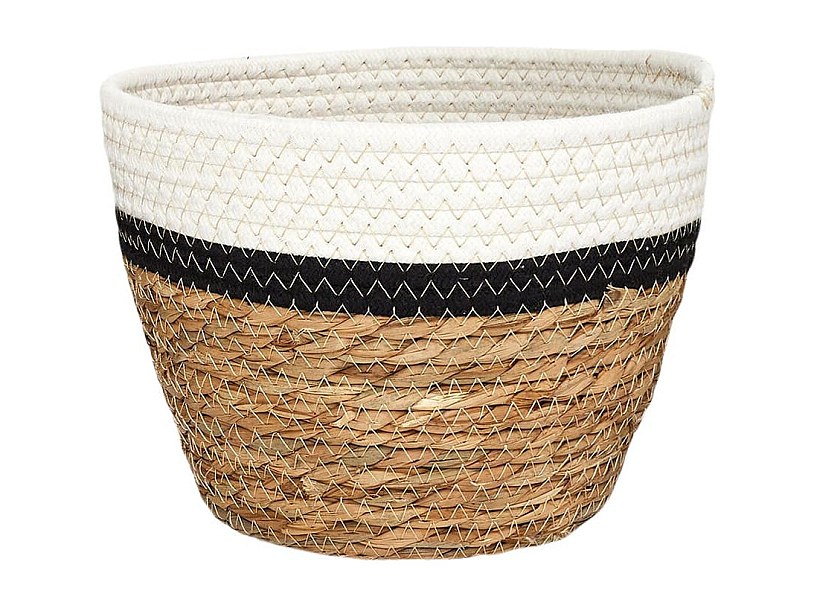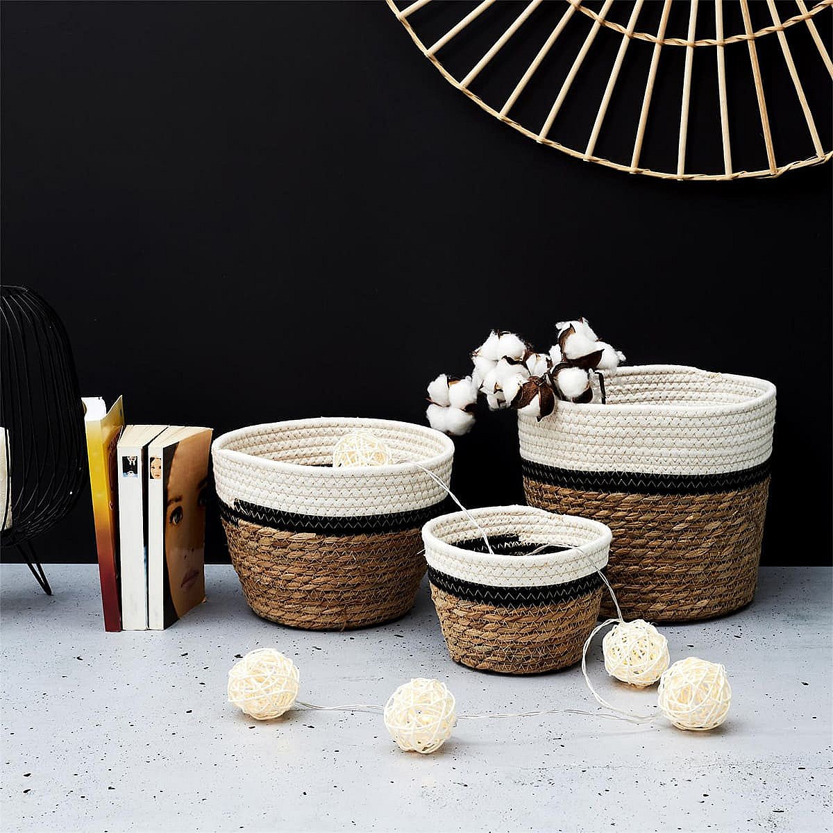 Lot de 3 Corbeilles Tressées en Jonc de Mer Naturel et Coton Noir et Blanc