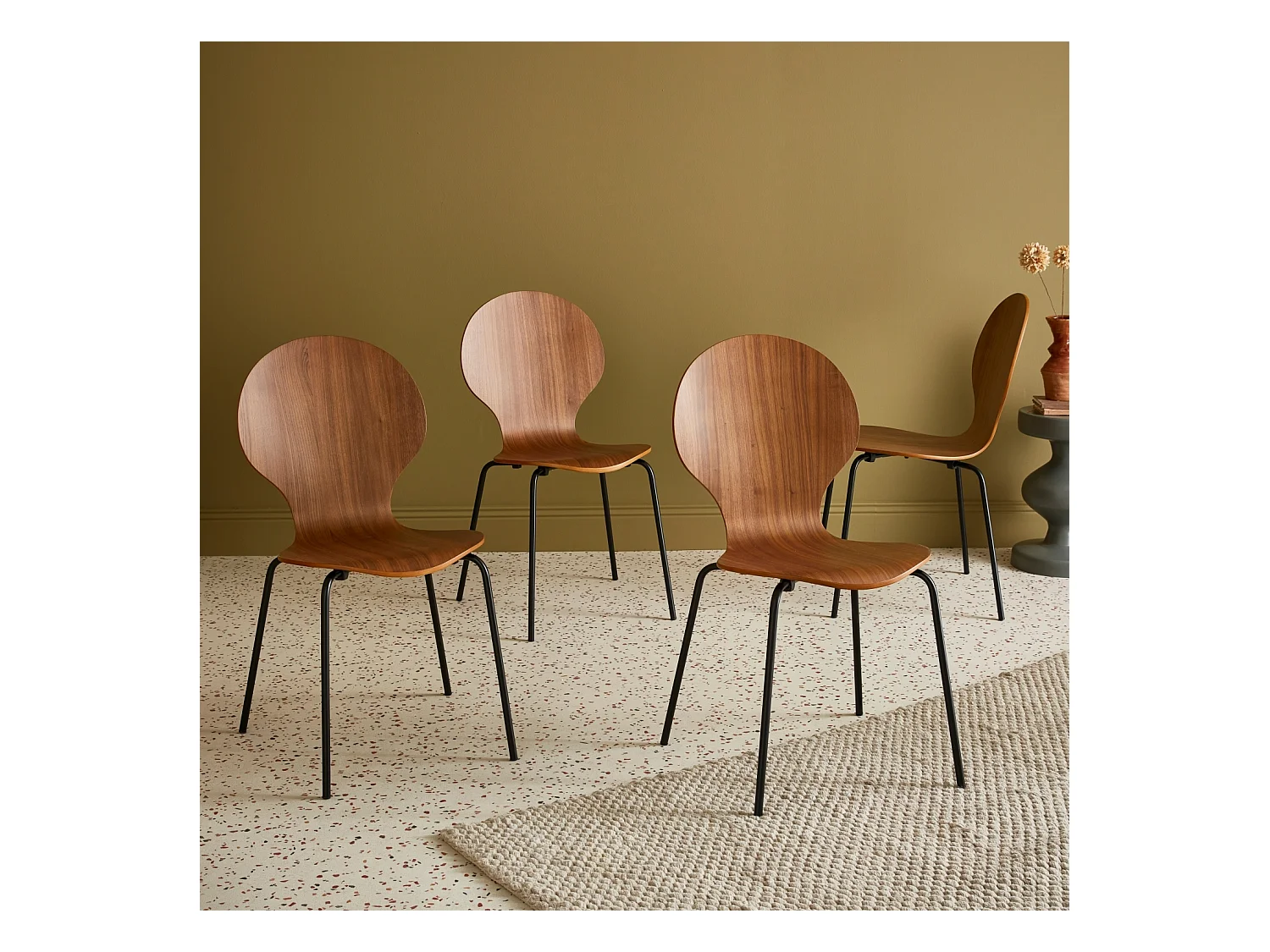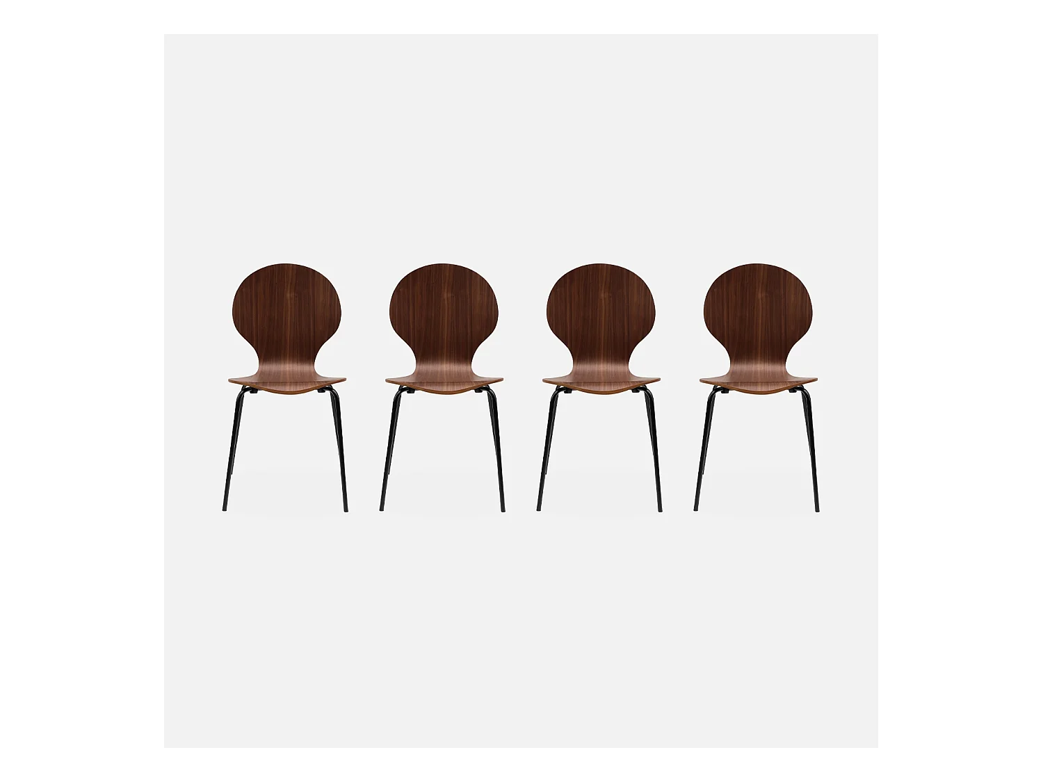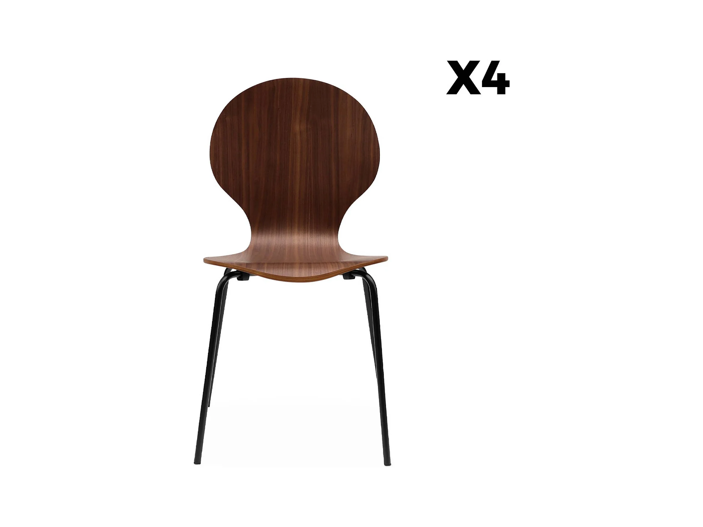 Lot de 4 chaises noyer. rétro empilables. bois d'hévéa et contreplaqué. pieds en acier. Naomi. L 43 x P 48 x H 87cm