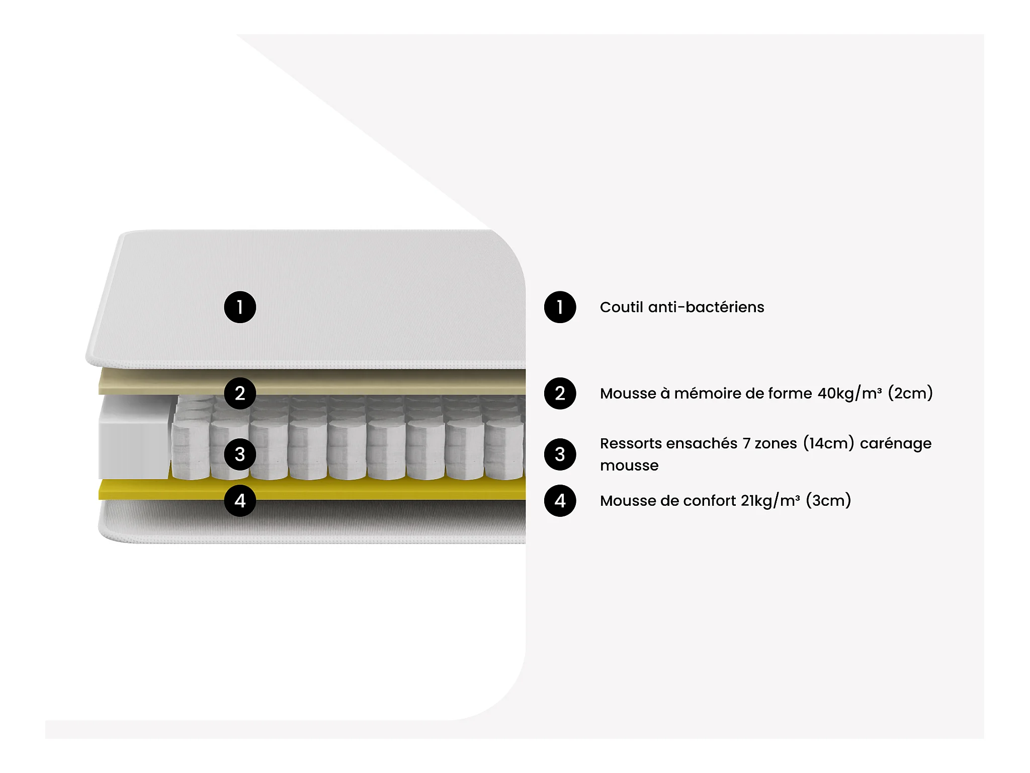 Ensemble 140 x 190 cm sommier coffre blanc + matelas ressorts ensachés 7 zones et mémoire de forme ép.22cm - LUREAN de YSMÉE