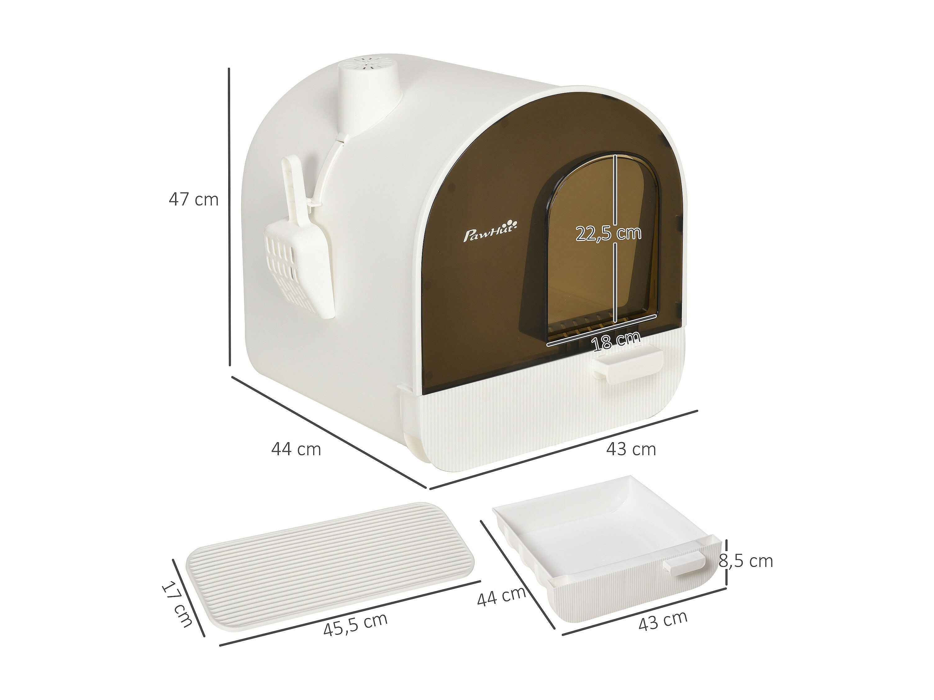 Maison de toilette bac à litière pour chat avec porte battante, pelle et filtre inclus dim. 43L x 44l x 47H cm PP blanc marron fumé