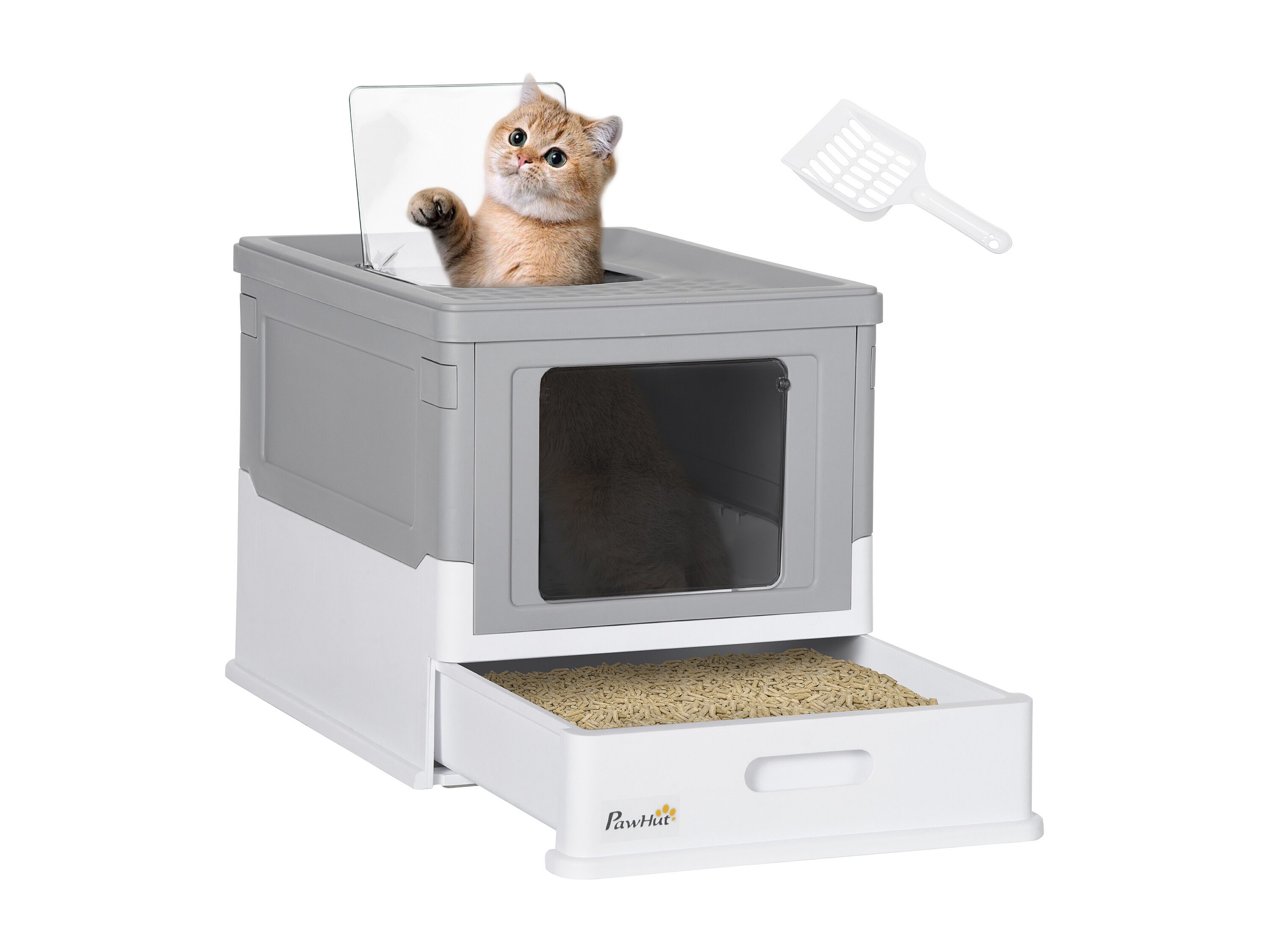 Maison de toilette pliable pour chat - tiroir à litière coulissant, porte battante et trappe transparente, pelle - blanc gris