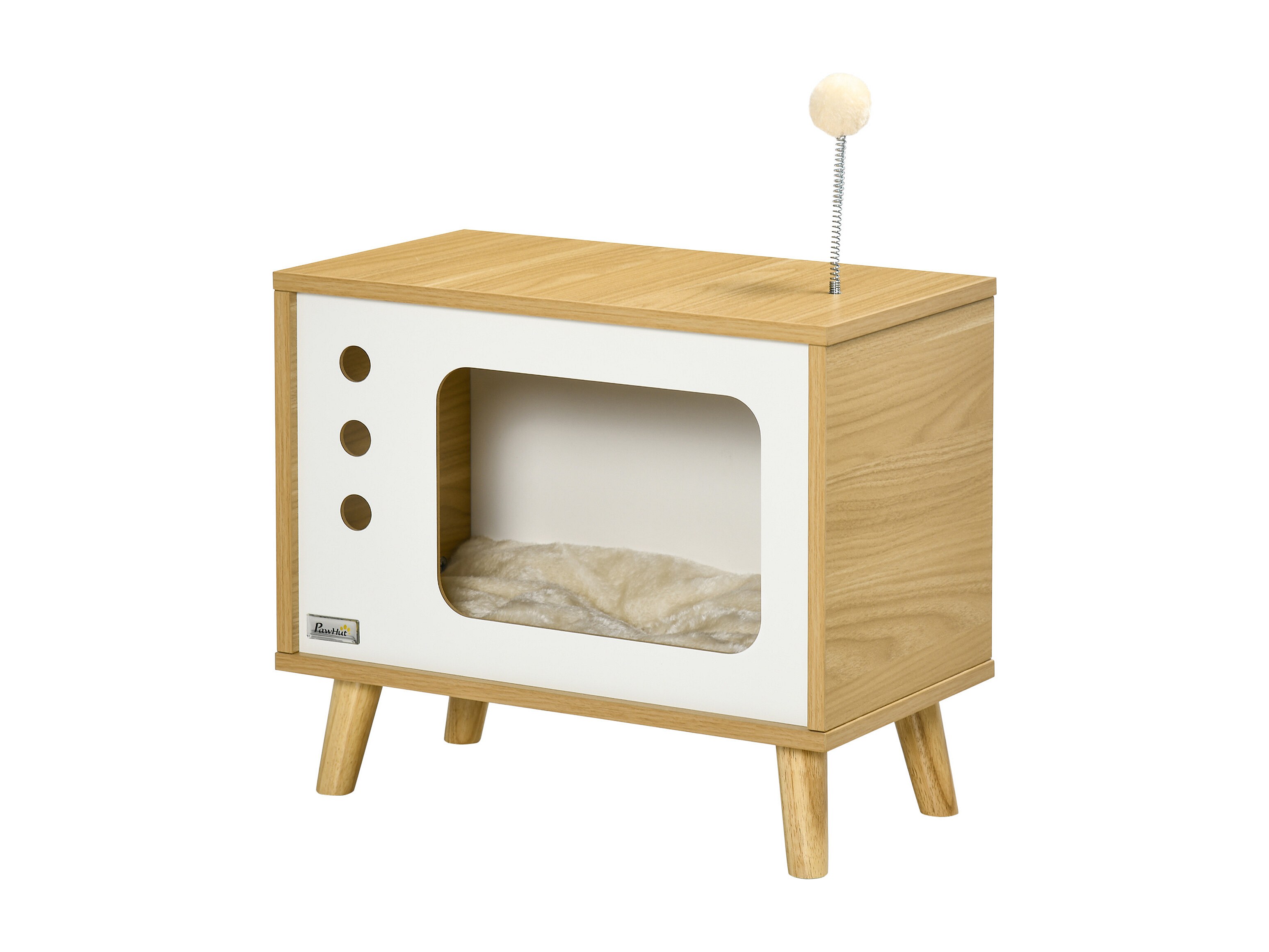 Maison pour chat design poste de télévision - niche chat panier chat - 2 coussins amovibles, boule à ressort - panneaux aspect bois clair blanc