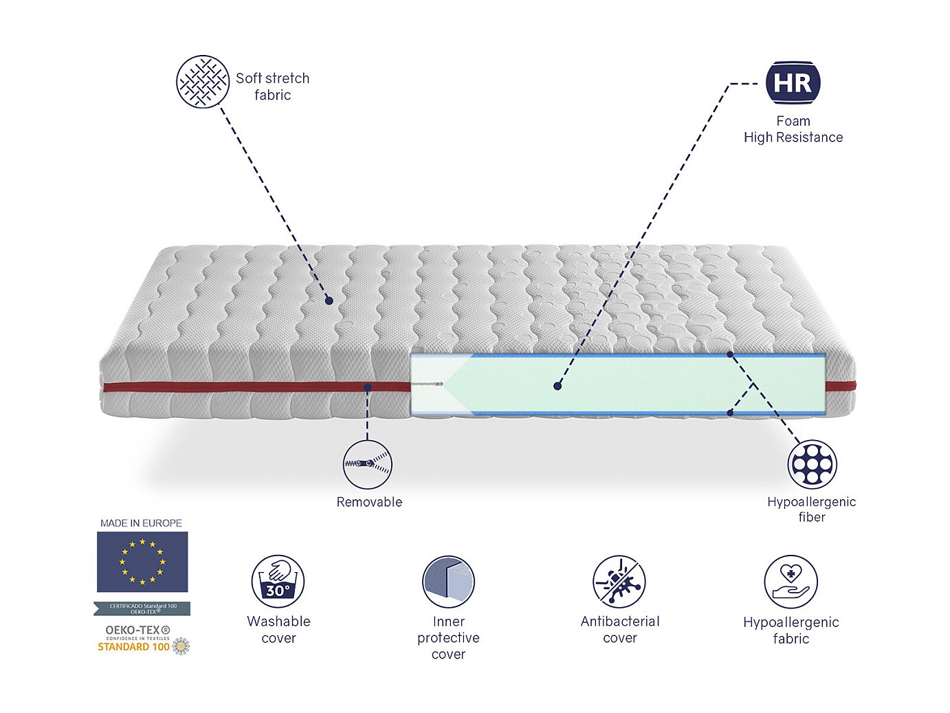 Matelas 90X140 LIT ENFANTS Épaisseur 18 CM ZAFIR - Mousse, Antiacarien et Déhoussable, idéal pour les lits gigognes et lit cabane